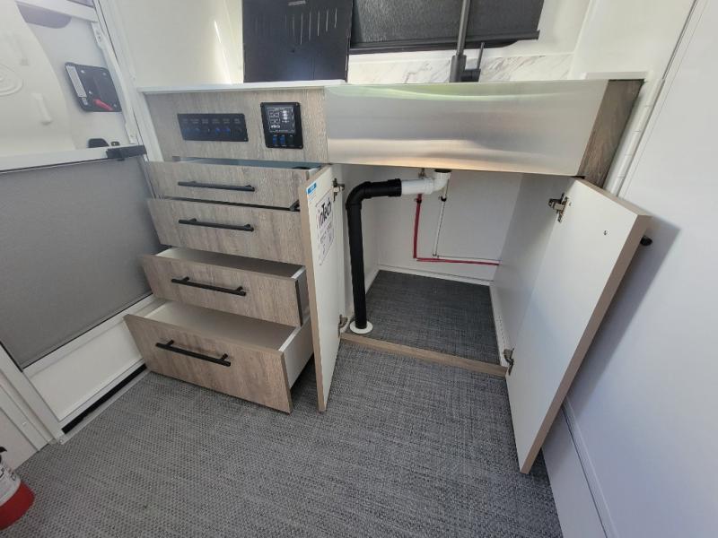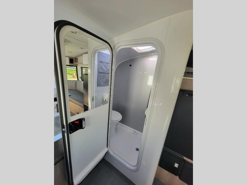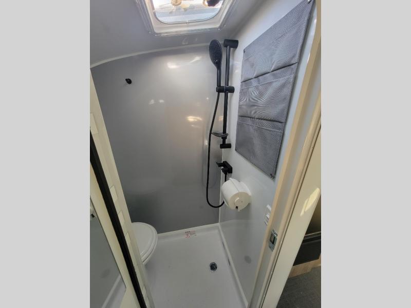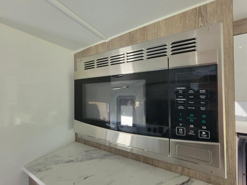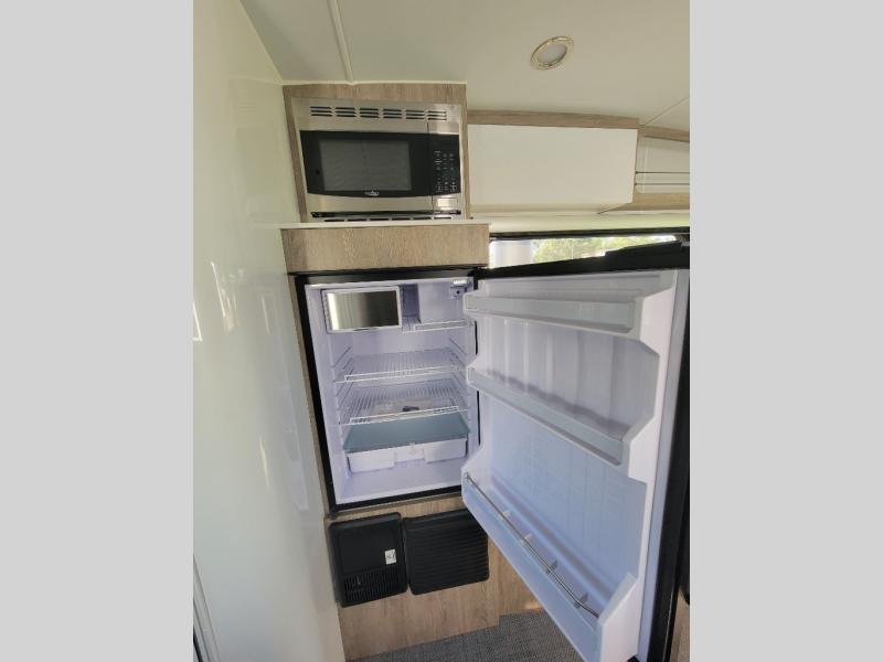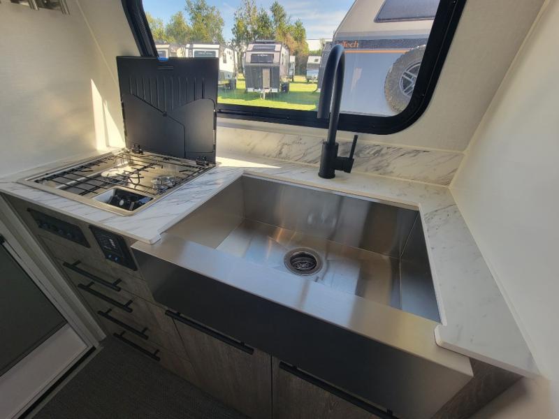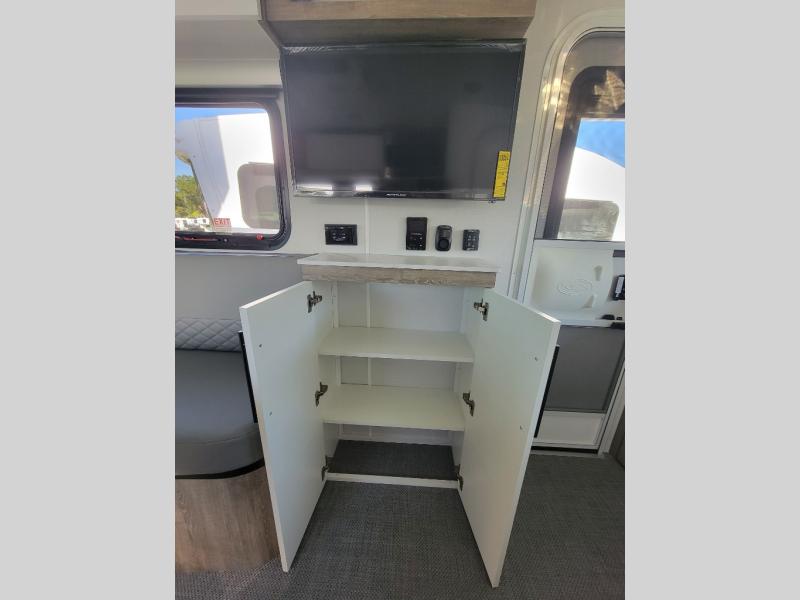 With any Sol travel trailer by inTech RV you will find strong, durable construction consisting of lightweight aluminum that is easier to tow and resists rust, water, and dents. The Tilt-Forward Design creates more space inside so you can stretch out, and the panoramic windshield gives a great view of the mountains, ocean, or forest! The elegant interior features tinted windows with shades, Infinity woven flooring, and a stainless steel cooktop and microwave. You will stay comfortable year around since these models include a 15K BTU A/C and a 16K BTU furnace.