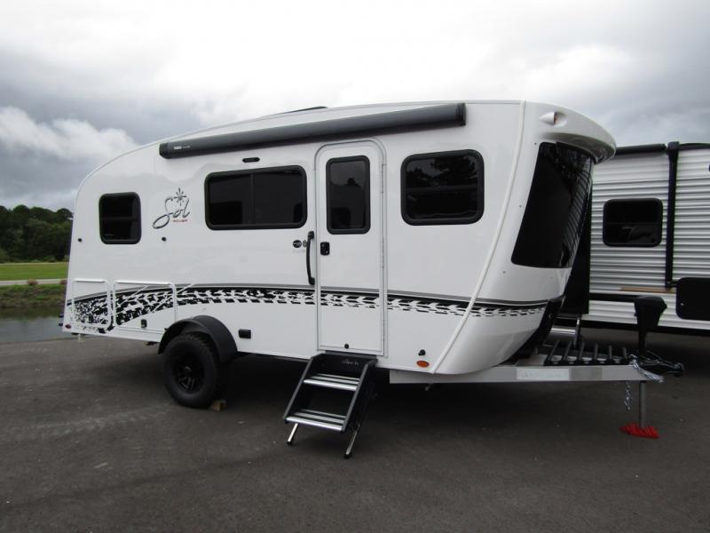 With any Sol travel trailer by inTech RV you will find strong, durable construction consisting of lightweight aluminum that is easier to tow and resists rust, water, and dents. The Tilt-Forward Design creates more space inside so you can stretch out, and the panoramic windshield gives a great view of the mountains, ocean, or forest! The elegant interior features tinted windows with shades, Infinity woven flooring, and a stainless steel cooktop and microwave. You will stay comfortable year around since these models include a 15K BTU A/C and a 16K BTU furnace. The optional Rover Package can also be added that features rugged decals, off-road tires with a 3" lift, two different color choices to choose from, plus more!