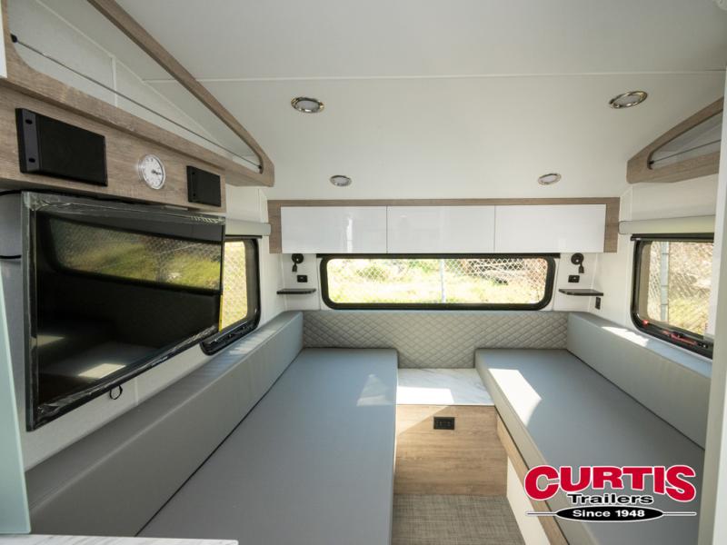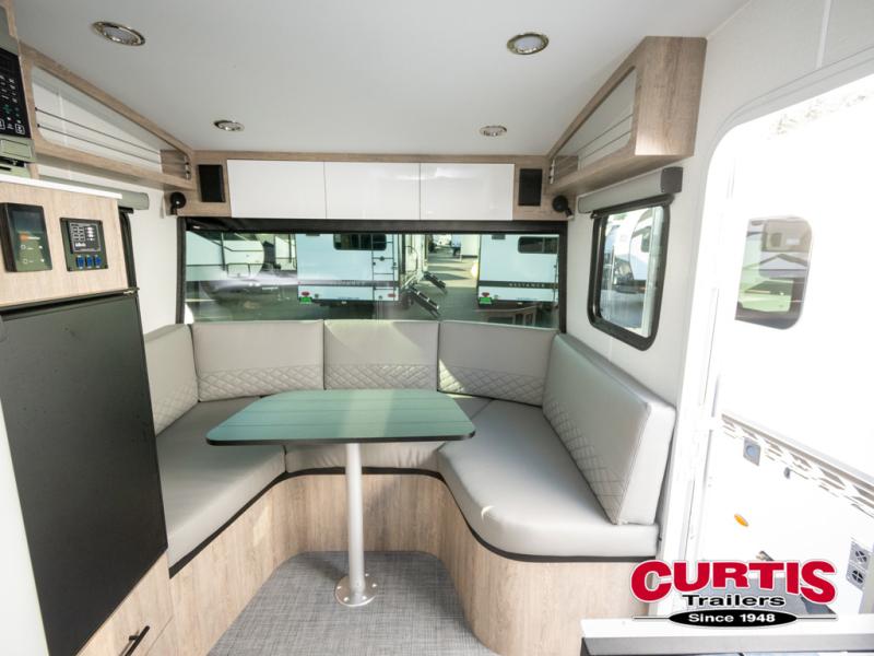 This travel trailer is ready to hit the great outdoors whenever you are! You and your loved one will have a front convertible U-shaped dinette to enjoy meals at and sleep on at night. And the rear twin beds include a filler if you want to convert them into one king-size bed In the morning. You can also prepare eggs and bacon on the two burner cooktop before heading out for the day. If you've chosen the optional 10' awning, you may not wander off too far from your trailer. This model also includes a wet bath with a porcelain toilet and a roof vent to eliminate any unwanted steam. This model has a dry weight that ranges from 3,540-3,970 lbs., a tongue weight between 540-575 lbs., and a carrying capacity between 820-1210 lbs.