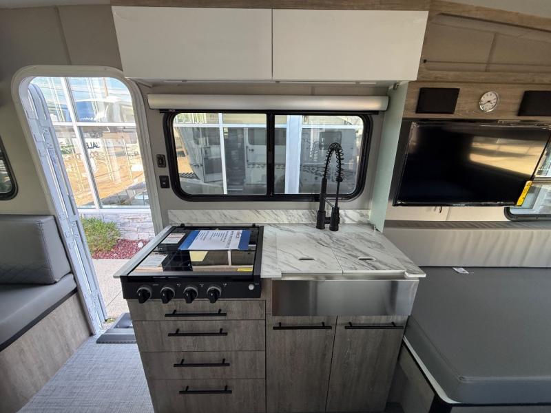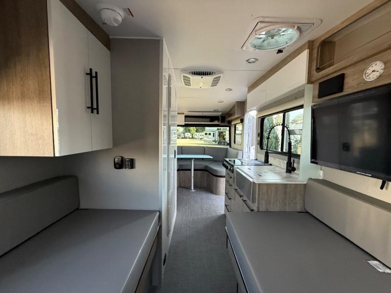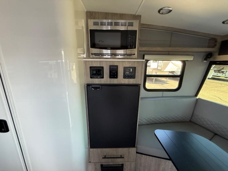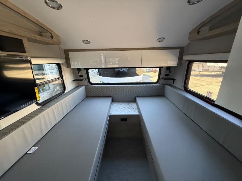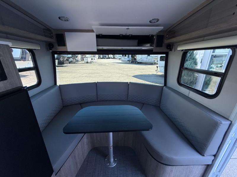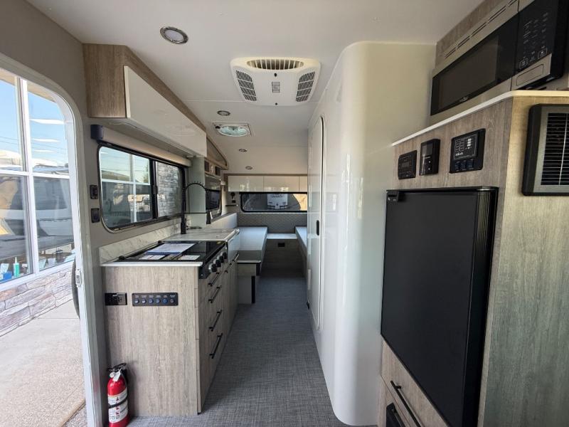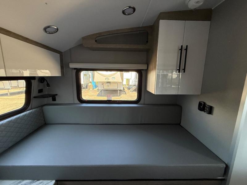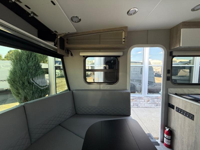 With any Sol travel trailer by inTech RV you will find strong, durable construction consisting of lightweight aluminum that is easier to tow and resists rust, water, and dents. The Tilt-Forward Design creates more space inside so you can stretch out, and the panoramic windshield gives a great view of the mountains, ocean, or forest! The elegant interior features tinted windows with shades, Infinity woven flooring, and a stainless steel cooktop and microwave. You will stay comfortable year around since these models include a 15K BTU A/C and a 16K BTU furnace.
