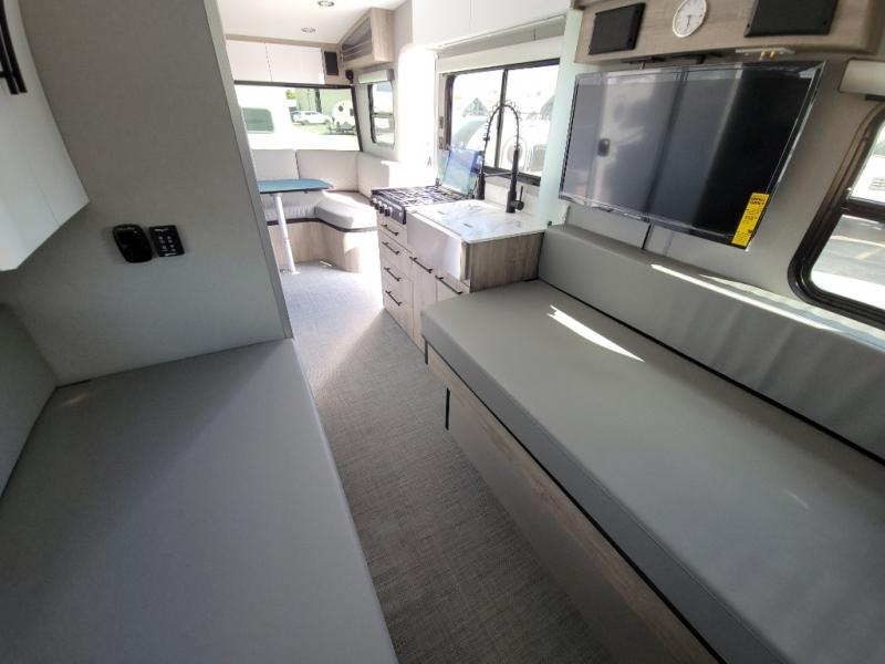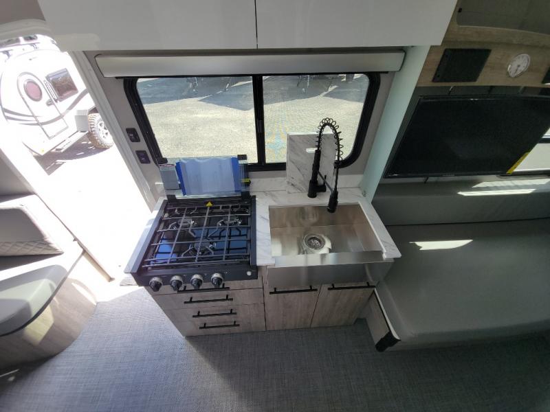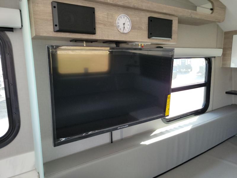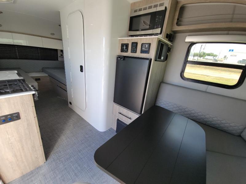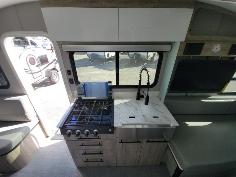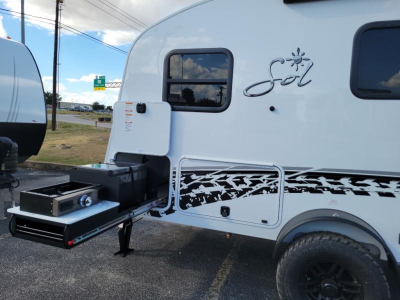 With any Sol travel trailer by inTech RV you will find strong, durable construction consisting of lightweight aluminum that is easier to tow and resists rust, water, and dents. The Tilt-Forward Design creates more space inside so you can stretch out, and the panoramic windshield gives a great view of the mountains, ocean, or forest! The elegant interior features tinted windows with shades, Infinity woven flooring, and a stainless steel cooktop and microwave. You will stay comfortable year around since these models include a 15K BTU A/C and a 16K BTU furnace.