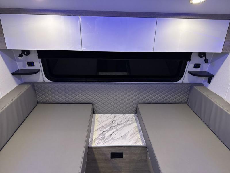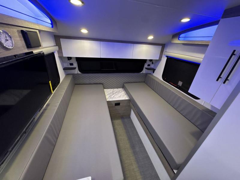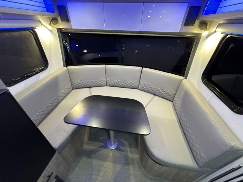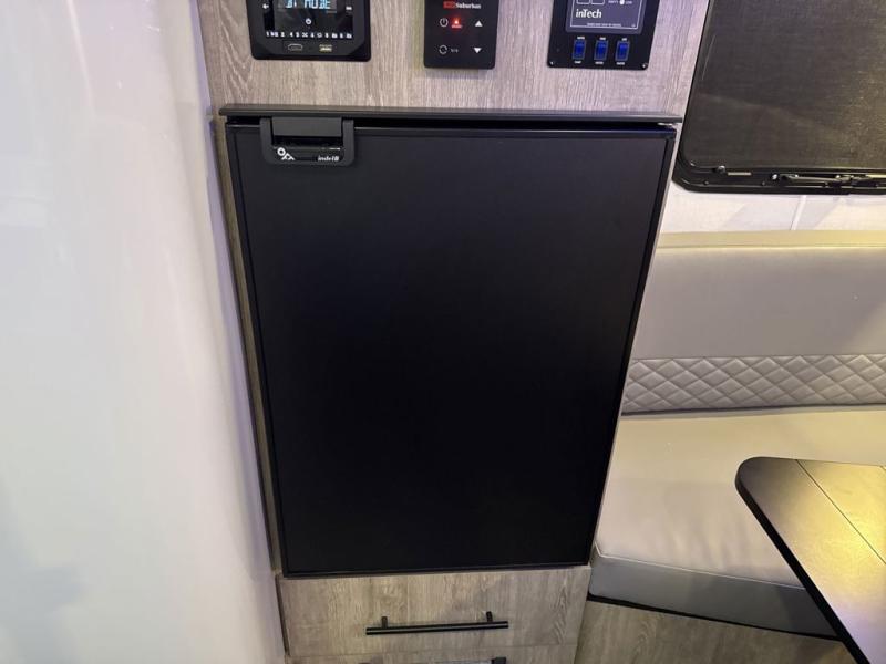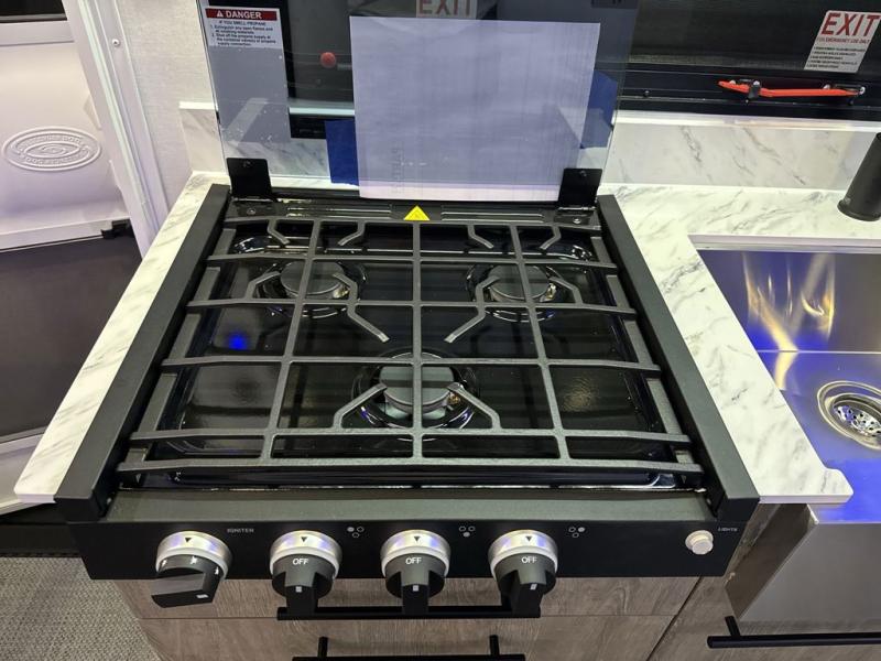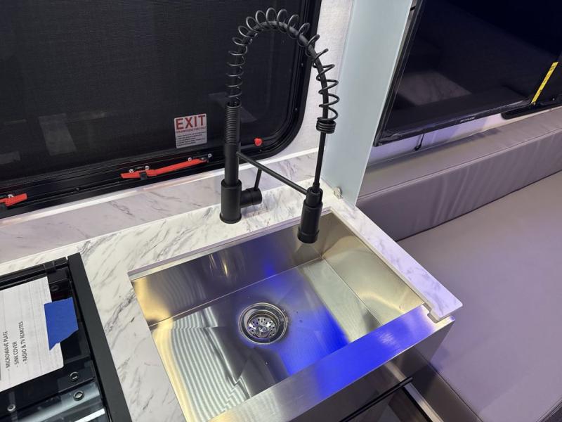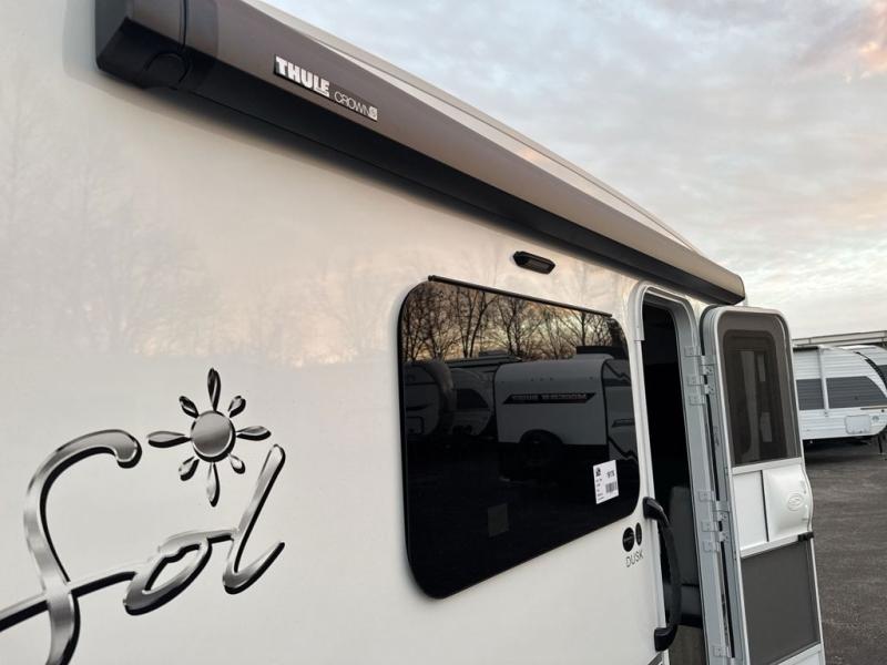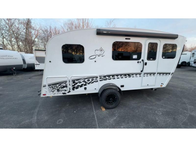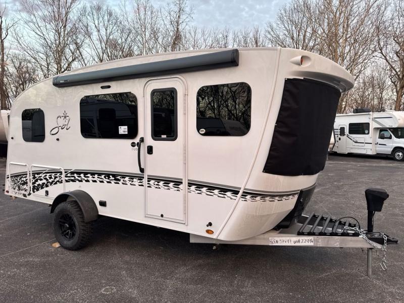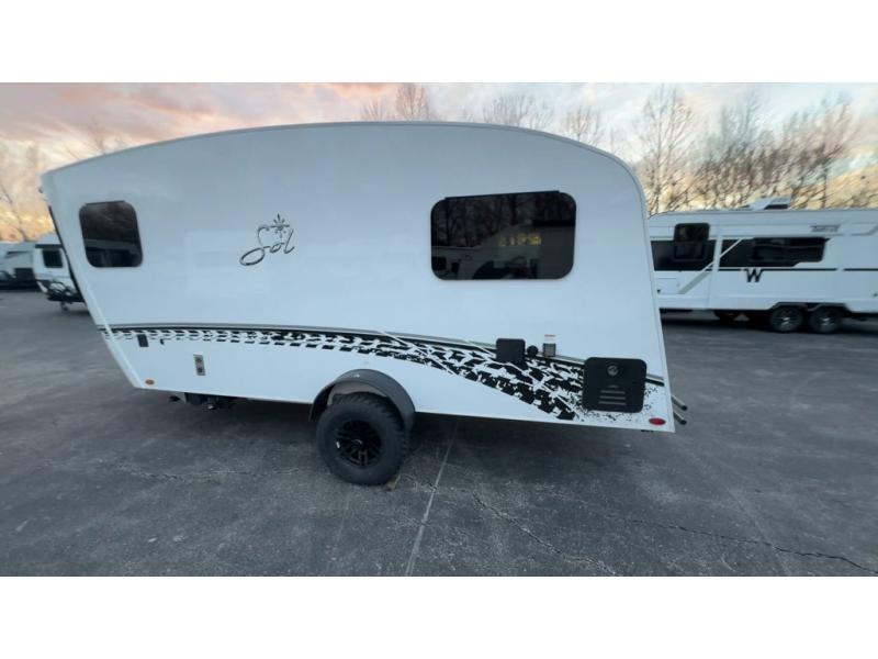 With any Sol travel trailer by inTech RV you will find strong, durable construction consisting of lightweight aluminum that is easier to tow and resists rust, water, and dents. The Tilt-Forward Design creates more space inside so you can stretch out, and the panoramic windshield gives a great view of the mountains, ocean, or forest! The elegant interior features tinted windows with shades, Infinity woven flooring, and a stainless steel cooktop and microwave. You will stay comfortable year around since these models include a 15K BTU A/C and a 16K BTU furnace.