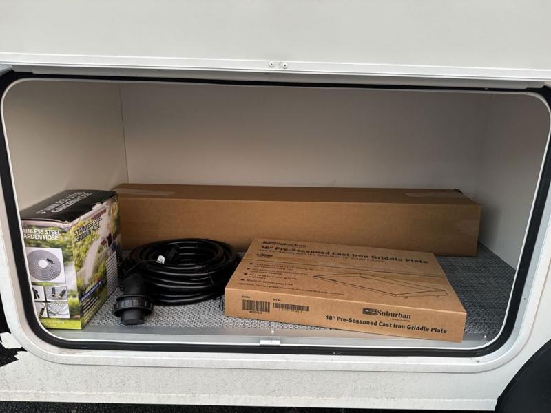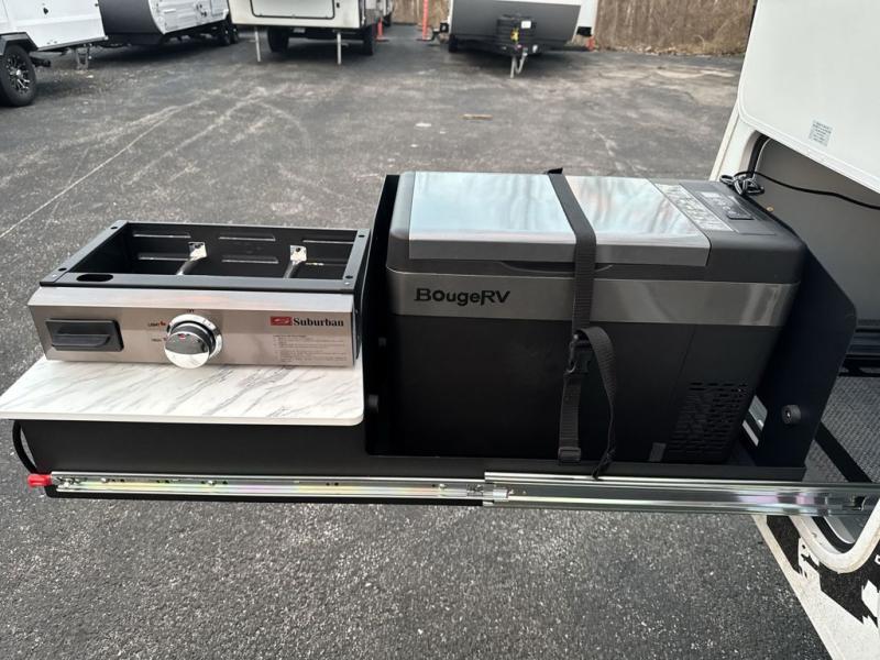 This travel trailer is ready to hit the great outdoors whenever you are! You and your loved one will have a front convertible U-shaped dinette to enjoy meals at and sleep on at night. And the rear twin beds include a filler if you want to convert them into one king-size bed In the morning. You can also prepare eggs and bacon on the two burner cooktop before heading out for the day. If you've chosen the optional 10' awning, you may not wander off too far from your trailer. This model also includes a wet bath with a porcelain toilet and a roof vent to eliminate any unwanted steam. This model has a dry weight that ranges from 3,590-3,980 lbs., a tongue weight between 540-575 lbs., and a carrying capacity between 820-1210 lbs. When the optional Rover Package is chosen on this model, you'll enjoy rugged decals, a 3" lift, blackout wheels, and more; see dealer for more details!