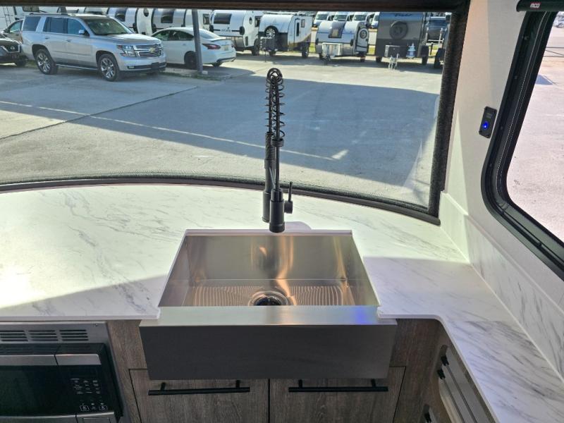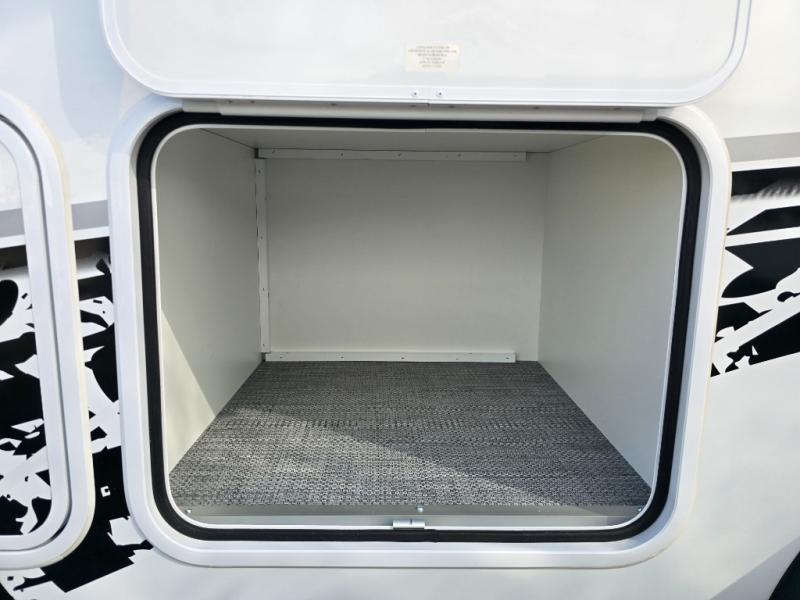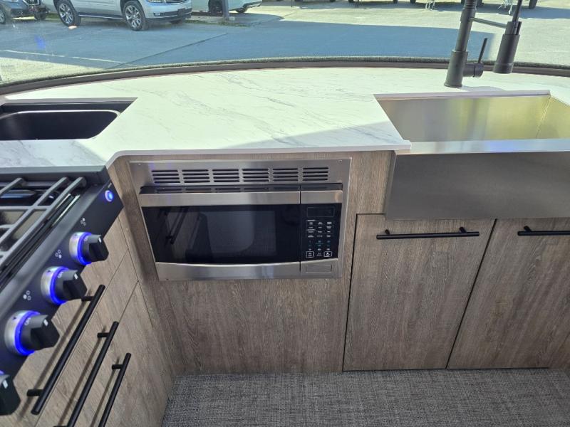 This Eclipse travel trailer will be the perfect companion on all your excursions. The large farmhouse style sink in the front kitchen provides plenty of space to clean up after dinner, and the stainless steel microwave will be perfect for popcorn and game night. The rear twin beds can be used to dine or sleep on, and you'll have a filler cushion if you want to convert them into a king-size bed! You won't have to worry about being bored on those rainy days since this model includes a 28" TV and a Bluetooth stereo with four speakers! This model has a dry weight that ranges from 3,365-3,795 lbs. lbs., a tongue weight between