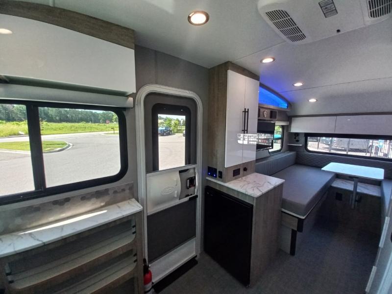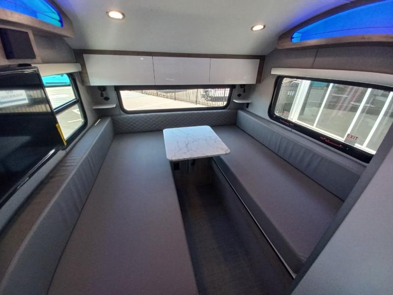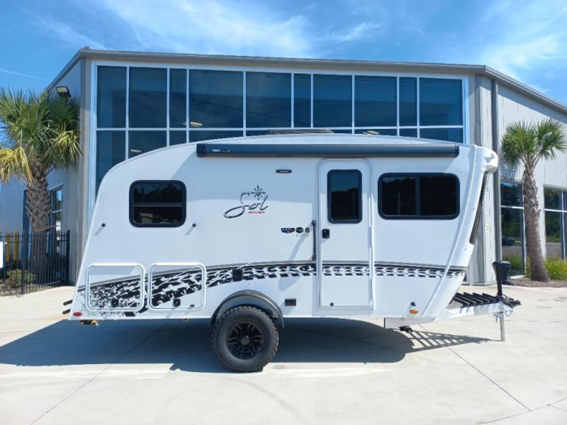 With any Sol travel trailer by inTech RV you will find strong, durable construction consisting of lightweight aluminum that is easier to tow and resists rust, water, and dents. The Tilt-Forward Design creates more space inside so you can stretch out, and the panoramic windshield gives a great view of the mountains, ocean, or forest! The elegant interior features tinted windows with shades, Infinity woven flooring, and a stainless steel cooktop and microwave. You will stay comfortable year around since these models include a 15K BTU A/C and a 16K BTU furnace.