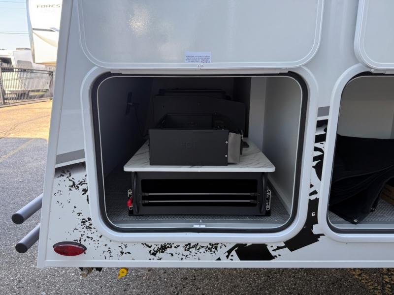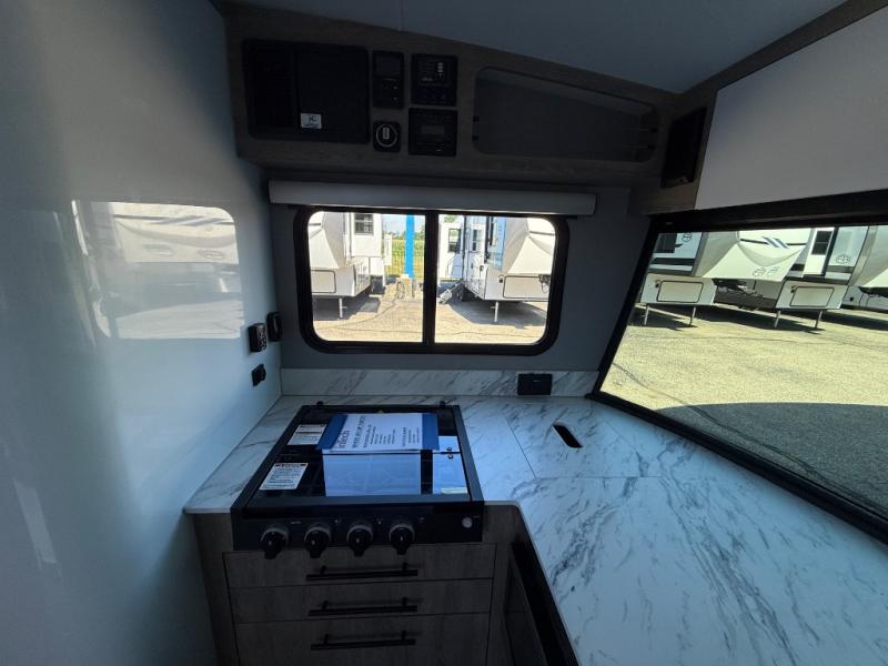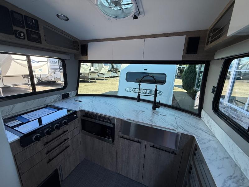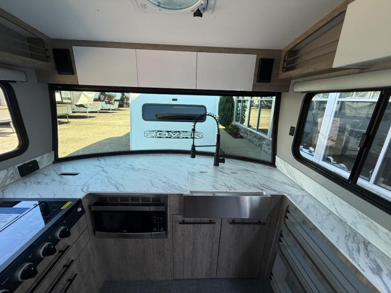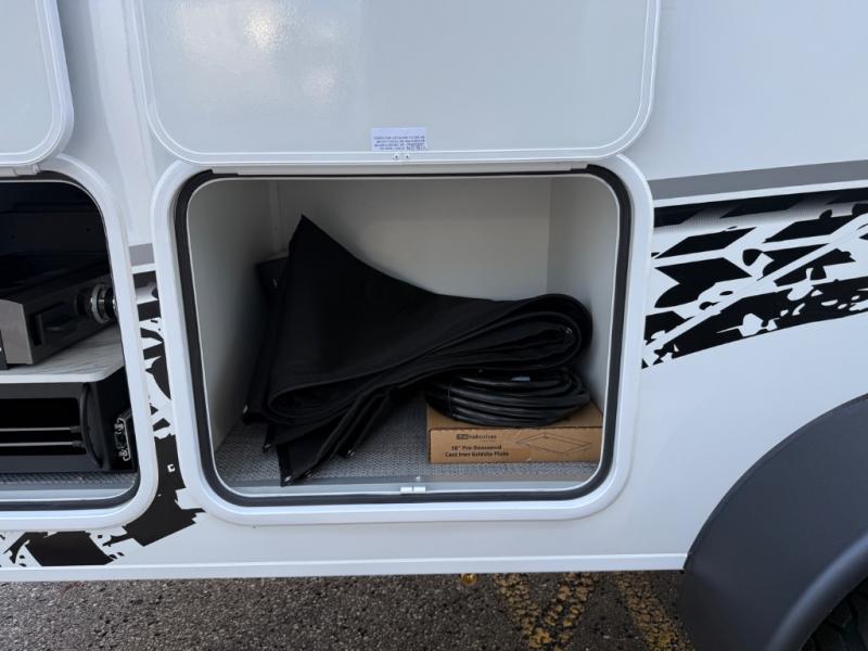This Eclipse travel trailer will be the perfect companion on all your excursions. The large farmhouse style sink in the front kitchen provides plenty of space to clean up after dinner, and the stainless steel microwave will be perfect for popcorn and game night. The rear twin beds can be used to dine or sleep on, and you'll have a filler cushion if you want to convert them into a king-size bed! You won't have to worry about being bored on those rainy days since this model includes a 28" TV and a Bluetooth stereo with four speakers! This model has a dry weight that ranges from 3,240-3,660 lbs. lbs., a tongue weight between 490-550 lbs., and a carrying capacity between 1,140-1,560 lbs. When the optional Rover Package is chosen on this model, you'll enjoy rugged decals, a 3" lift, blackout wheels, and more; see dealer for more details!
