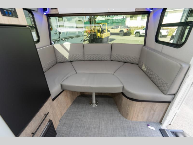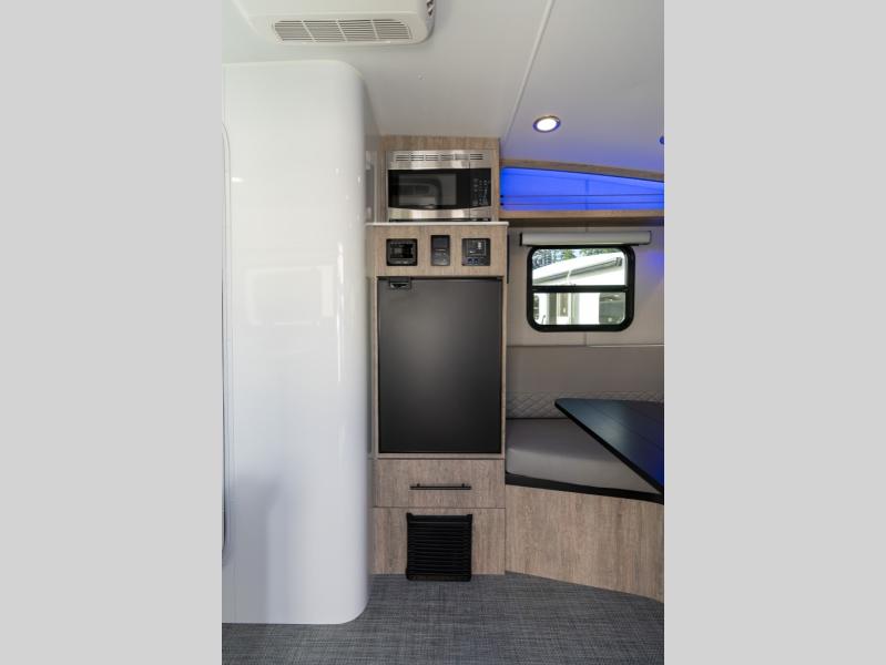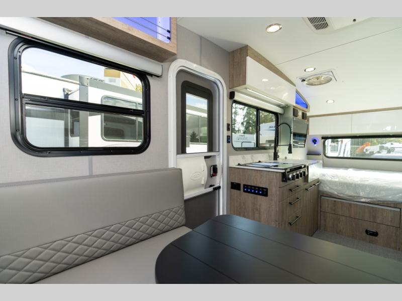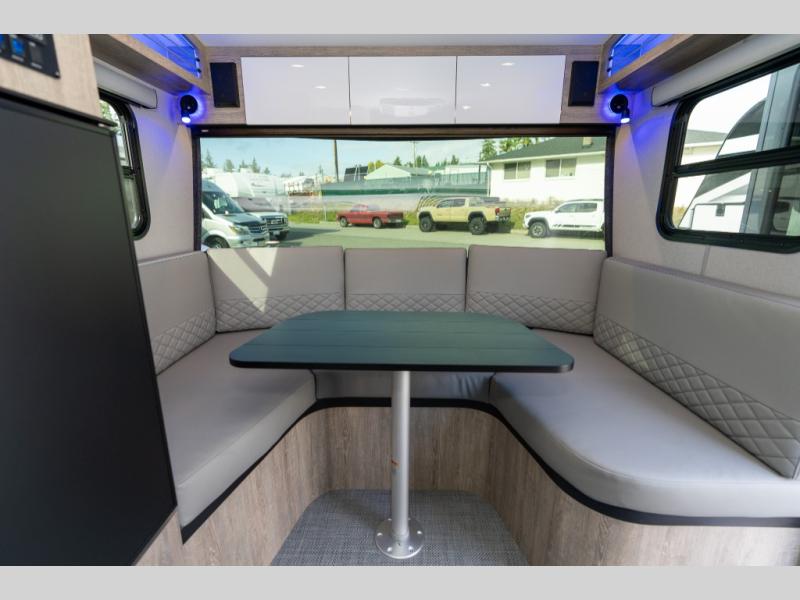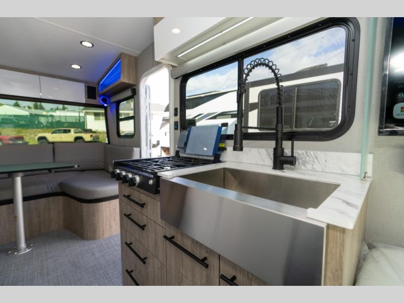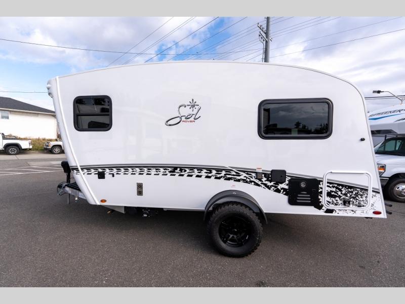 With any Sol travel trailer by inTech RV you will find strong, durable construction consisting of lightweight aluminum that is easier to tow and resists rust, water, and dents. The Tilt-Forward Design creates more space inside so you can stretch out, and the panoramic windshield gives a great view of the mountains, ocean, or forest! The elegant interior features tinted windows with shades, Infinity woven flooring, and a stainless steel cooktop and microwave. You will stay comfortable year around since these models include a 15K BTU A/C and a 16K BTU furnace. When the optional Rover Package is chosen on this model, you'll enjoy rugged decals, a 3" lift, blackout wheels, and more; see dealer for more details!