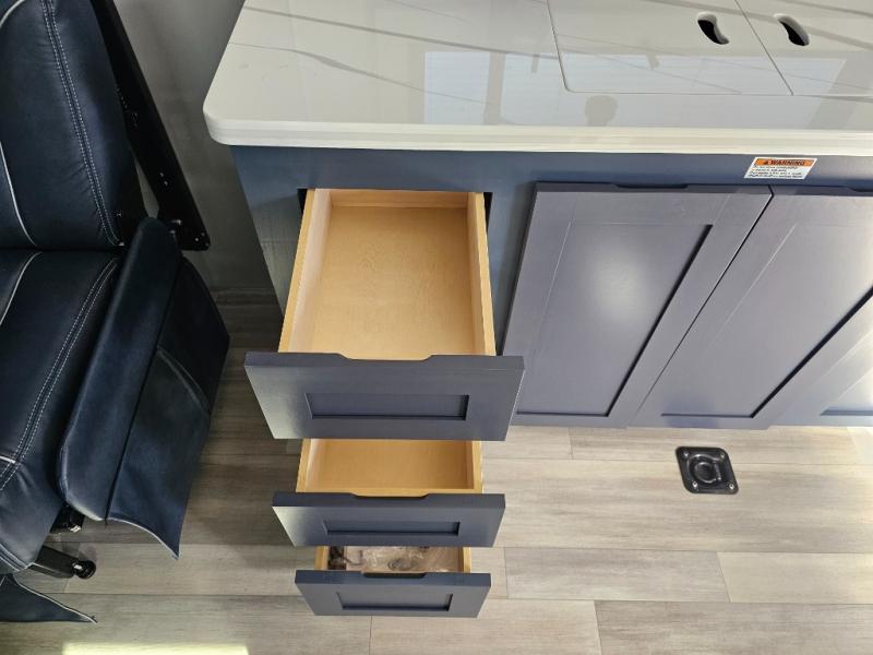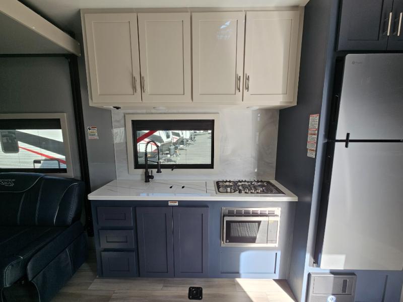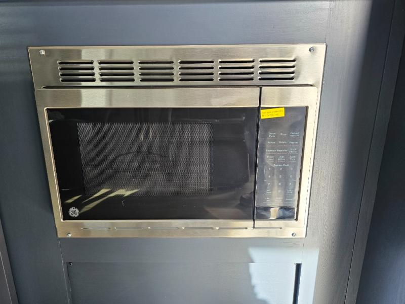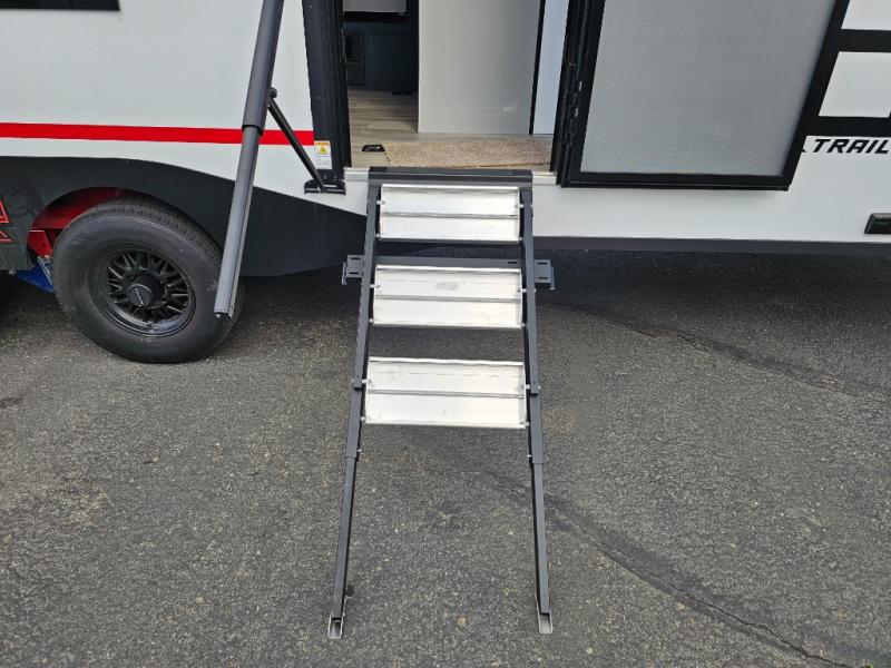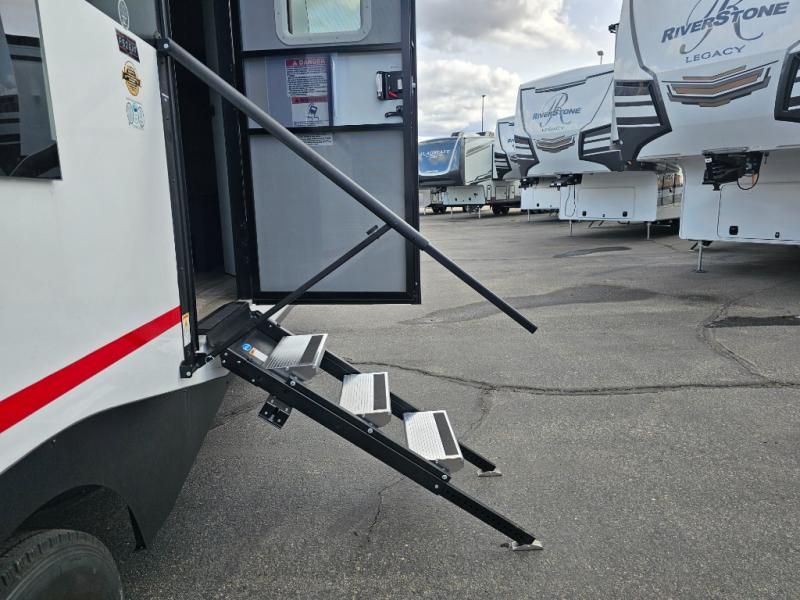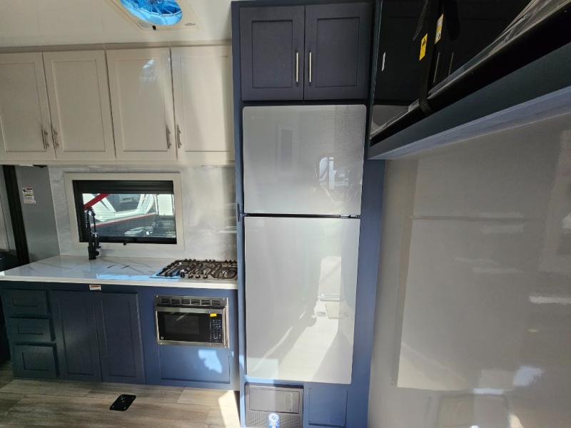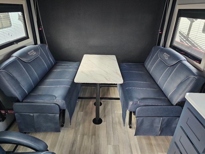 Pack your bags and head for the campground in this luxury toy hauler! You will love having your own bedroom up front with a 70" x 80" king bed, dual nightstands and wardrobes, plus overhead storage. If you have any guests staying over, they can sleep on the drop-down queen bed or bottom power dinette. A three-burner gas cooktop and 10.7 cu. ft. 12V refrigerator will let you cook and store food, and the full bath onboard means you won't have to leave the camper in the middle of the night! There is also a lounge chair with a table where you can relax with a book in the evenings or your coffee in the morning!