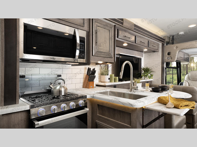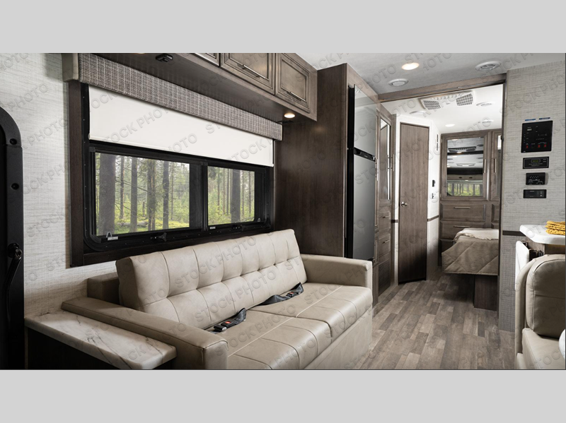 With any Alante Class A gas motorhome by Jayco, the mandatory Customer Value package provides JRide technology with a computer-balanced driveshaft ensuring smooth and efficient power transfer to the wheels, and SACHS shock absorbers offering independent adjustments to the road conditions. There is also a one-piece, seamless, crowned fiberglass roof, and an exterior entertainment center to watch shows and movies. The automatic hydraulic leveling jacks, 120 in. panoramic windshield, 200W solar panel, and the electric-powered entrance step will make traveling that much easier. And the interior equipment includes a Sony infotainment center with Apple CarPlay and Android Auto, a backup and side-view cameras for easy parking, plus a 6-way power driver seat for comfortable and safe driving. You will also love the power front privacy shade with manual side privacy shades, LED-lit hardwood fascia and countertops, a pop-up charging station in the kitchen and a USB port and wireless charging in the nightstands.