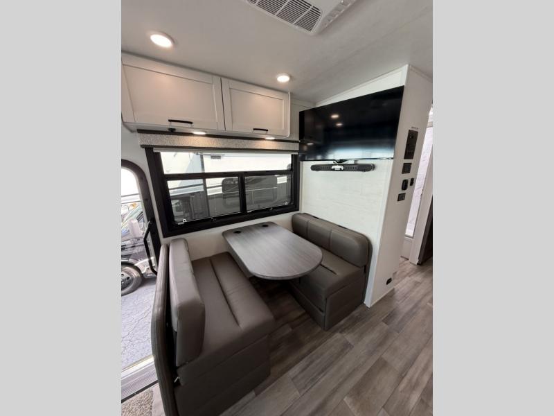 Inside, there’s plenty to love. The Jayco-exclusive, easy-operation legless dinette table is built strong so it won’t sag during meals or game night. It also quickly converts into a bed for extra sleeping space. Seatbelts in every seating position and child safety tethers in the dinette keep everyone safe during travel. In the kitchen, the residential-size microwave lets you cook your favorite meals from home, even while you’re on the road.