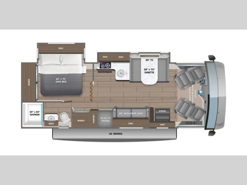 When you enjoy the drive as much as the destination, you know you made the correct choice for your adventures! The driver and passenger seats swivel to create more seating when you are parked, and the Jayco-exclusive, easy operation legless dinette table plus jack-knife sofa give everyone a place to relax and visit. You will also find sleeping space for five to six when you utilize the furniture and you choose the drop-down overhead bunk option. The rear corner bedroom gives you a king bed, two wardrobes, and a full bathroom just a few steps away. The kitchen offers full amenities including a two burner cooktop, a convection microwave, and a 10 cu. ft. 12V refrigerator. This unit also includes a 39" LED HD Smart TV in the living area to enjoy movie nights with popcorn!