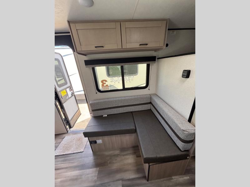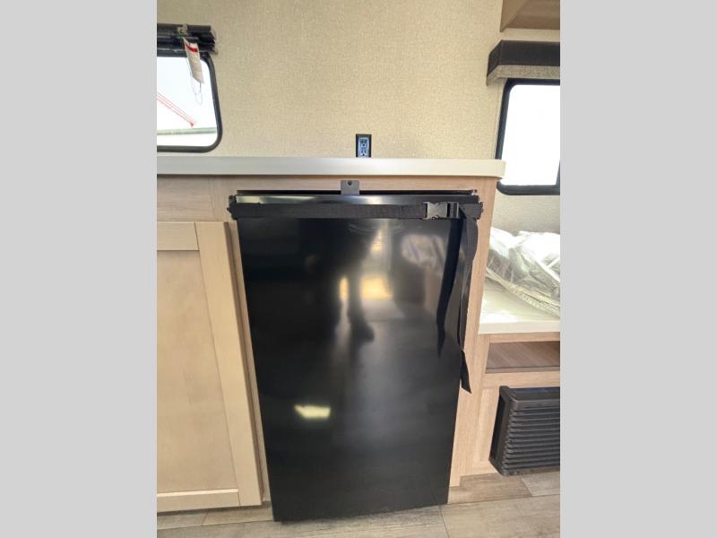 This easy to tow travel trailer features compact sleeping spaces thanks to the double-size bunk beds in the rear corner, and the private bath is right next to the bunks for easy nighttime use! You'll have the front queen bed to yourselves, along with a wardrobe, nightstand, and overhead shelf for your things. A two-burner cooktop and microwave oven will let you make meals each day, and there is a 12V refrigerator to keep your cold items fresh. Outside, you'll enjoy the 10' power awning for added shade, and there are two exterior storage compartments to keep fishing poles, hiking gear and more!