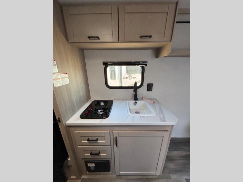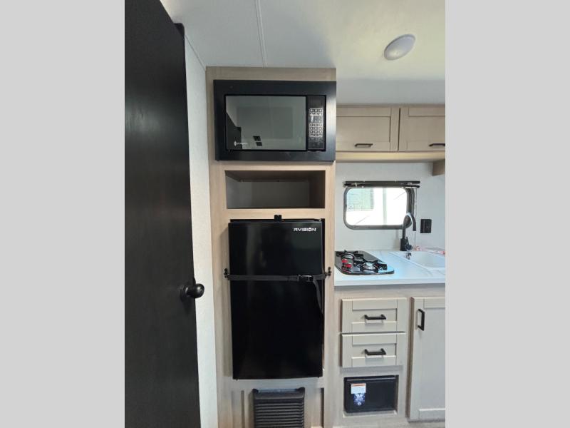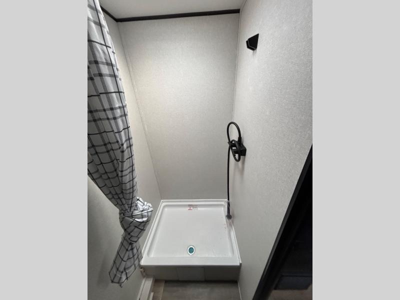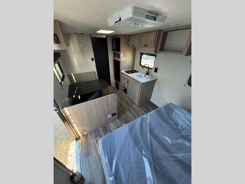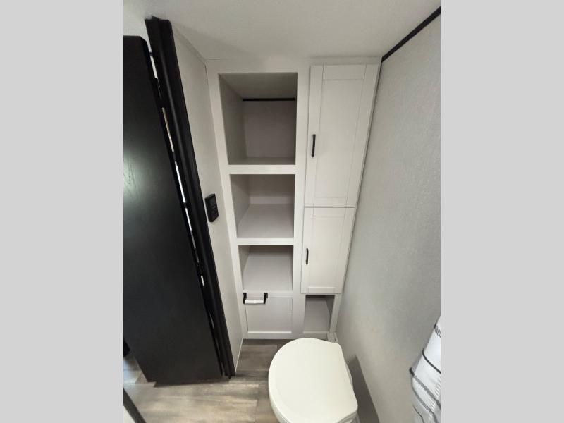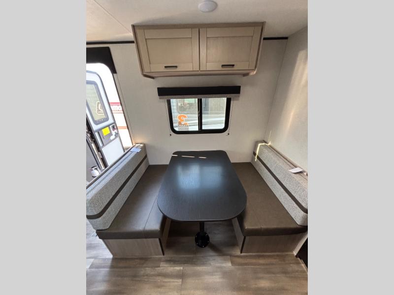 This travel trailer is just what the doctor ordered! Once you've loaded up the exterior storage, you can head out to the campground of your choice. The 10' power awning can be put out when you arrive, then you can relax in your camp chairs or head inside to make lunch on the two-burner cooktop. There is also a microwave oven for quick meals and a 12V refrigerator for food storage. A booth dinette provides a place to dine together, and you can convert it to sleeping space at night for one to two guests. You'll love the front queen bed that includes an overhead shelf and a wardrobe for your things, and this unit includes a full rear bath for added privacy. Here, you'll find a 24" x 32" shower, a toilet, and a linen closet plus shelves/storage for toiletries and towels!