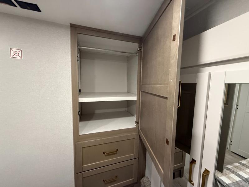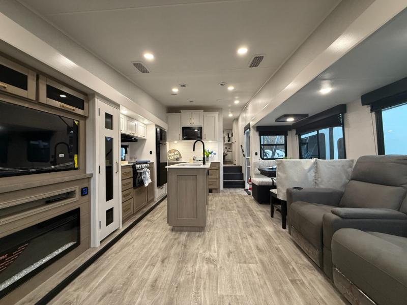 You can't go wrong when camping in this spacious fifth wheel! There are dual opposing slides in the living room, giving your crew plenty of space to prep dinner on the kitchen island, relax on the theater sofa, or dine at the booth dinette. There is also a rear tri-fold sofa where your guests can sleep! An entertainment center with a fireplace will make this space feel even more like home, and there are plenty of storage spaces for all your belongings. The full bath towards the front will let you freshen up each day, and the front private bedroom with a queen bed is sure to bring comfort. There are also dual nightstands, overhead cabinets, plus a wardrobe and dresser slide out, so everything has a place!