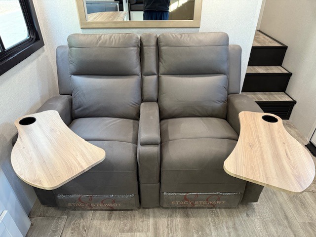 This fifth wheel is not only packed with amenities, but it can sleep up to eight people each night for fun camping trips! The rear private bunkhouse includes bunk beds plus a third bunk above a jack-knife sofa, and there is a bike storage door here so you can easily pack in gear. You can claim the front private bedroom all to yourselves with an Olympic bed, a wardrobe slide plus a second wardrobe with washer and dryer prep. Everyone can come together in the combined kitchen and living room that features a U-shaped dinette across from the TV and a theater seat for added comfort!