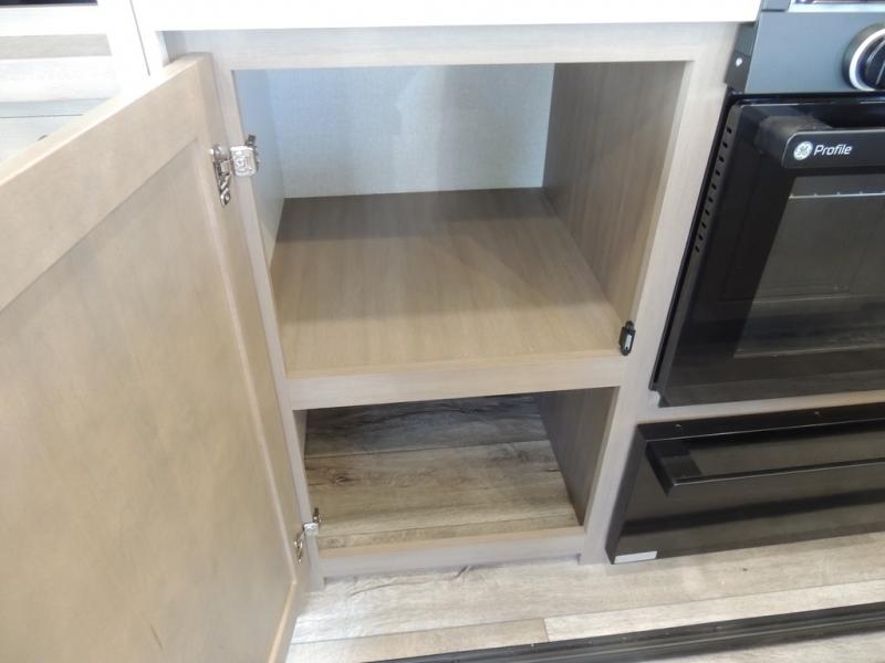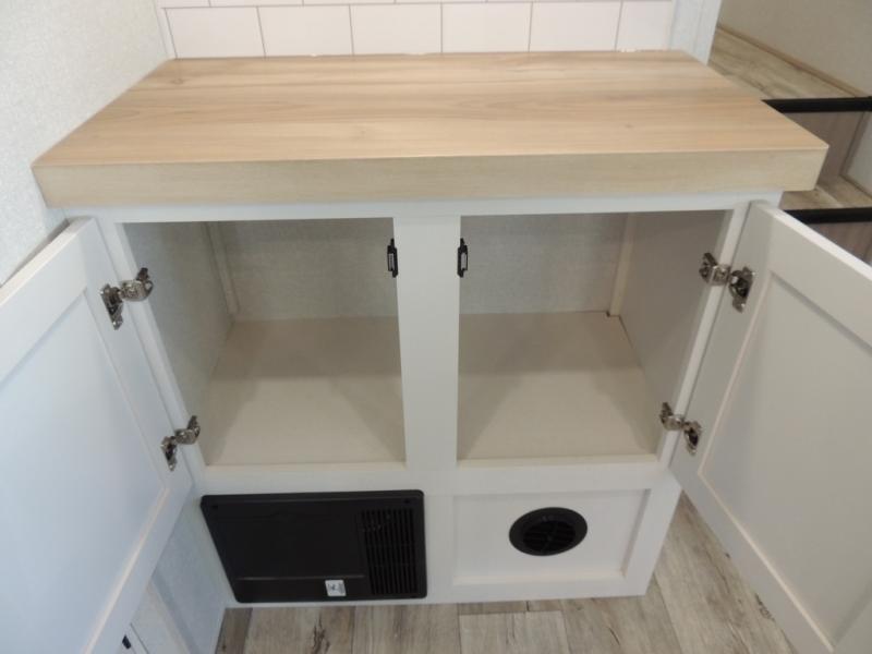 Triple slides for space, plenty of seating spaces, plus a spacious private bedroom make this fifth wheel one you won't want to pass up! You can freshen up each day in the full bath that includes a residential style glass shower door, a bathroom skylight, and a medicine cabinet to keep this space organized. Once you've cut up some fresh fruit at the kitchen island, whip up some eggs and bacon for breakfast, or just grab the cereal from the pantry. There is a spacious 16 cu. ft. 12V refrigerator, plus a hutch where you can store your own coffee machine. Relax on the tri-fold sofa, theater seat, or free-standing table with chairs/bench before heading out for the day. The king bed slide out in the front private bedroom will be waiting for you when you return!