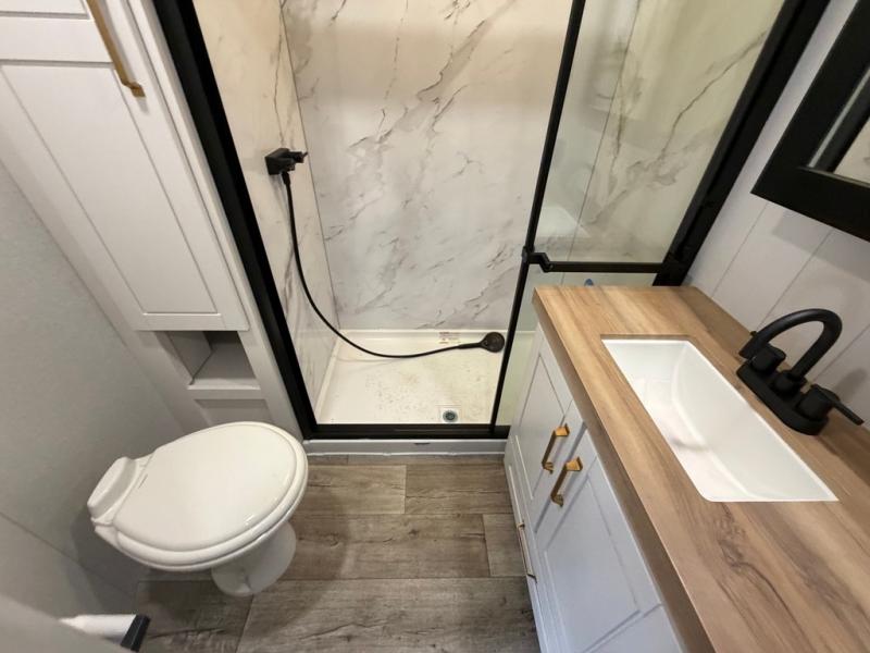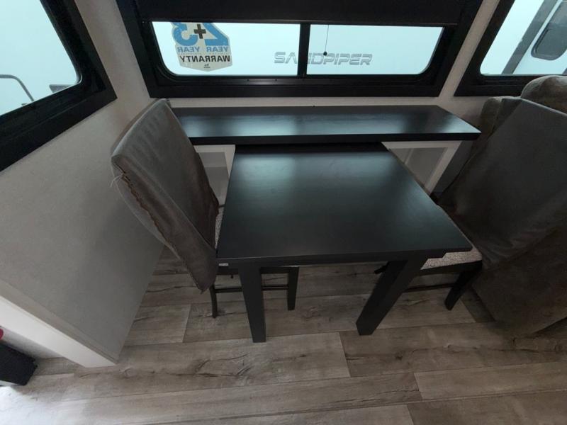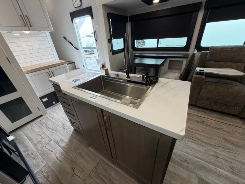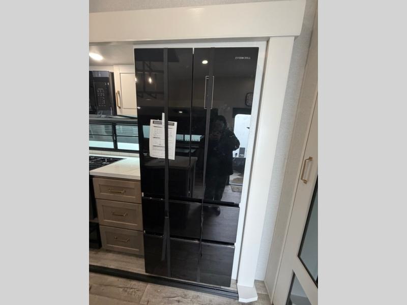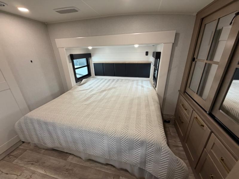 Triple slides for space, plenty of seating spaces, plus a spacious private bedroom make this fifth wheel one you won't want to pass up! You can freshen up each day in the full bath that includes a residential style glass shower door, a bathroom skylight, and a medicine cabinet to keep this space organized. Once you've cut up some fresh fruit at the kitchen island, whip up some eggs and bacon for breakfast, or just grab the cereal from the pantry. There is a spacious 16 cu. ft. 12V refrigerator, plus a hutch where you can store your own coffee machine. Relax on the tri-fold sofa, theater seat, or free-standing table with chairs/bench before heading out for the day. The king bed slide out in the front private bedroom will be waiting for you when you return!