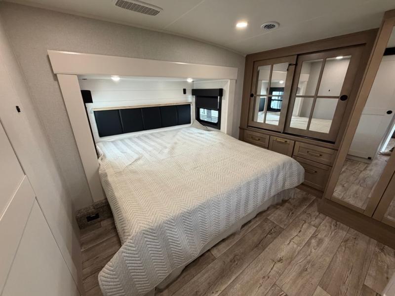 With any Eagle fifth wheel by Jayco you will appreciate durable construction materials, like the Magnum Truss Roof and the Stronghold VBL laminated walls. The JAYCOMMAND Smart RV system puts you in control of your RV's functions, and the 5 Star Handling Package will provide smooth towing from home to camp. Each model features Climate Shield zero-degree tested weather protection and the industry-exclusive HELIX cooling system that features two 15,000 BTU Whisper Quiet A/C's to keep you comfortable year around. Some of the exterior conveniences you are sure to love are the pass-through storage with Slam-Latch baggage doors and an automotive style front cap with max turn radius. The Eagle fifth wheels are designed to make you feel at home with solid hardwood slide fascia, residential vinyl flooring throughout, 100% no floor vents, and blackout roller shades with reflective side throughout for added privacy and insulation.
