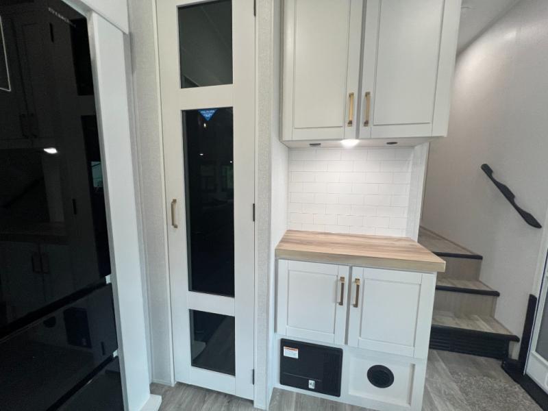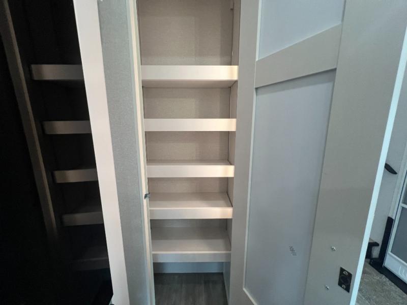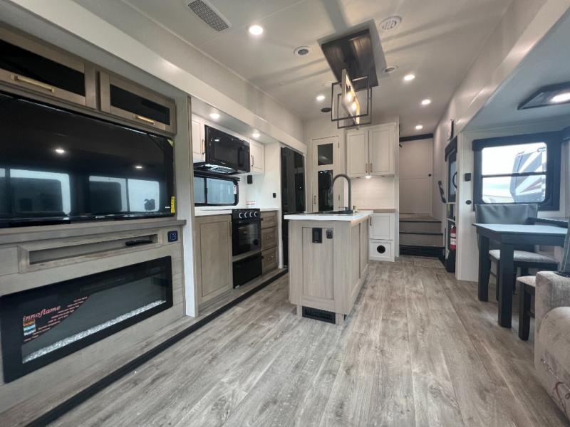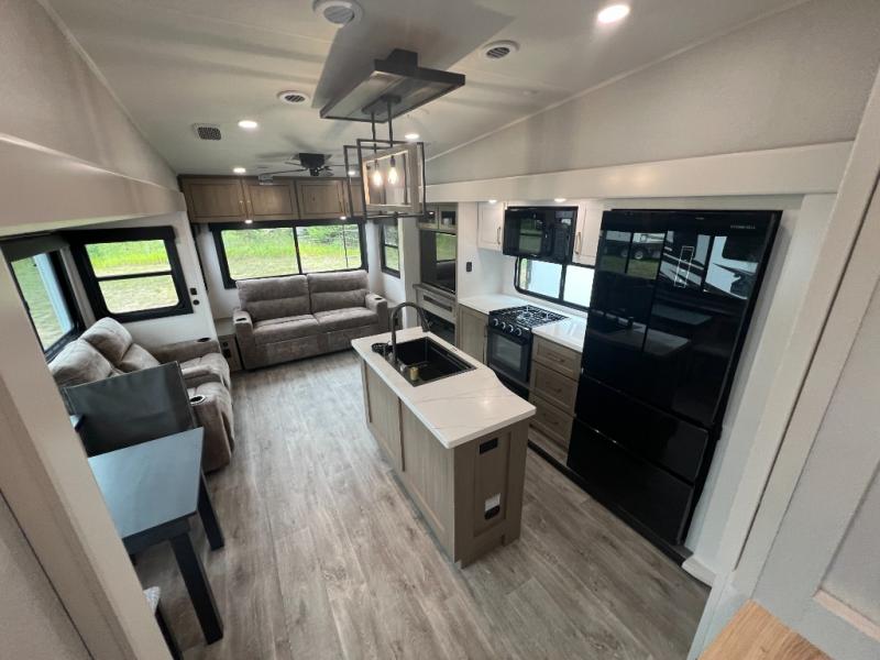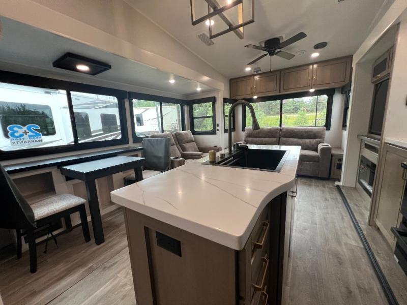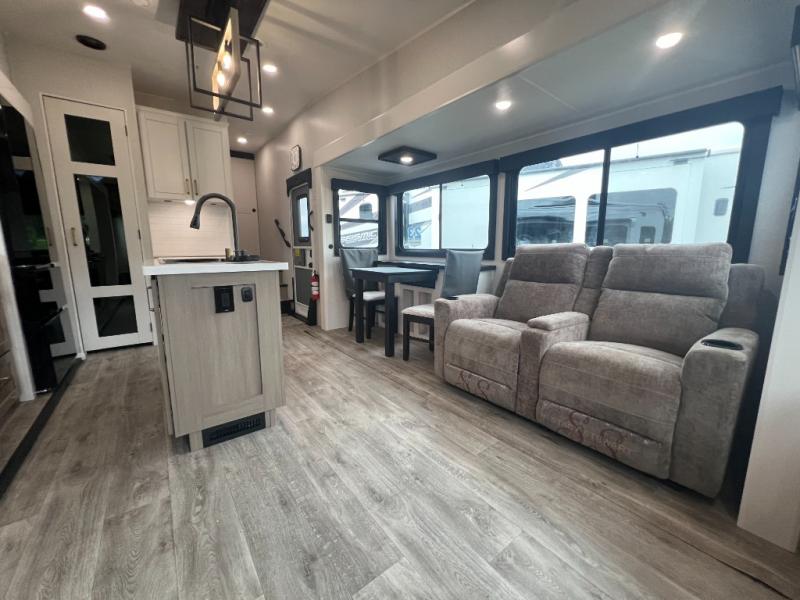 Triple slides for space, plenty of seating spaces, plus a spacious private bedroom make this fifth wheel one you won't want to pass up! You can freshen up each day in the full bath that includes a residential style glass shower door, a bathroom skylight, and a medicine cabinet to keep this space organized. Once you've cut up some fresh fruit at the kitchen island, whip up some eggs and bacon for breakfast, or just grab the cereal from the pantry. There is a spacious 16 cu. ft. 12V refrigerator, plus a hutch where you can store your own coffee machine. Relax on the tri-fold sofa, theater seat, or free-standing table with chairs/bench before heading out for the day. The king bed slide out in the front private bedroom will be waiting for you when you return!