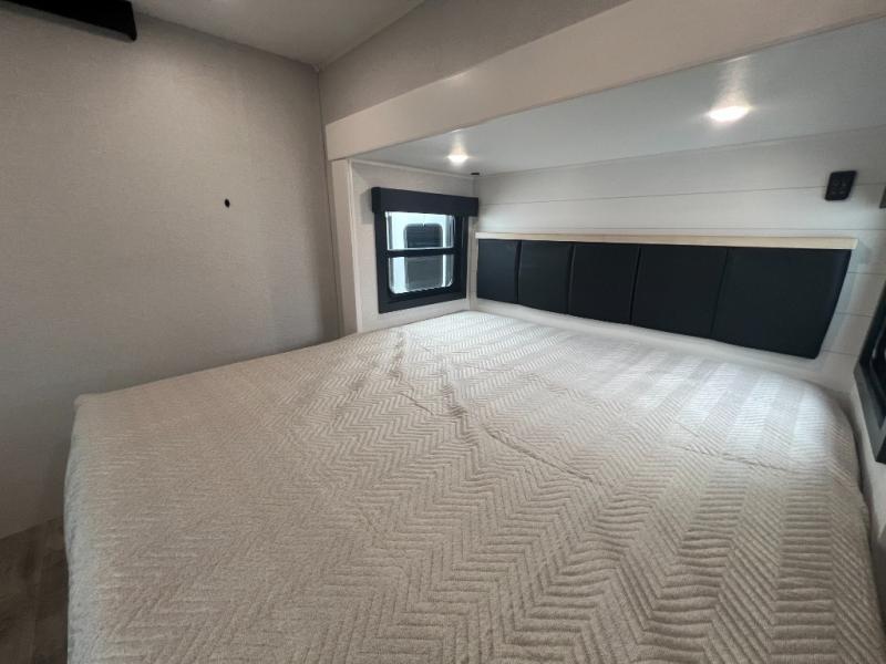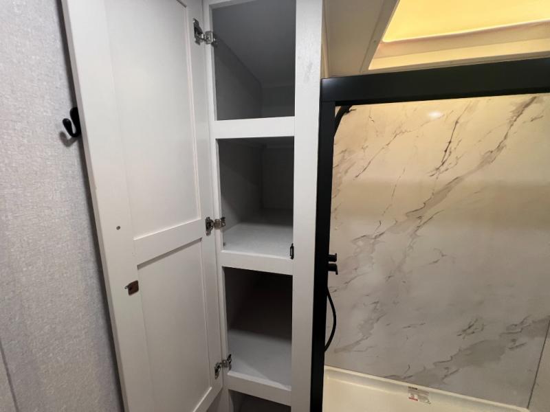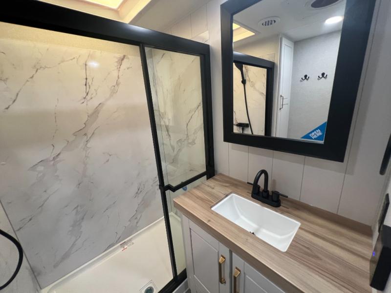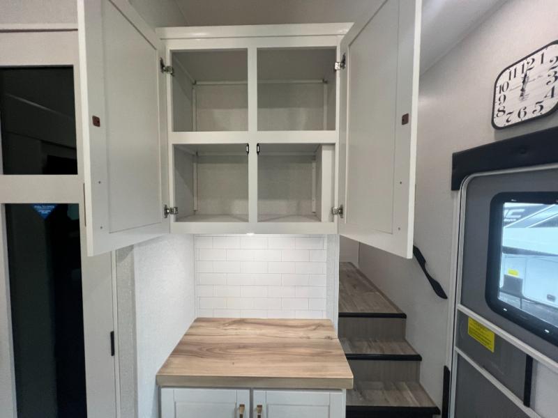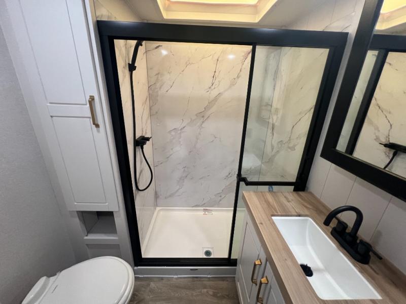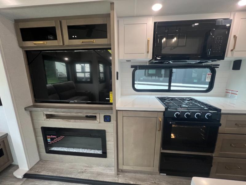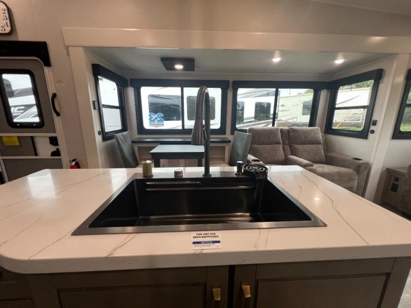 Triple slides for space, plenty of seating spaces, plus a spacious private bedroom make this fifth wheel one you won't want to pass up! You can freshen up each day in the full bath that includes a residential style glass shower door, a bathroom skylight, and a medicine cabinet to keep this space organized. Once you've cut up some fresh fruit at the kitchen island, whip up some eggs and bacon for breakfast, or just grab the cereal from the pantry. There is a spacious 16 cu. ft. 12V refrigerator, plus a hutch where you can store your own coffee machine. Relax on the tri-fold sofa, theater seat, or free-standing table with chairs/bench before heading out for the day. The king bed slide out in the front private bedroom will be waiting for you when you return!
