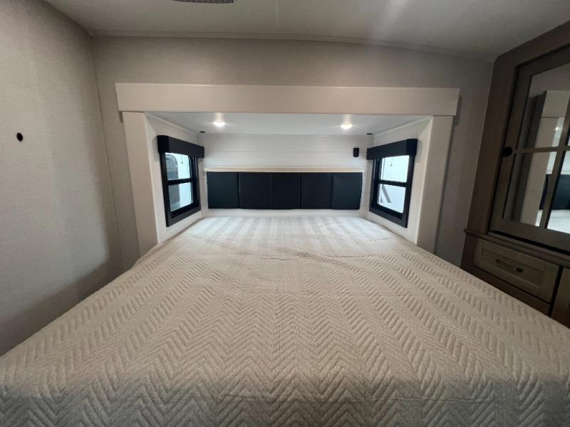 With any Eagle fifth wheel by Jayco you will appreciate durable construction materials, like the Magnum Truss Roof and the Stronghold VBL laminated walls. The JAYCOMMAND Smart RV system puts you in control of your RV's functions, and the 5 Star Handling Package will provide smooth towing from home to camp. Each model features Climate Shield zero-degree tested weather protection and the industry-exclusive HELIX cooling system that features two 15,000 BTU Whisper Quiet A/C's to keep you comfortable year around. Some of the exterior conveniences you are sure to love are the pass-through storage with Slam-Latch baggage doors and an automotive style front cap with max turn radius. The Eagle fifth wheels are designed to make you feel at home with solid hardwood slide fascia, residential vinyl flooring throughout, 100% no floor vents, and blackout roller shades with reflective side throughout for added privacy and insulation.