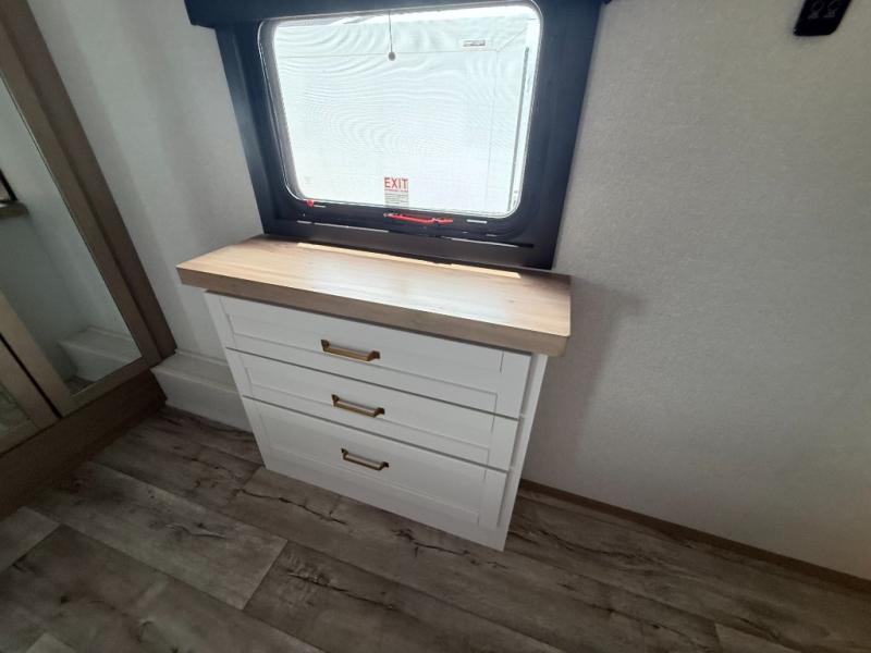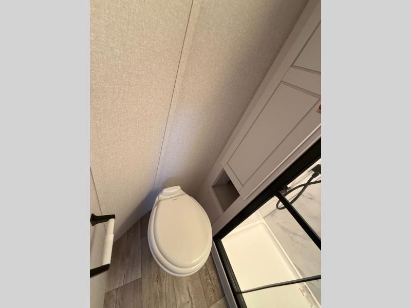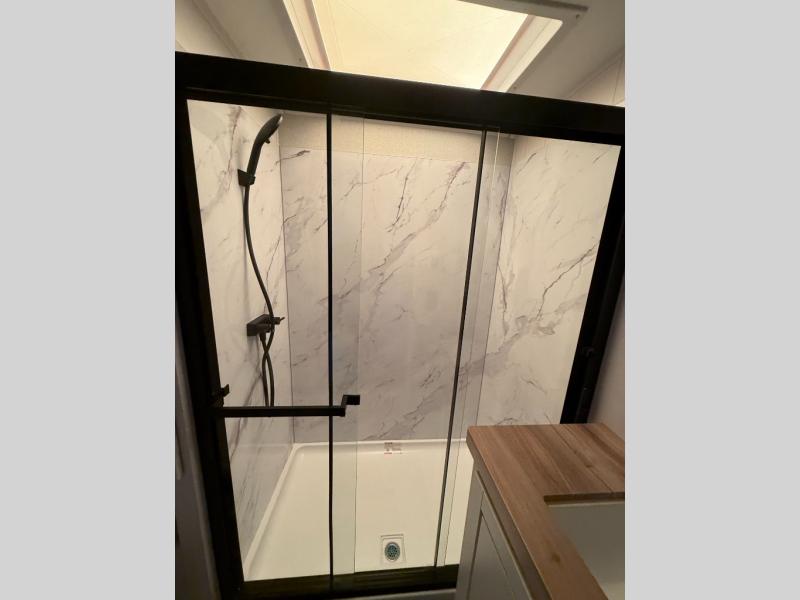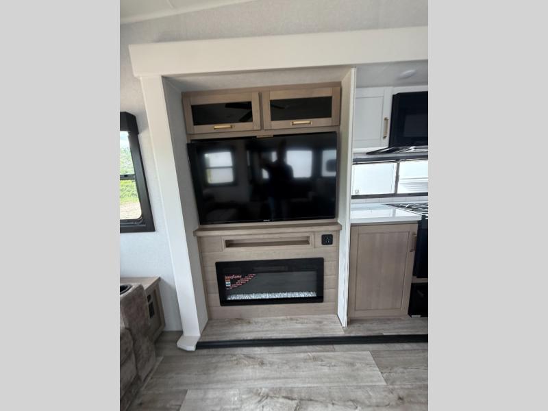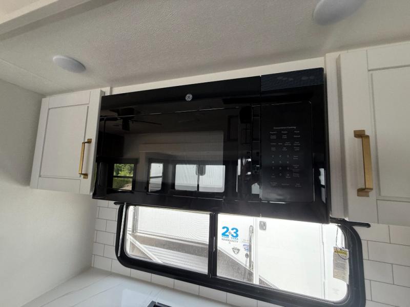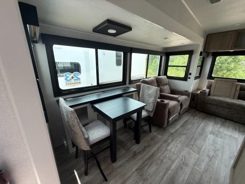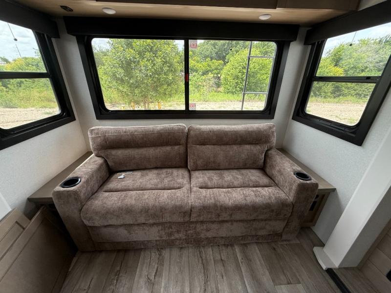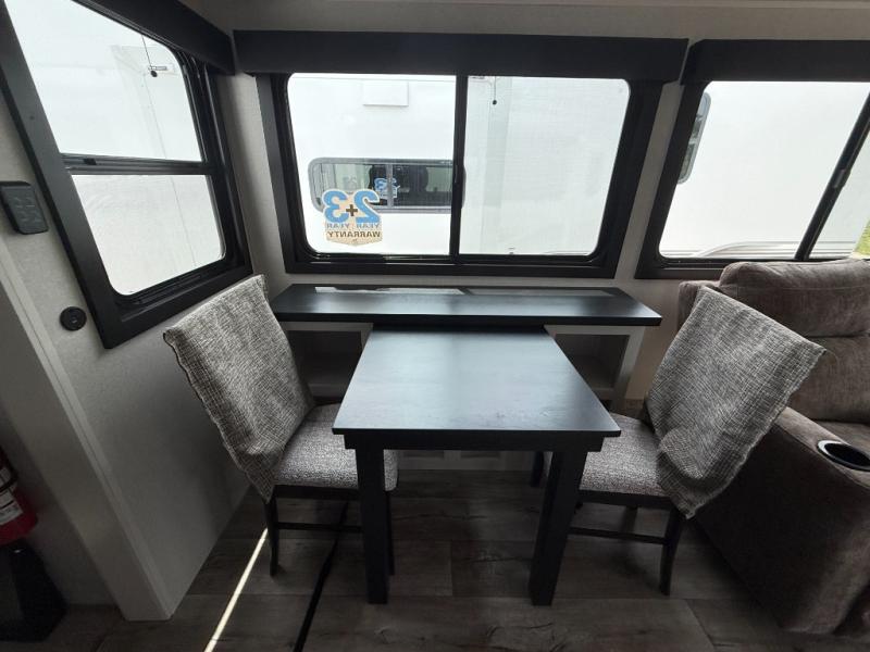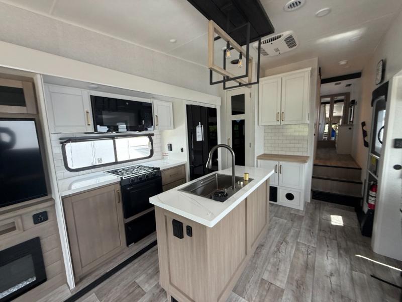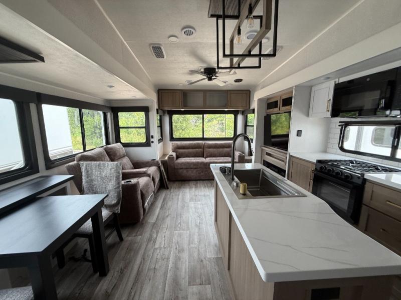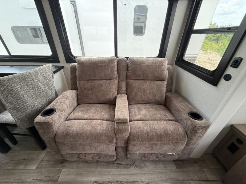 Triple slides for space, plenty of seating spaces, plus a spacious private bedroom make this fifth wheel one you won't want to pass up! You can freshen up each day in the full bath that includes a residential style glass shower door, a bathroom skylight, and a medicine cabinet to keep this space organized. Once you've cut up some fresh fruit at the kitchen island, whip up some eggs and bacon for breakfast, or just grab the cereal from the pantry. There is a spacious 16 cu. ft. 12V refrigerator, plus a hutch where you can store your own coffee machine. Relax on the tri-fold sofa, theater seat, or free-standing table with chairs/bench before heading out for the day. The king bed slide out in the front private bedroom will be waiting for you when you return!
