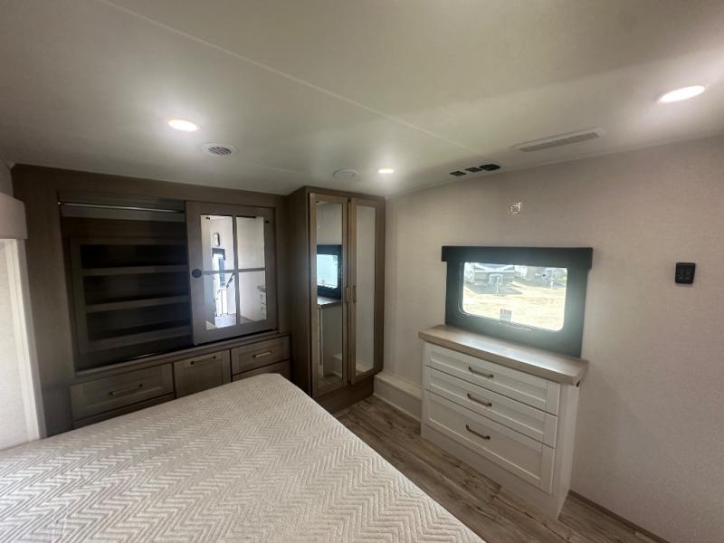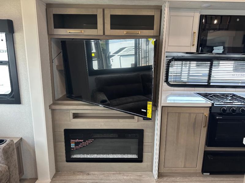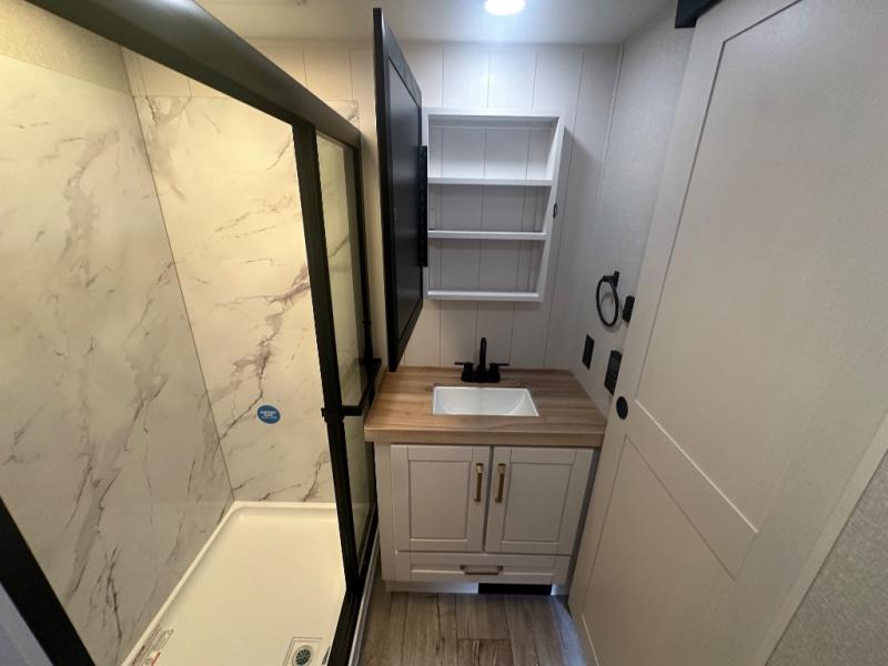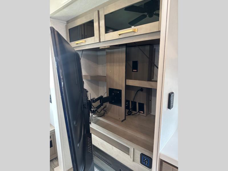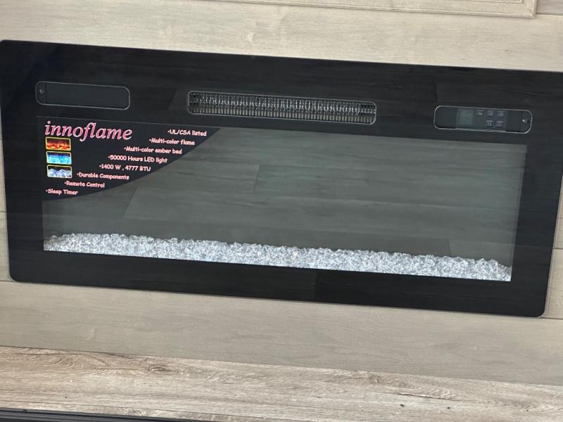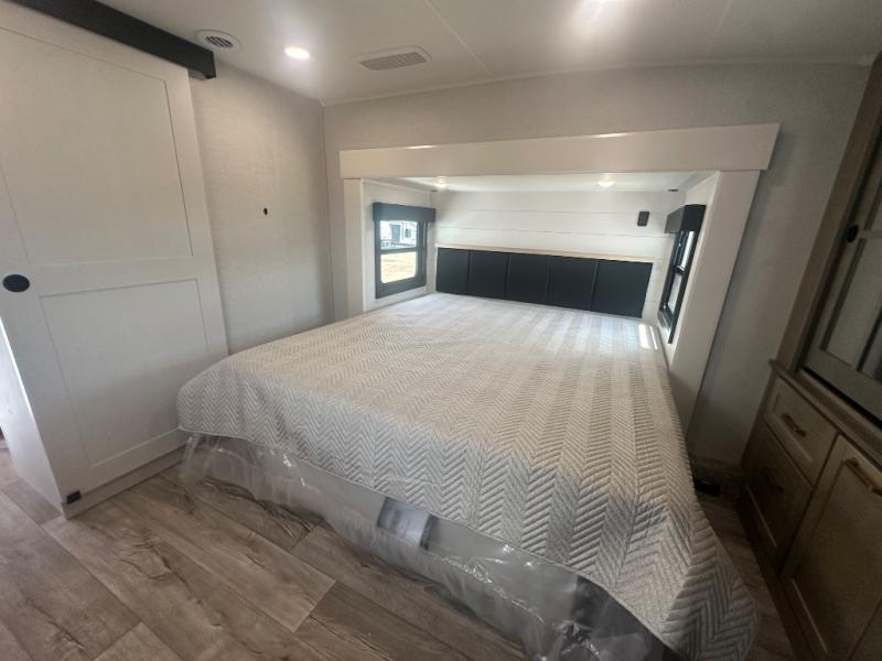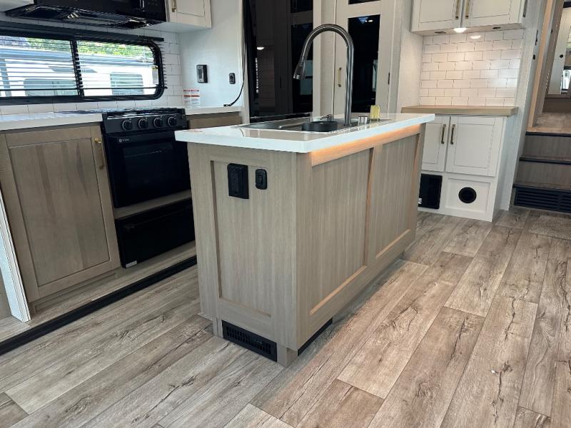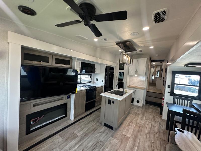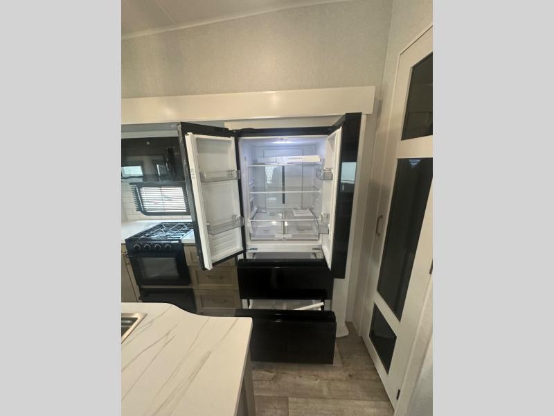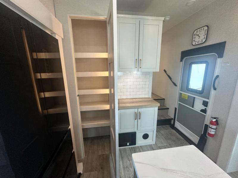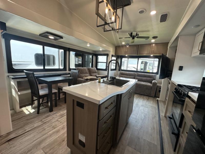 Triple slides for space, plenty of seating spaces, plus a spacious private bedroom make this fifth wheel one you won't want to pass up! You can freshen up each day in the full bath that includes a residential style glass shower door, a bathroom skylight, and a medicine cabinet to keep this space organized. Once you've cut up some fresh fruit at the kitchen island, whip up some eggs and bacon for breakfast, or just grab the cereal from the pantry. There is a spacious 16 cu. ft. 12V refrigerator, plus a hutch where you can store your own coffee machine. Relax on the tri-fold sofa, theater seat, or free-standing table with chairs/bench before heading out for the day. The king bed slide out in the front private bedroom will be waiting for you when you return!
