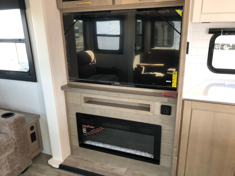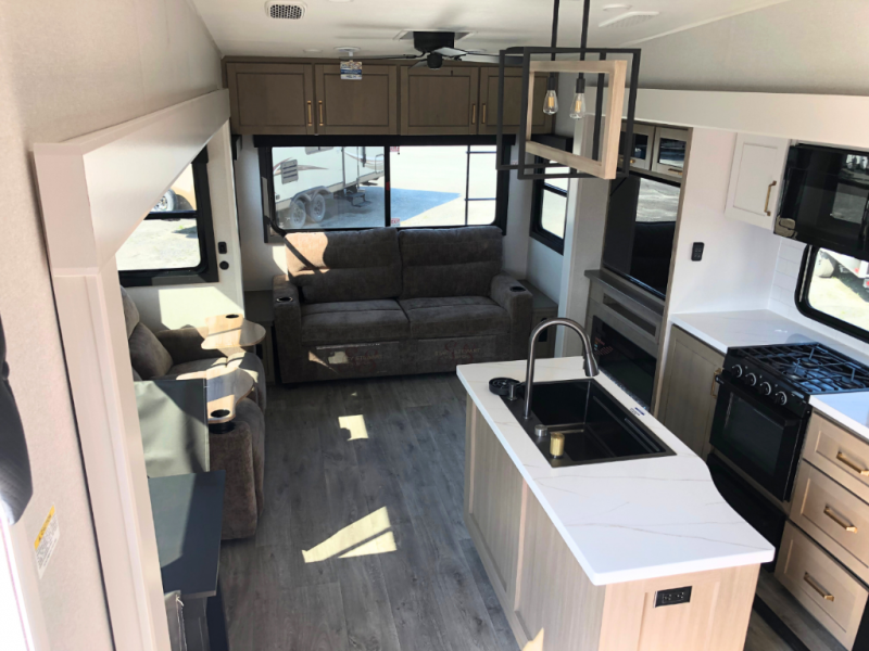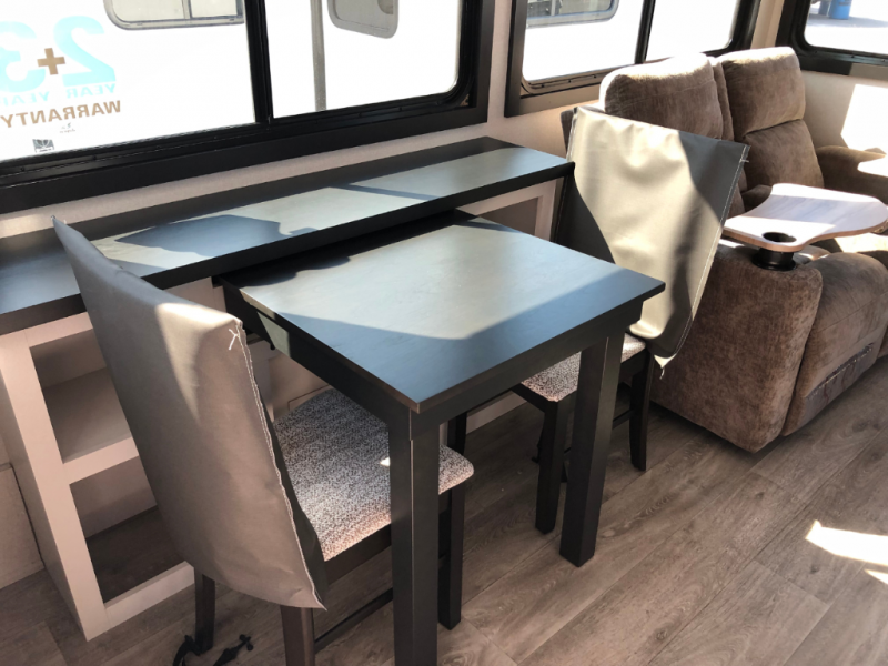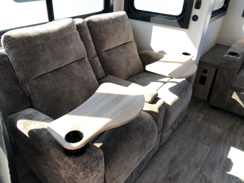 Triple slides for space, plenty of seating spaces, plus a spacious private bedroom make this fifth wheel one you won't want to pass up! You can freshen up each day in the full bath that includes a residential style glass shower door, a bathroom skylight, and a medicine cabinet to keep this space organized. Once you've cut up some fresh fruit at the kitchen island, whip up some eggs and bacon for breakfast, or just grab the cereal from the pantry. There is a spacious 16 cu. ft. 12V refrigerator, plus a hutch where you can store your own coffee machine. Relax on the tri-fold sofa, theater seat, or free-standing table with chairs/bench before heading out for the day. The king bed slide out in the front private bedroom will be waiting for you when you return!