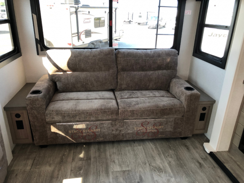 With any Eagle fifth wheel by Jayco you will appreciate durable construction materials, like the Magnum Truss Roof and the Stronghold VBL laminated walls. The JAYCOMMAND Smart RV system puts you in control of your RV's functions, and the 5 Star Handling Package will provide smooth towing from home to camp. Each model features Climate Shield zero-degree tested weather protection and the industry-exclusive HELIX cooling system that features two 15,000 BTU Whisper Quiet A/C's to keep you comfortable year around. Some of the exterior conveniences you are sure to love are the pass-through storage with Slam-Latch baggage doors and an automotive style front cap with max turn radius. The Eagle fifth wheels are designed to make you feel at home with solid hardwood slide fascia, residential vinyl flooring throughout, 100% no floor vents, and blackout roller shades with reflective side throughout for added privacy and insulation.