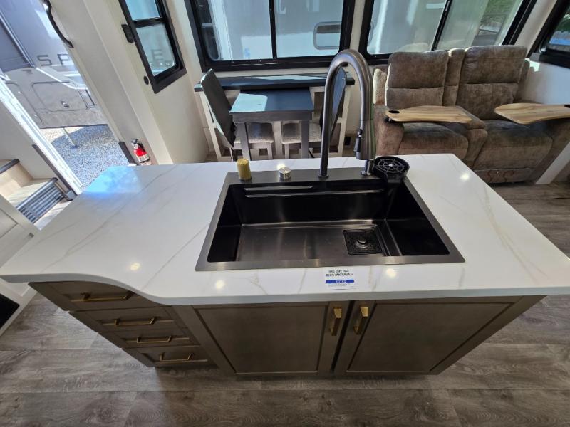 Multi-Functional Sink – Large kitchen island sink with covers to extend prep space.