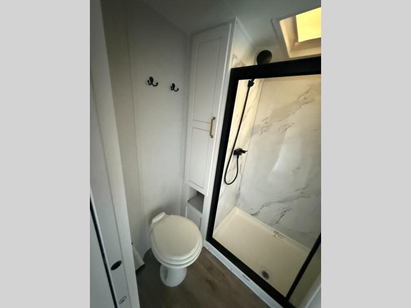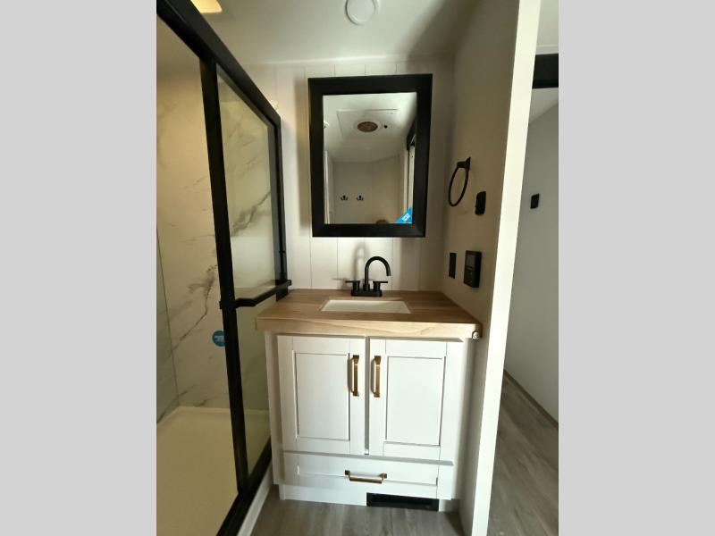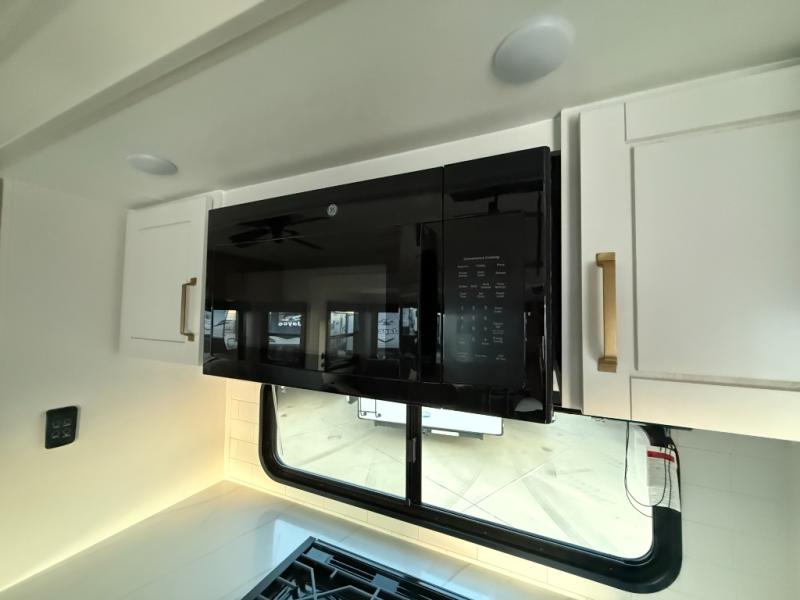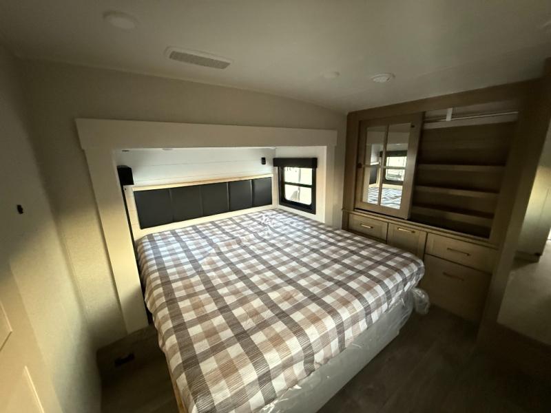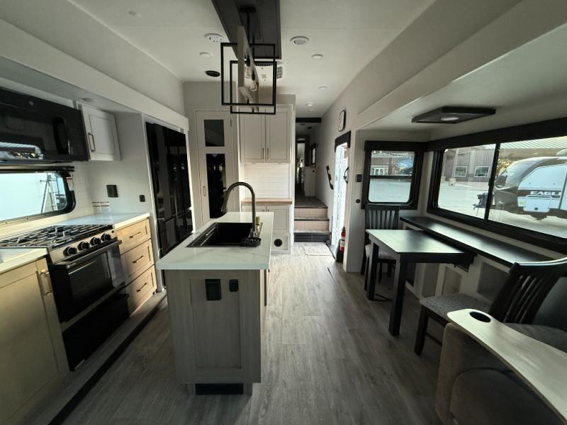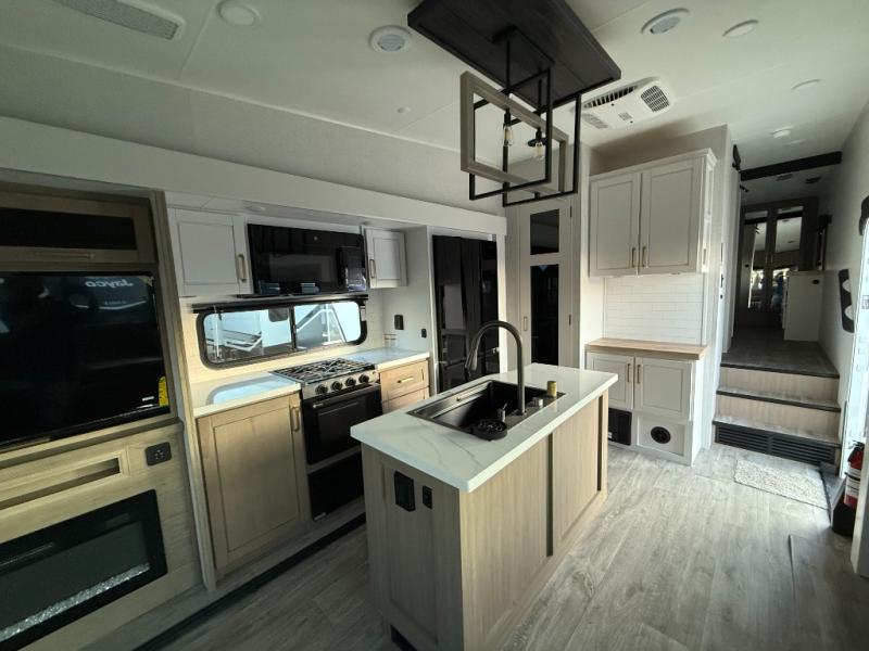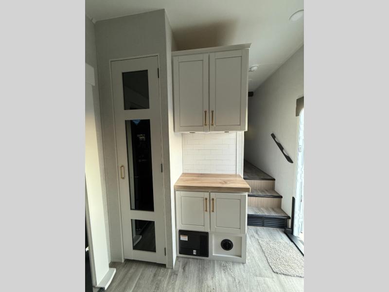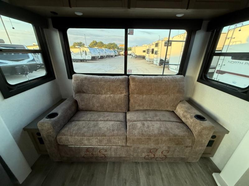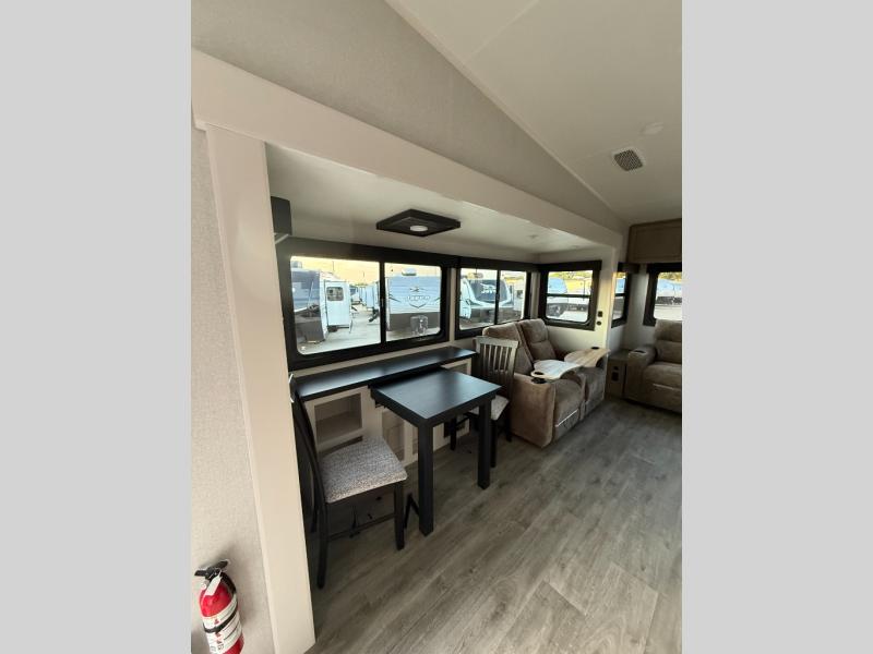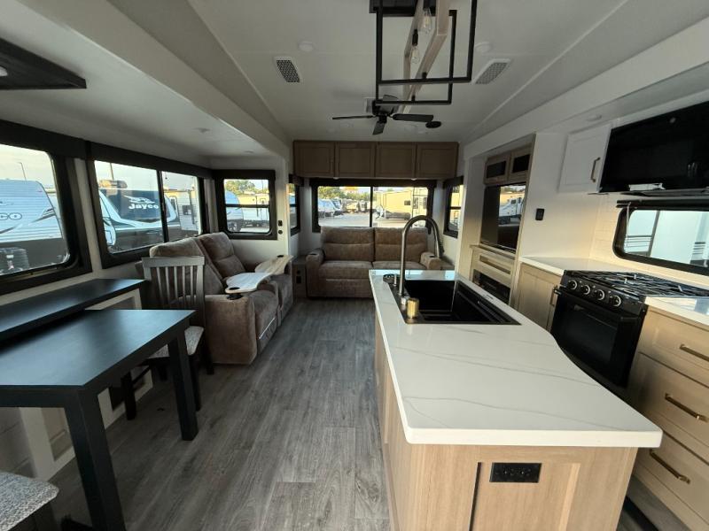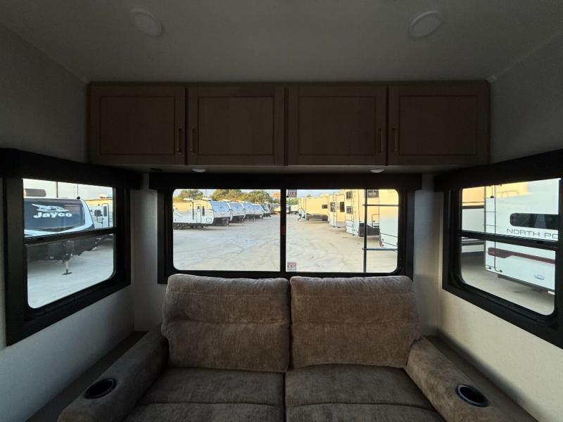 Triple slides for space, plenty of seating spaces, plus a spacious private bedroom make this fifth wheel one you won't want to pass up! You can freshen up each day in the full bath that includes a residential style glass shower door, a bathroom skylight, and a medicine cabinet to keep this space organized. Once you've cut up some fresh fruit at the kitchen island, whip up some eggs and bacon for breakfast, or just grab the cereal from the pantry. There is a spacious 16 cu. ft. 12V refrigerator, plus a hutch where you can store your own coffee machine. Relax on the tri-fold sofa, theater seat, or free-standing table with chairs/bench before heading out for the day. The king bed slide out in the front private bedroom will be waiting for you when you return!