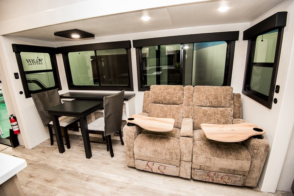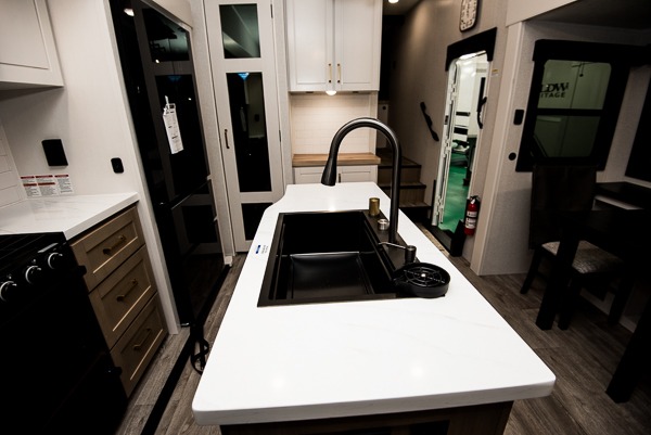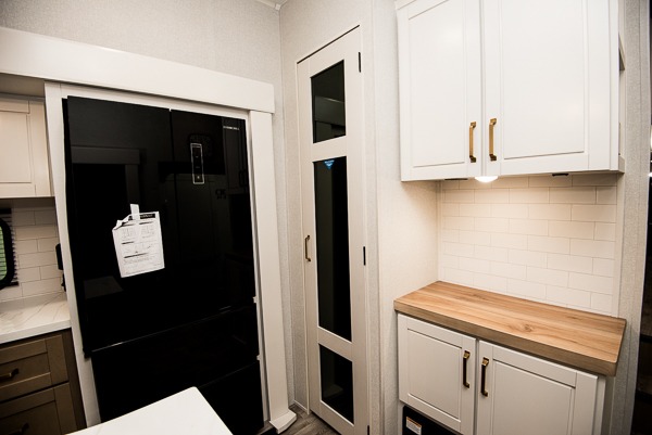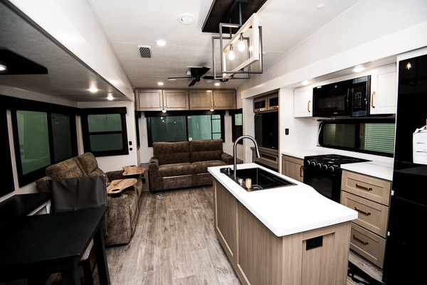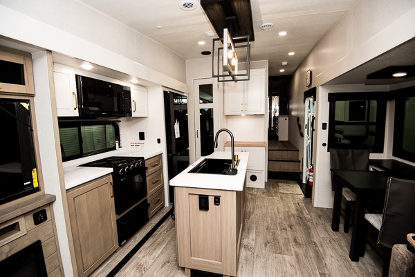 Triple slides for space, plenty of seating spaces, plus a spacious private bedroom make this fifth wheel one you won't want to pass up! You can freshen up each day in the full bath that includes a residential style glass shower door, a bathroom skylight, and a medicine cabinet to keep this space organized. Once you've cut up some fresh fruit at the kitchen island, whip up some eggs and bacon for breakfast, or just grab the cereal from the pantry. There is a spacious 16 cu. ft. 12V refrigerator, plus a hutch where you can store your own coffee machine. Relax on the tri-fold sofa, theater seat, or free-standing table with chairs/bench before heading out for the day. The king bed slide out in the front private bedroom will be waiting for you when you return!