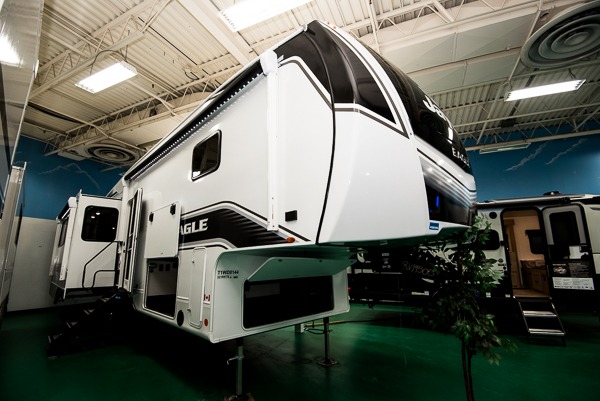 With any Eagle fifth wheel by Jayco you will appreciate durable construction materials, like the Magnum Truss Roof and the Stronghold VBL laminated walls. The JAYCOMMAND Smart RV system puts you in control of your RV's functions, and the 5 Star Handling Package will provide smooth towing from home to camp. Each model features Climate Shield zero-degree tested weather protection and the industry-exclusive HELIX cooling system that features two 15,000 BTU Whisper Quiet A/C's to keep you comfortable year around. Some of the exterior conveniences you are sure to love are the pass-through storage with Slam-Latch baggage doors and an automotive style front cap with max turn radius. The Eagle fifth wheels are designed to make you feel at home with solid hardwood slide fascia, residential vinyl flooring throughout, 100% no floor vents, and blackout roller shades with reflective side throughout for added privacy and insulation.