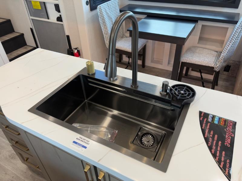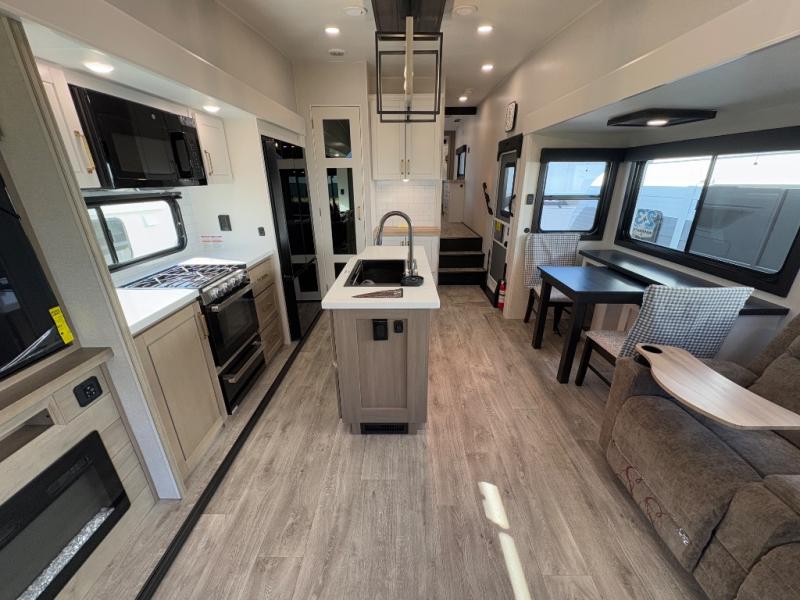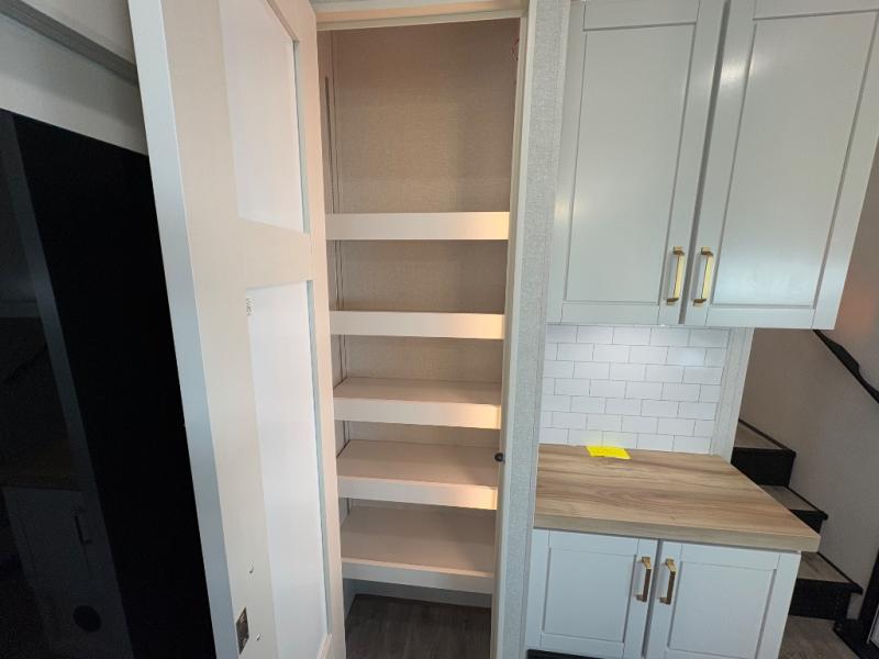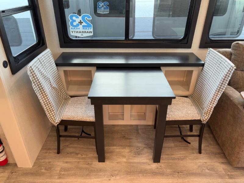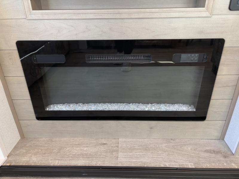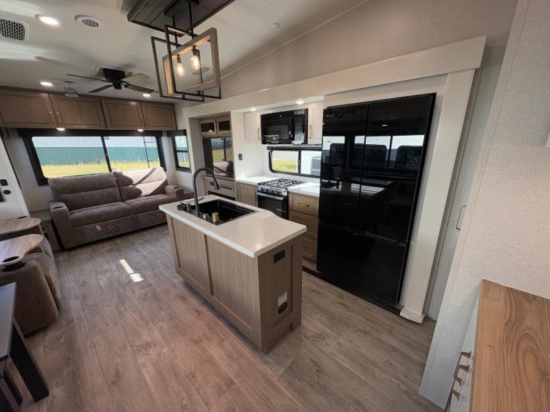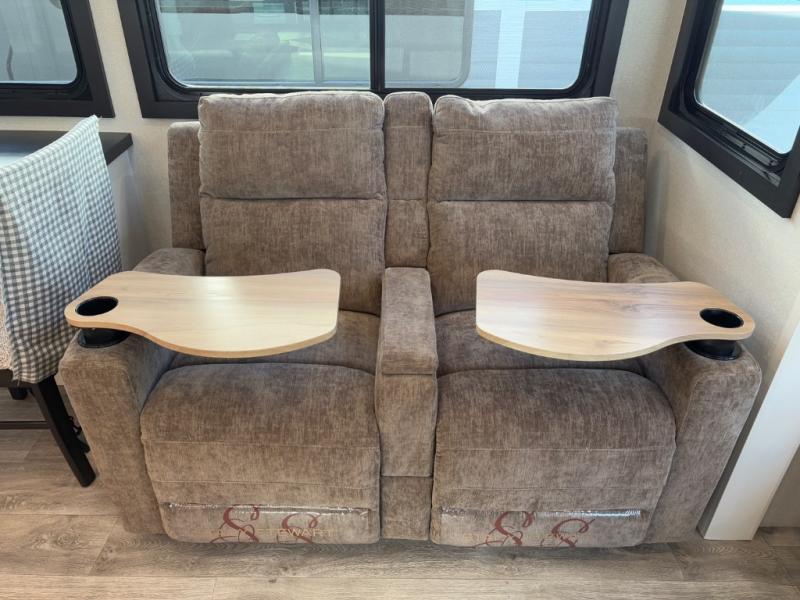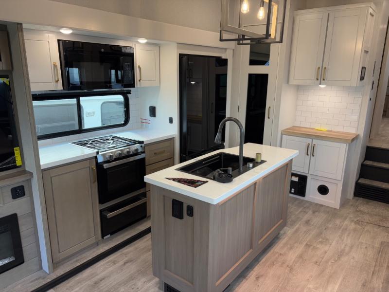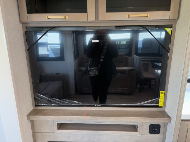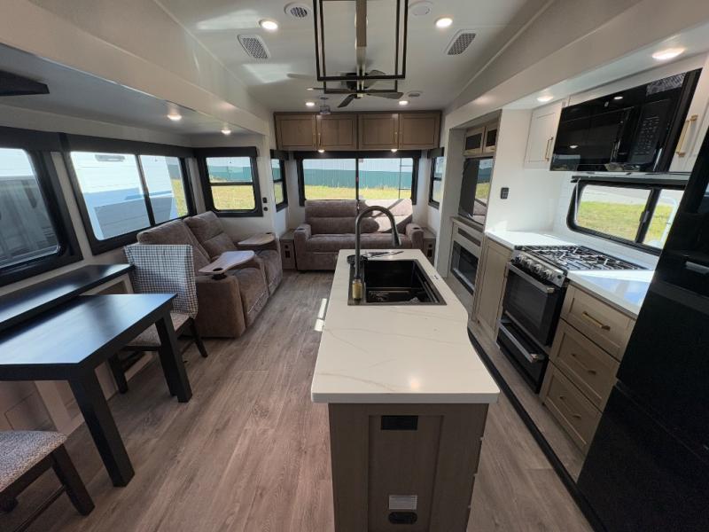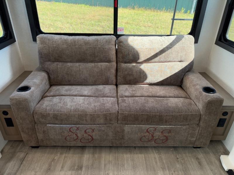 Triple slides for space, plenty of seating spaces, plus a spacious private bedroom make this fifth wheel one you won't want to pass up! You can freshen up each day in the full bath that includes a residential style glass shower door, a bathroom skylight, and a medicine cabinet to keep this space organized. Once you've cut up some fresh fruit at the kitchen island, whip up some eggs and bacon for breakfast, or just grab the cereal from the pantry. There is a spacious 16 cu. ft. 12V refrigerator, plus a hutch where you can store your own coffee machine. Relax on the tri-fold sofa, theater seat, or free-standing table with chairs/bench before heading out for the day. The king bed slide out in the front private bedroom will be waiting for you when you return!
