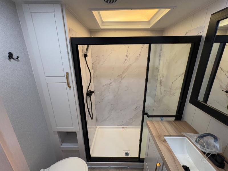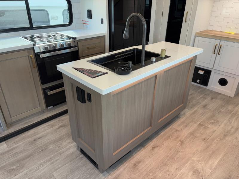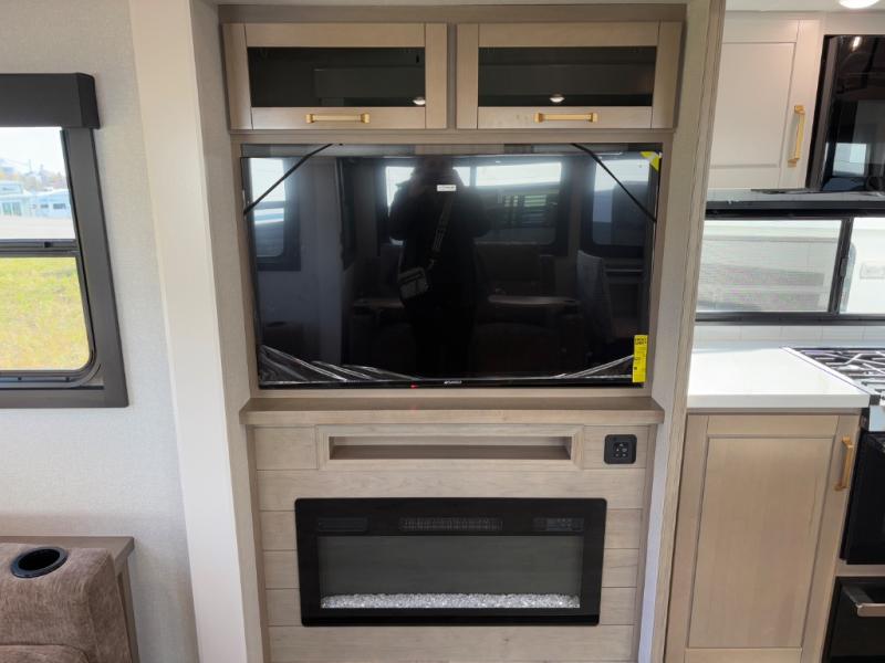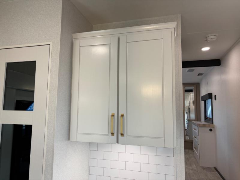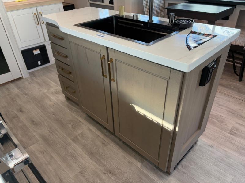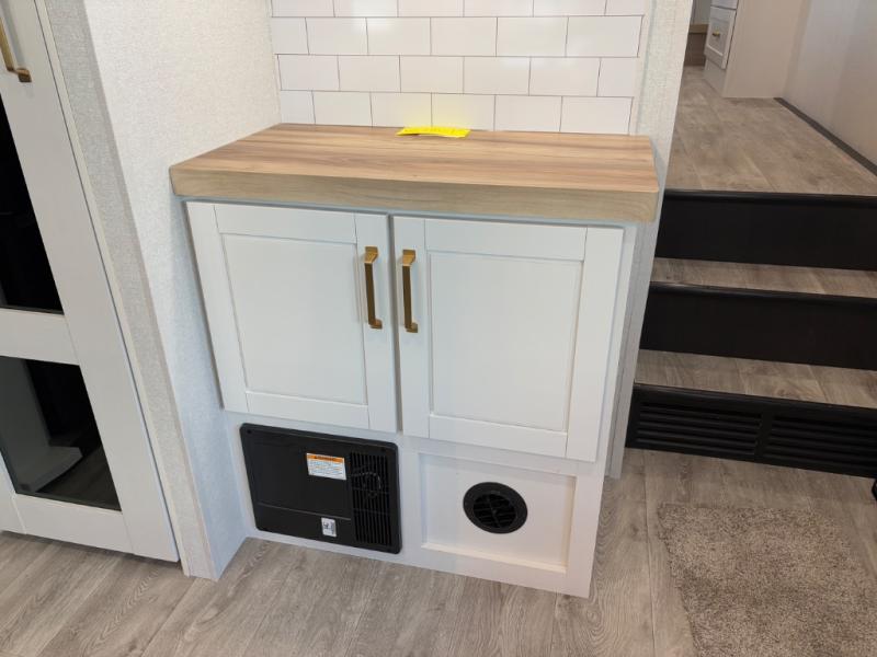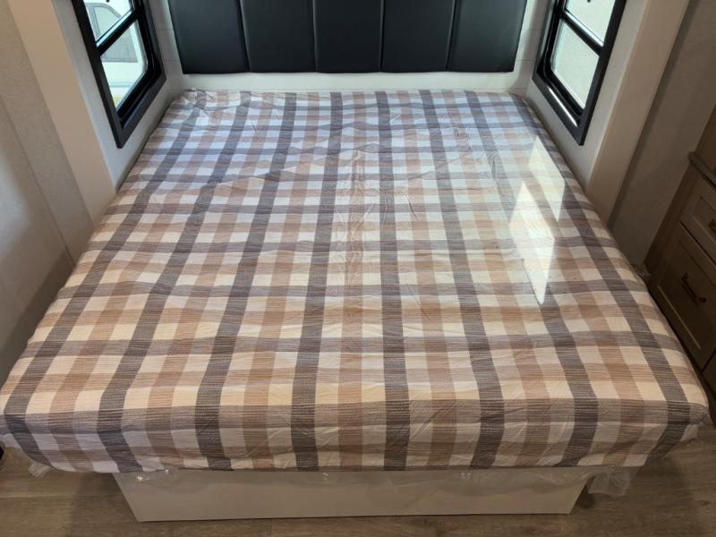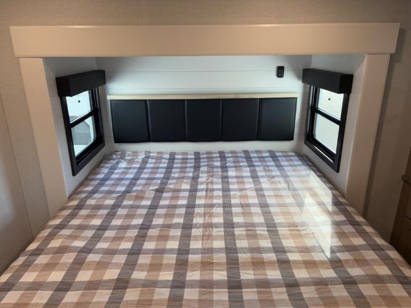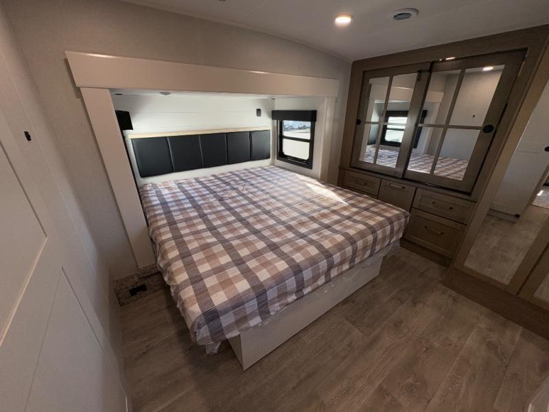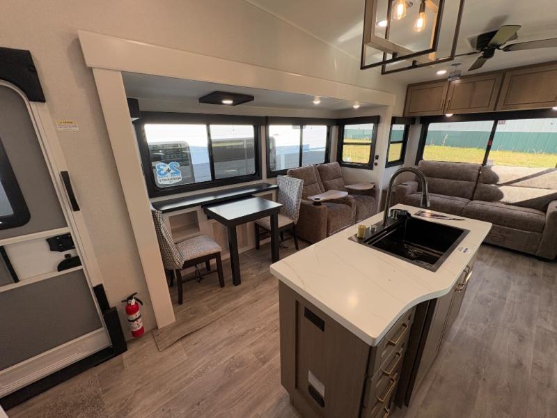 Triple slides for space, plenty of seating spaces, plus a spacious private bedroom make this fifth wheel one you won't want to pass up! You can freshen up each day in the full bath that includes a residential style glass shower door, a bathroom skylight, and a medicine cabinet to keep this space organized. Once you've cut up some fresh fruit at the kitchen island, whip up some eggs and bacon for breakfast, or just grab the cereal from the pantry. There is a spacious 16 cu. ft. 12V refrigerator, plus a hutch where you can store your own coffee machine. Relax on the tri-fold sofa, theater seat, or free-standing table with chairs/bench before heading out for the day. The king bed slide out in the front private bedroom will be waiting for you when you return!