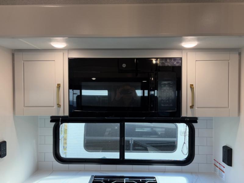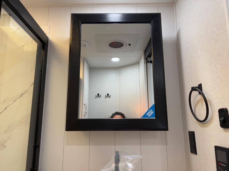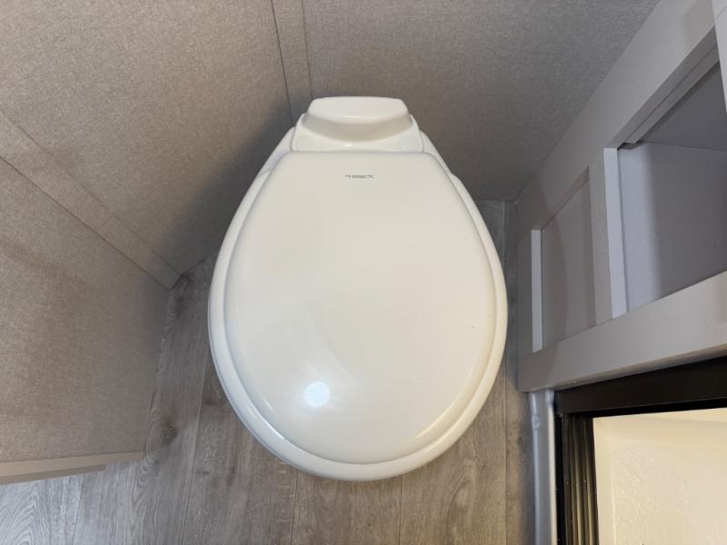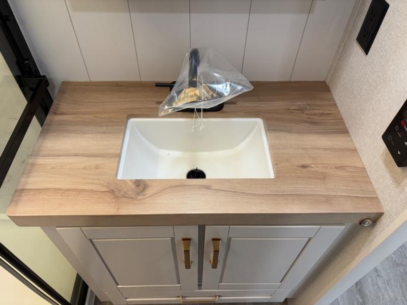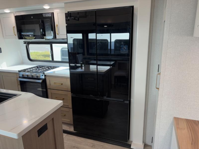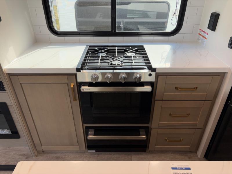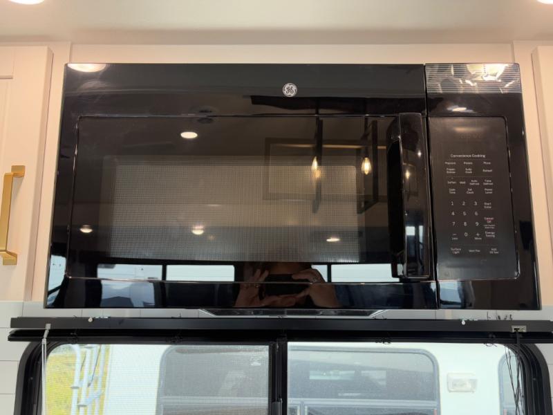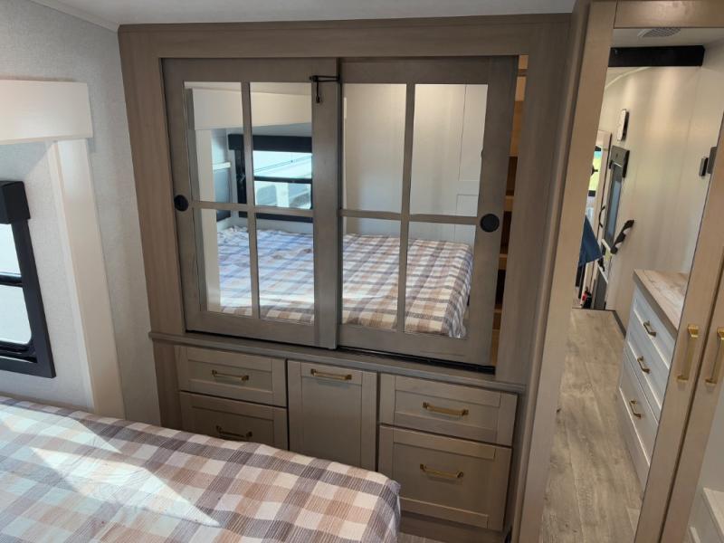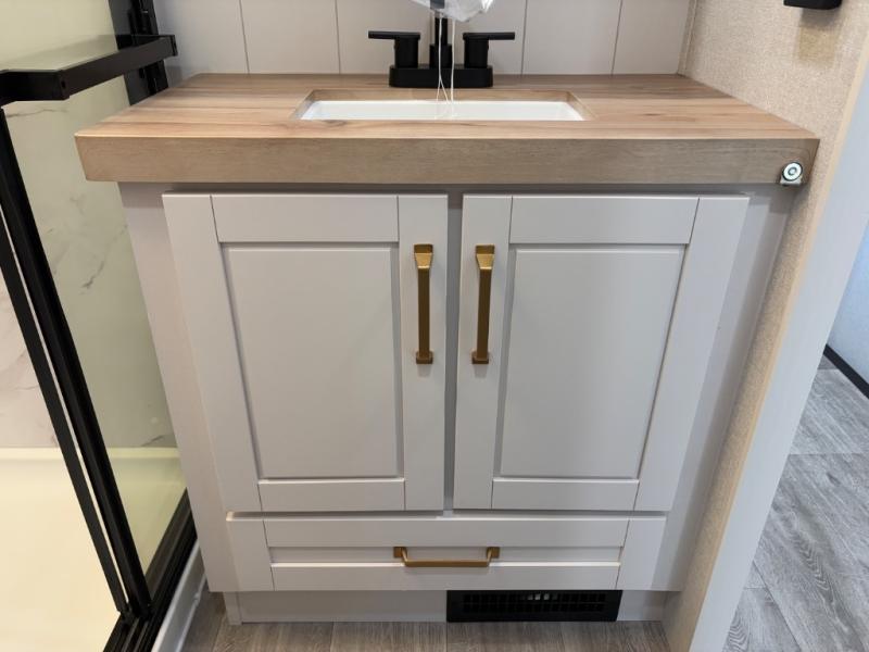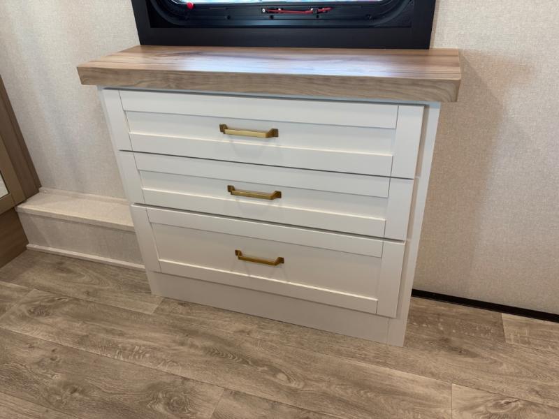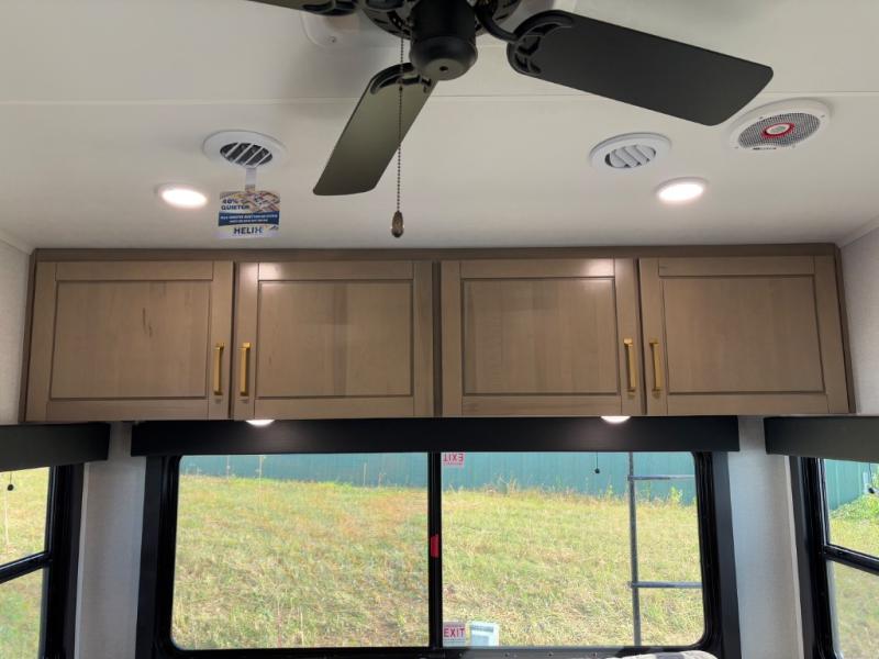 Triple slides for space, plenty of seating spaces, plus a spacious private bedroom make this fifth wheel one you won't want to pass up! You can freshen up each day in the full bath that includes a residential style glass shower door, a bathroom skylight, and a medicine cabinet to keep this space organized. Once you've cut up some fresh fruit at the kitchen island, whip up some eggs and bacon for breakfast, or just grab the cereal from the pantry. There is a spacious 16 cu. ft. 12V refrigerator, plus a hutch where you can store your own coffee machine. Relax on the tri-fold sofa, theater seat, or free-standing table with chairs/bench before heading out for the day. The king bed slide out in the front private bedroom will be waiting for you when you return!