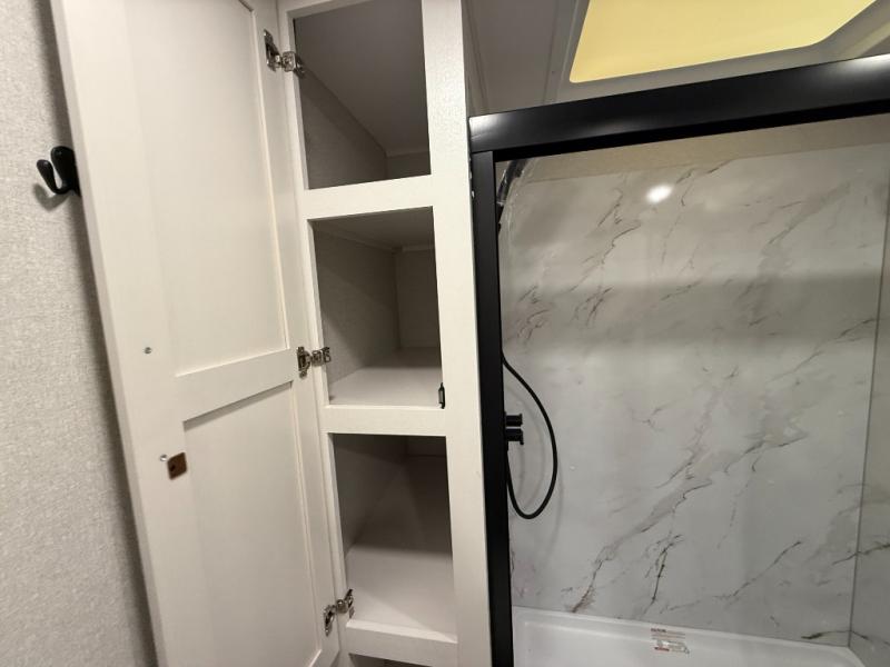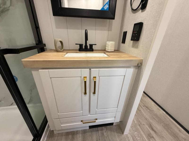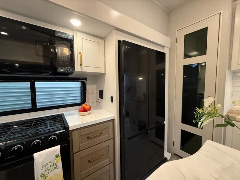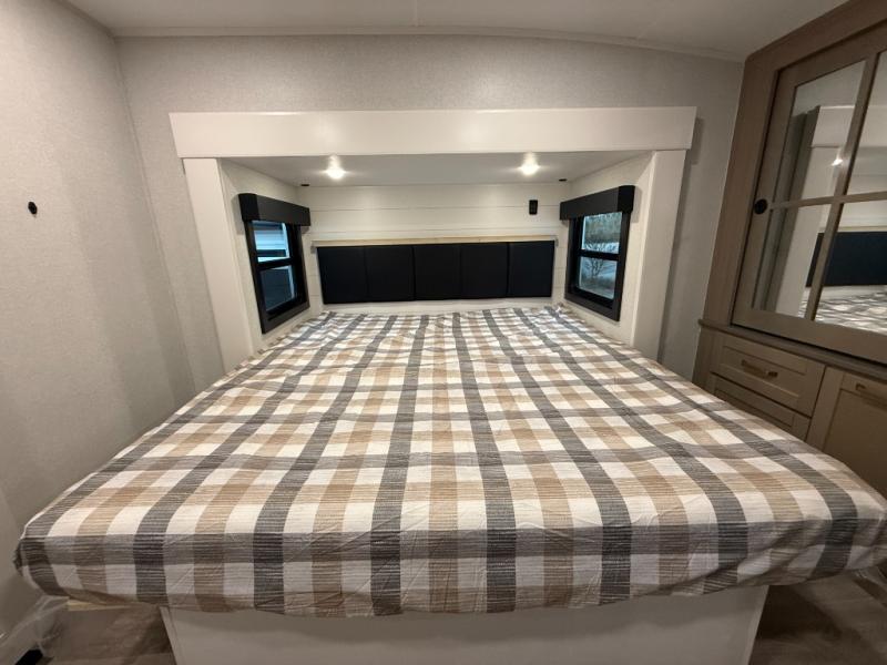 Triple slides for space, plenty of seating spaces, plus a spacious private bedroom make this fifth wheel one you won't want to pass up! You can freshen up each day in the full bath that includes a residential style glass shower door, a bathroom skylight, and a medicine cabinet to keep this space organized. Once you've cut up some fresh fruit at the kitchen island, whip up some eggs and bacon for breakfast, or just grab the cereal from the pantry. There is a spacious 16 cu. ft. 12V refrigerator, plus a hutch where you can store your own coffee machine. Relax on the tri-fold sofa, theater seat, or free-standing table with chairs/bench before heading out for the day. The king bed slide out in the front private bedroom will be waiting for you when you return!