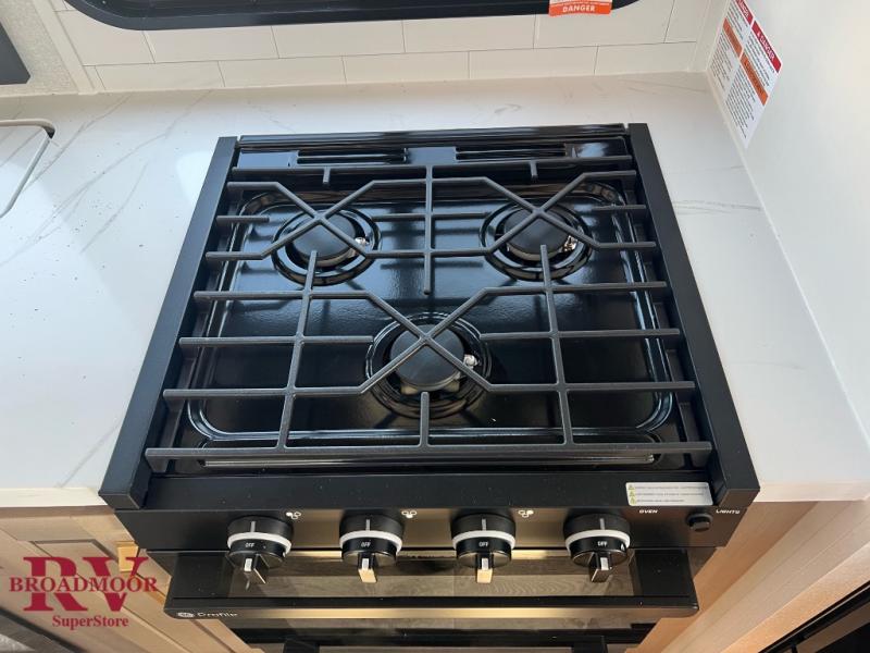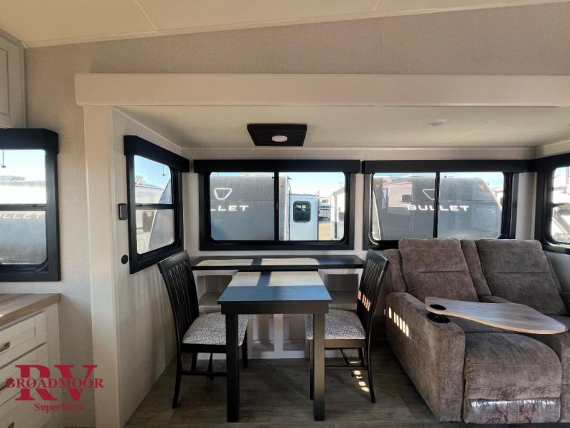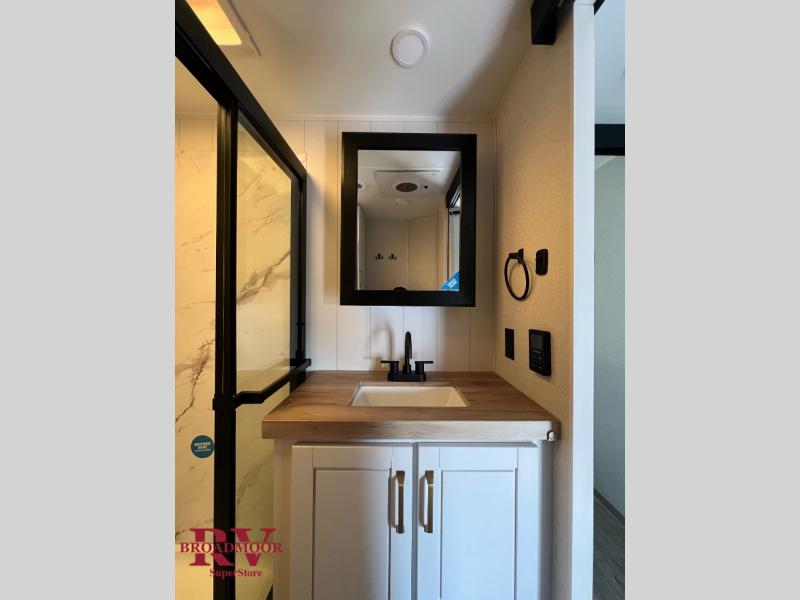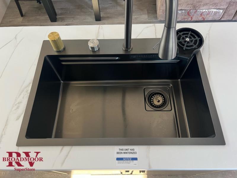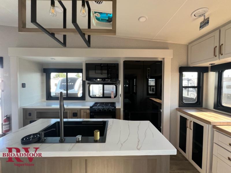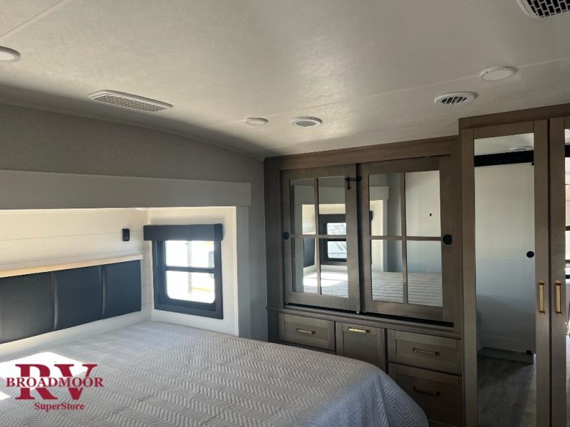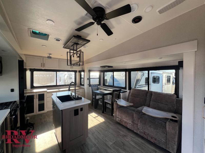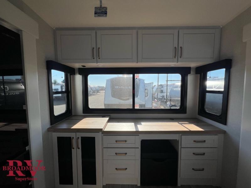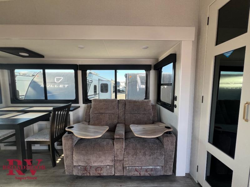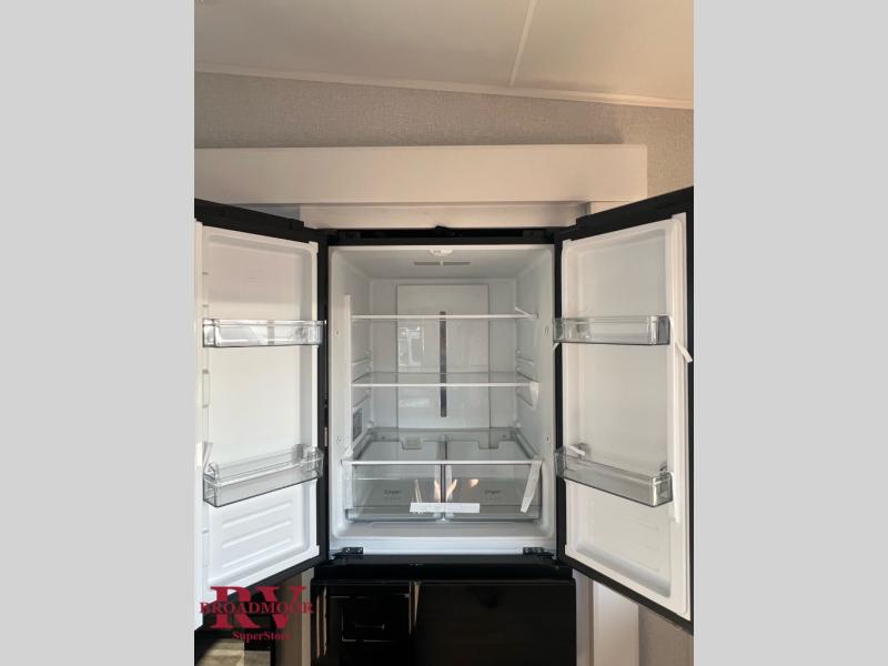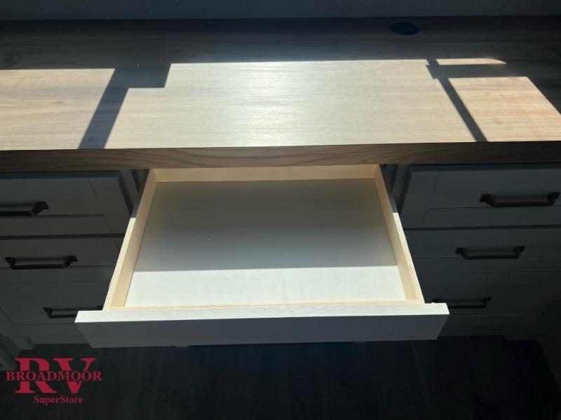 Enjoy time at the campground in this triple slide out fifth wheel! Once you've arrived at the site, you can put out the two power awnings, then stretch your legs on a trail. The fully-equipped kitchen inside will let you make lunch, and there is an exterior sink and griddle option if you like to cook outdoors. There is also a theater sofa with cup holders plus a table and chairs with a bench for cozy seating spaces, and both of these furniture sit across from the entertainment center and fireplace. The spacious front private bedroom in this fifth wheel features a king bed slide out, front shelves with drawers below, a chest with a TV, plus washer and dryer prep if you choose to add these appliances.