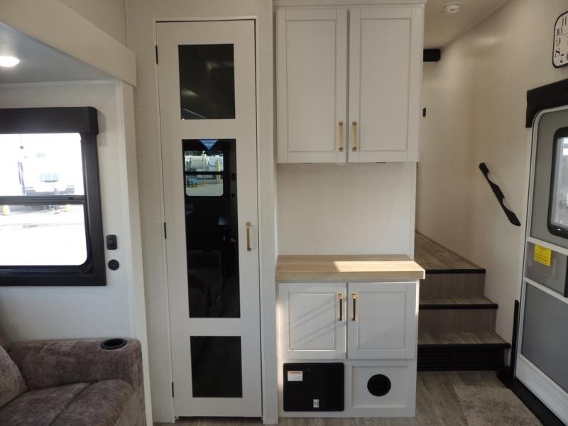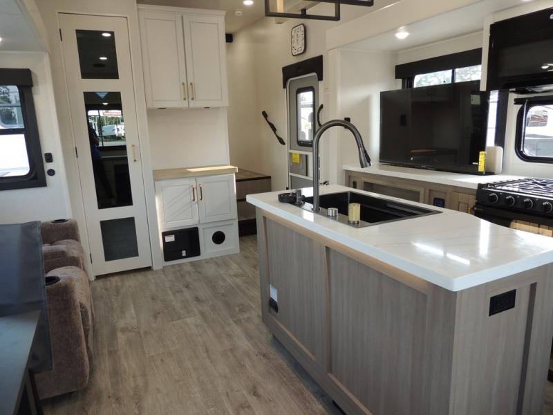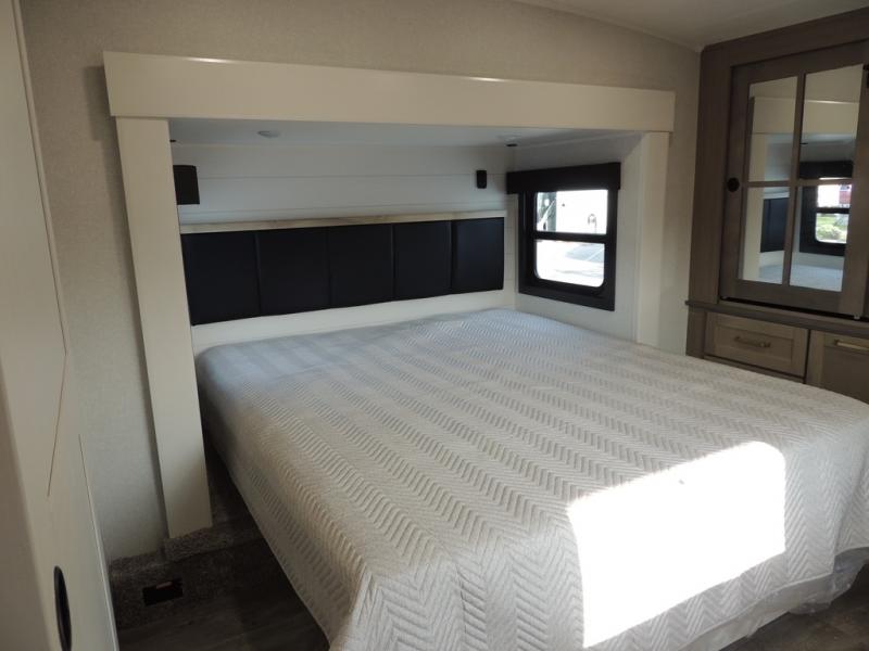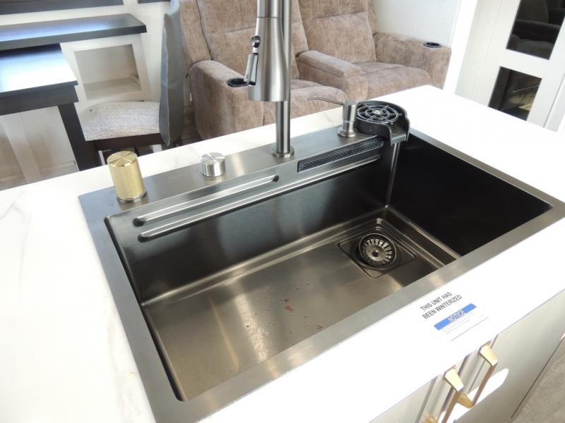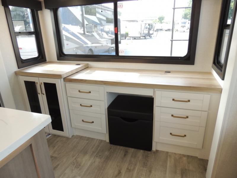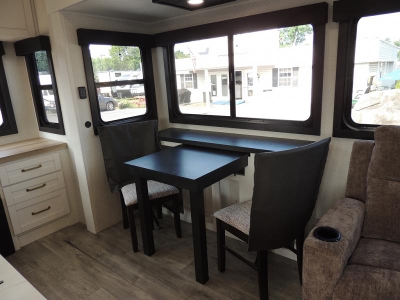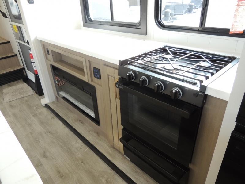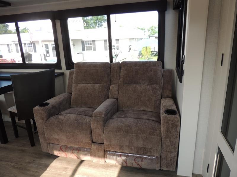 Enjoy time at the campground in this triple slide out fifth wheel! Once you've arrived at the site, you can put out the two power awnings, then stretch your legs on a trail. The fully-equipped kitchen inside will let you make lunch, and there is an exterior sink and griddle option if you like to cook outdoors. There is also a theater sofa with cup holders plus a table and chairs with a bench for cozy seating spaces, and both of these furniture sit across from the entertainment center and fireplace. The spacious front private bedroom in this fifth wheel features a king bed slide out, front shelves with drawers below, a chest with a TV, plus washer and dryer prep if you choose to add these appliances.