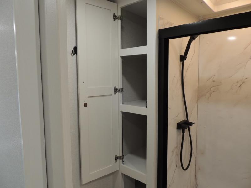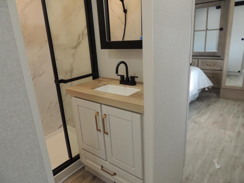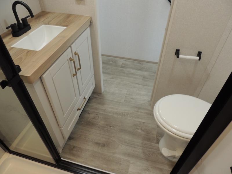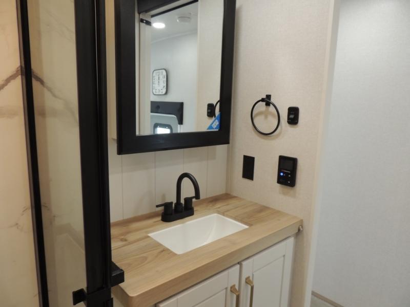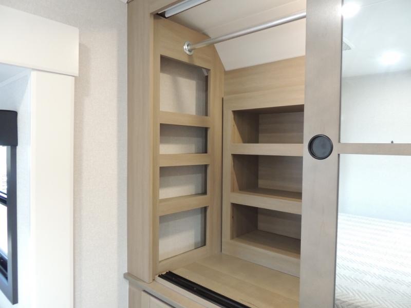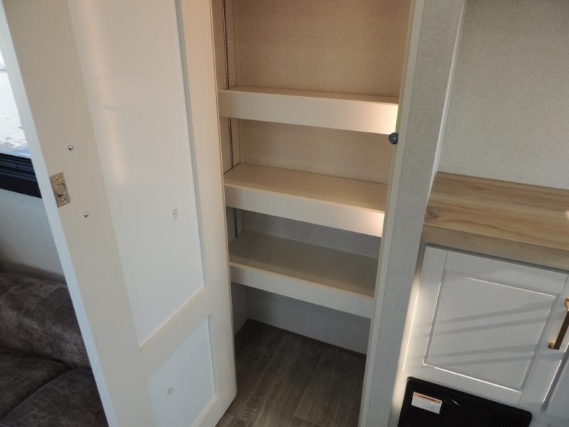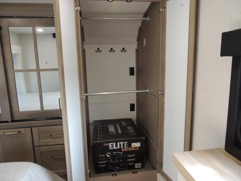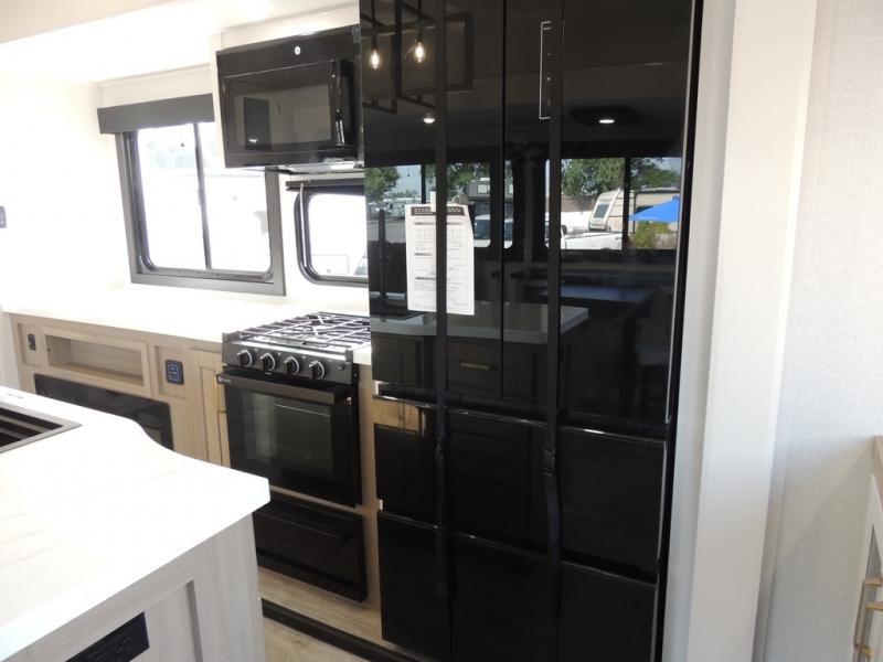 Enjoy time at the campground in this triple slide out fifth wheel! Once you've arrived at the site, you can put out the two power awnings, then stretch your legs on a trail. The fully-equipped kitchen inside will let you make lunch, and there is an exterior sink and griddle option if you like to cook outdoors. There is also a theater sofa with cup holders plus a table and chairs with a bench for cozy seating spaces, and both of these furniture sit across from the entertainment center and fireplace. The spacious front private bedroom in this fifth wheel features a king bed slide out, front shelves with drawers below, a chest with a TV, plus washer and dryer prep if you choose to add these appliances.
