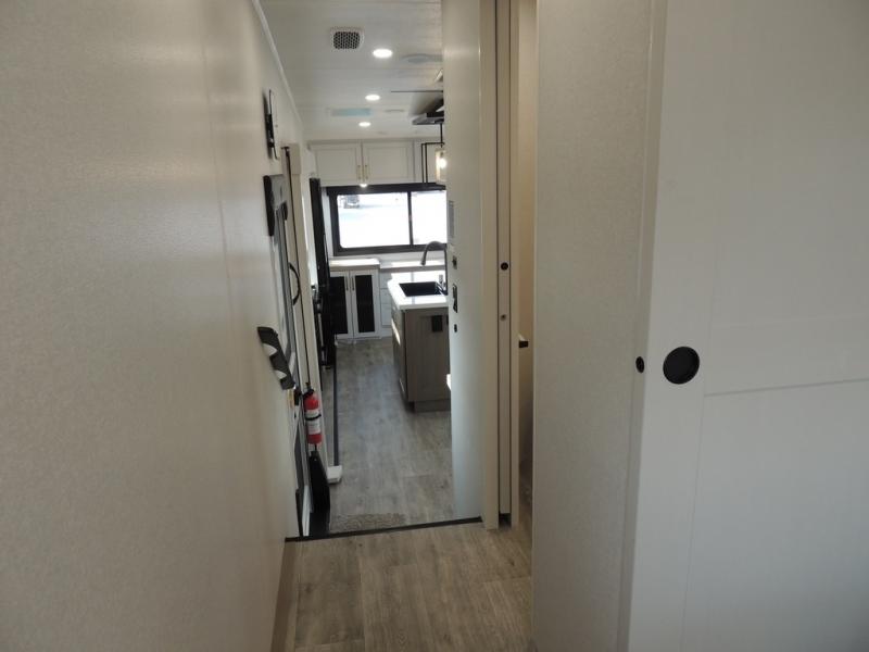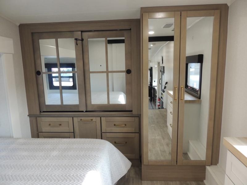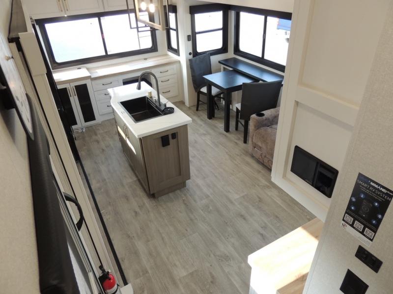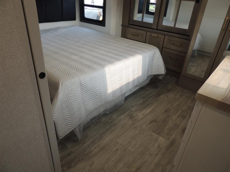 With any Eagle fifth wheel by Jayco you will appreciate durable construction materials, like the Magnum Truss Roof and the Stronghold VBL laminated walls. The JAYCOMMAND Smart RV system puts you in control of your RV's functions, and the 5 Star Handling Package will provide smooth towing from home to camp. Each model features Climate Shield zero-degree tested weather protection and the industry-exclusive HELIX cooling system that features two 15,000 BTU Whisper Quiet A/C's to keep you comfortable year around. Some of the exterior conveniences you are sure to love are the pass-through storage with Slam-Latch baggage doors and an automotive style front cap with max turn radius. The Eagle fifth wheels are designed to make you feel at home with solid hardwood slide fascia, residential vinyl flooring throughout, 100% no floor vents, and blackout roller shades with reflective side throughout for added privacy and insulation.