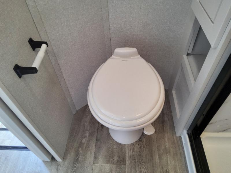 Enjoy time at the campground in this triple slide out fifth wheel! Once you've arrived at the site, you can put out the two power awnings, then stretch your legs on a trail. The fully-equipped kitchen inside will let you make lunch, and there is an exterior sink and griddle option if you like to cook outdoors. There is also a theater sofa with cup holders plus a table and chairs with a bench for cozy seating spaces, and both of these furniture sit across from the entertainment center and fireplace. The spacious front private bedroom in this fifth wheel features a king bed slide out, front shelves with drawers below, a chest with a TV, plus washer and dryer prep if you choose to add these appliances.