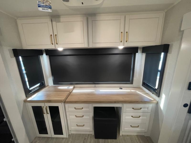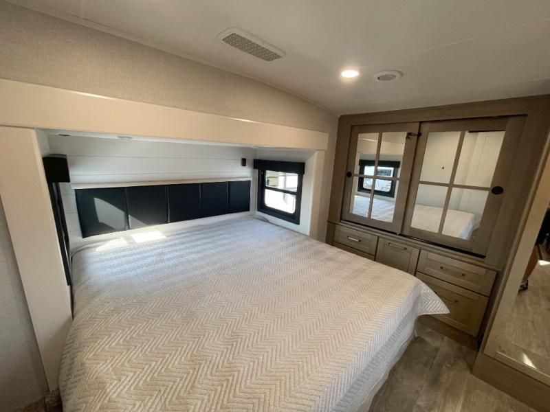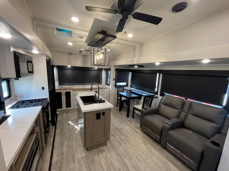 Enjoy time at the campground in this triple slide out fifth wheel! Once you've arrived at the site, you can put out the two power awnings, then stretch your legs on a trail. The fully-equipped kitchen inside will let you make lunch, and there is an exterior sink and griddle option if you like to cook outdoors. There is also a theater sofa with cup holders plus a table and chairs with a bench for cozy seating spaces, and both of these furniture sit across from the entertainment center and fireplace. The spacious front private bedroom in this fifth wheel features a king bed slide out, front shelves with drawers below, a chest with a TV, plus washer and dryer prep if you choose to add these appliances.
