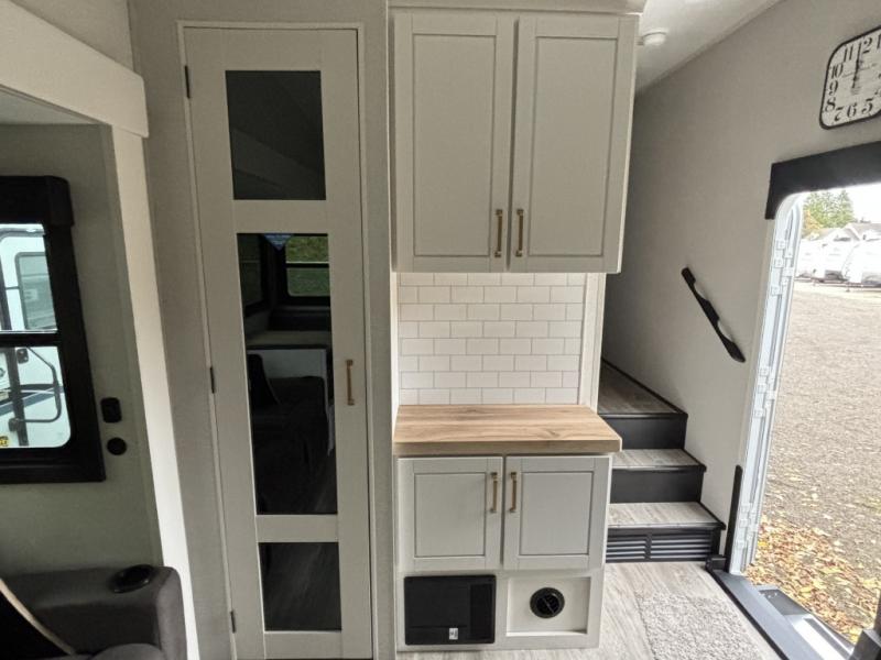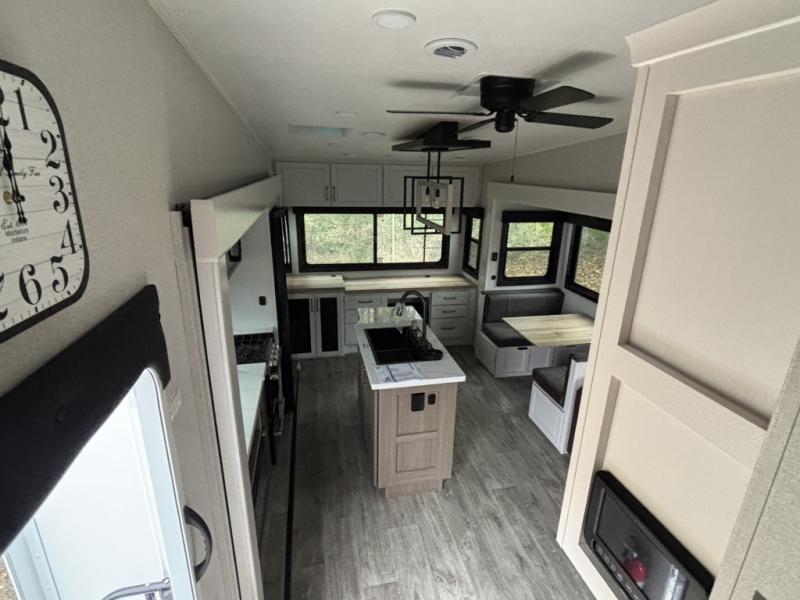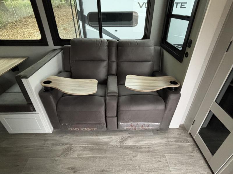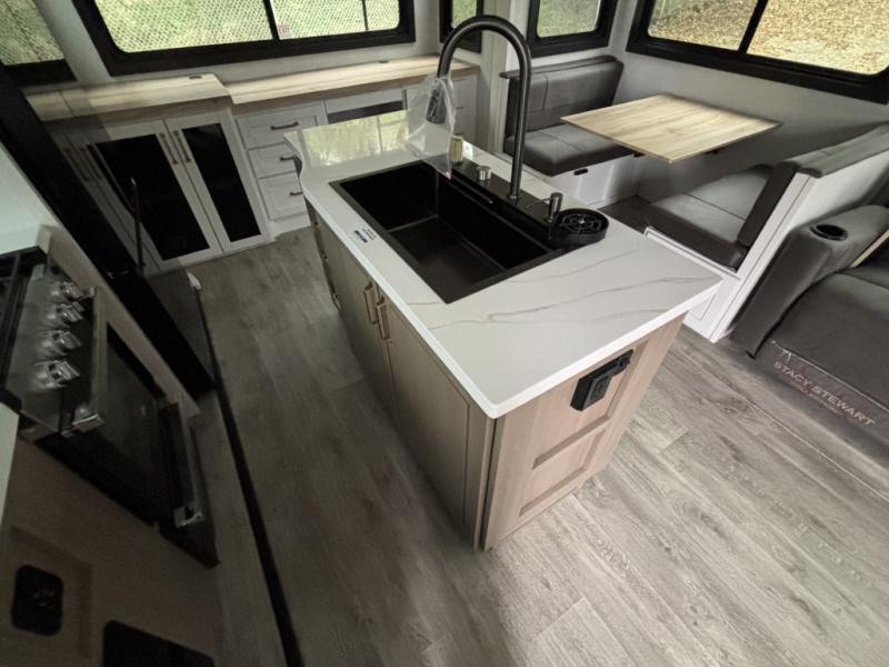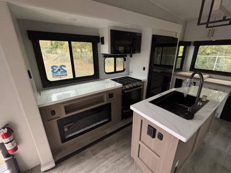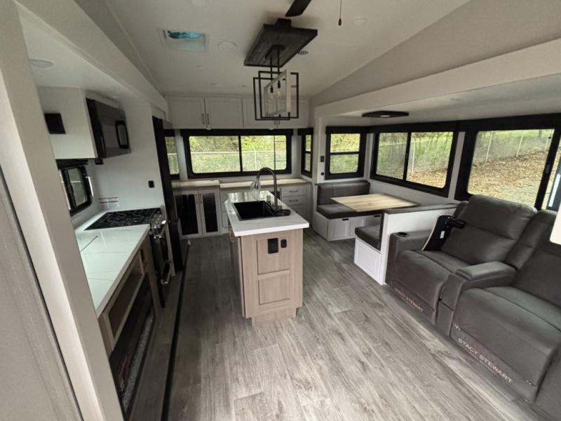 Enjoy time at the campground in this triple slide out fifth wheel! Once you've arrived at the site, you can put out the two power awnings, then stretch your legs on a trail. The fully-equipped kitchen inside will let you make lunch, and there is an exterior sink and griddle option if you like to cook outdoors. There is also a theater sofa with cup holders plus a table and chairs with a bench for cozy seating spaces, and both of these furniture sit across from the entertainment center and fireplace. The spacious front private bedroom in this fifth wheel features a king bed slide out, front shelves with drawers below, a chest with a TV, plus washer and dryer prep if you choose to add these appliances.