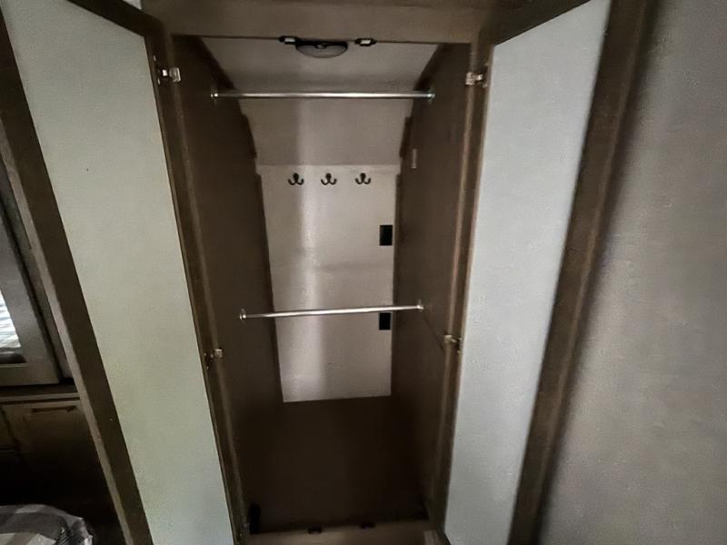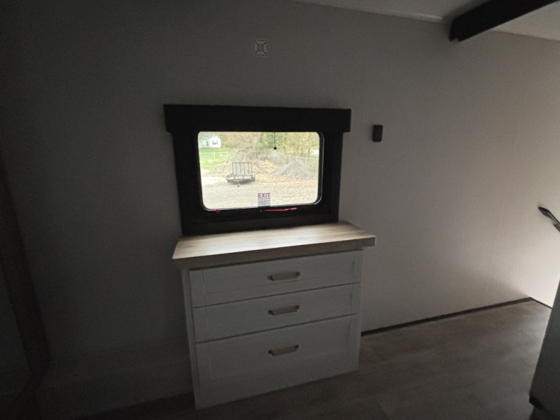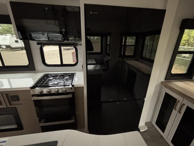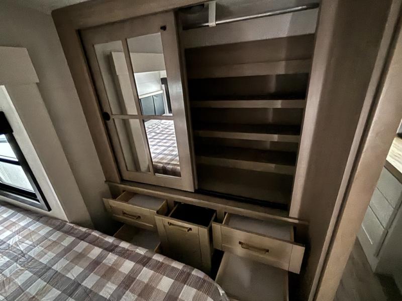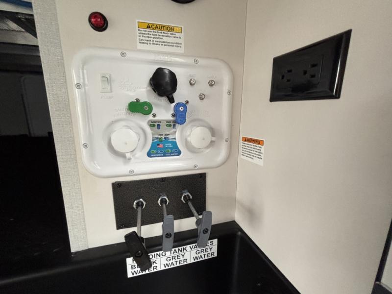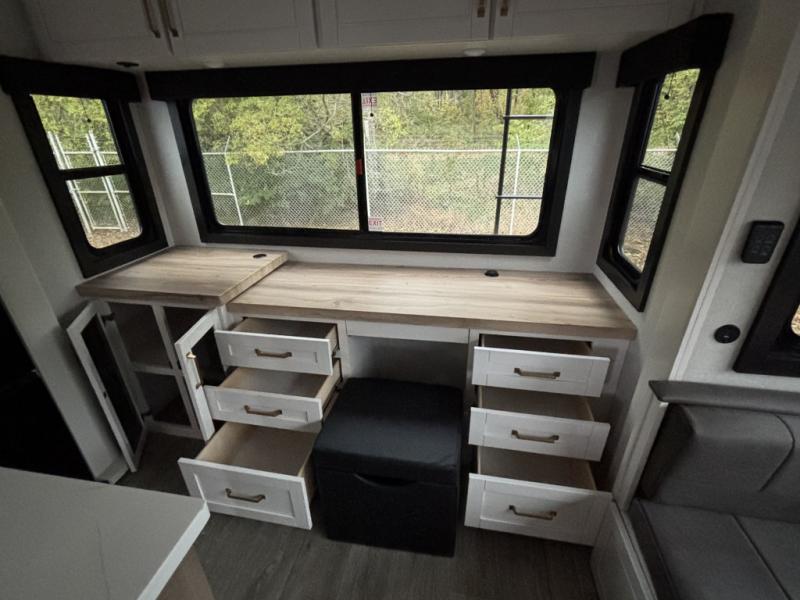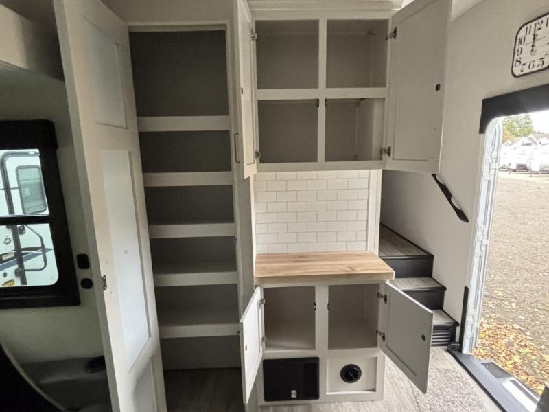 Enjoy time at the campground in this triple slide out fifth wheel! Once you've arrived at the site, you can put out the two power awnings, then stretch your legs on a trail. The fully-equipped kitchen inside will let you make lunch, and there is an exterior sink and griddle option if you like to cook outdoors. There is also a theater sofa with cup holders plus a table and chairs with a bench for cozy seating spaces, and both of these furniture sit across from the entertainment center and fireplace. The spacious front private bedroom in this fifth wheel features a king bed slide out, front shelves with drawers below, a chest with a TV, plus washer and dryer prep if you choose to add these appliances.
