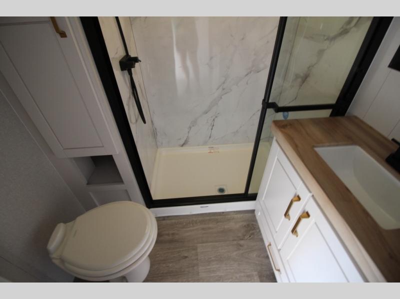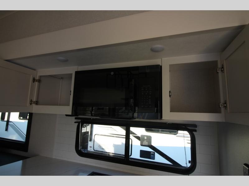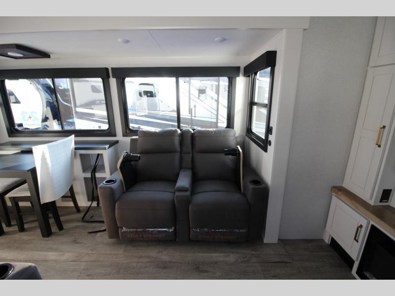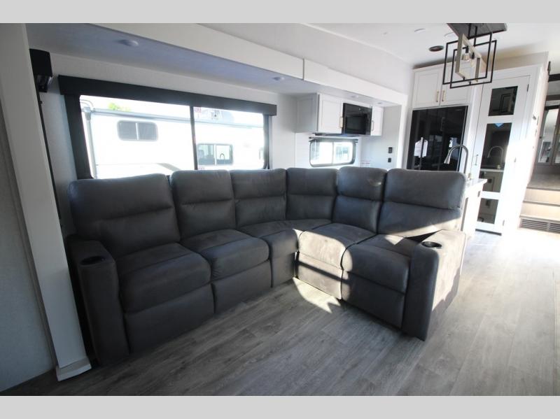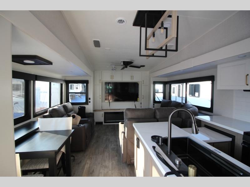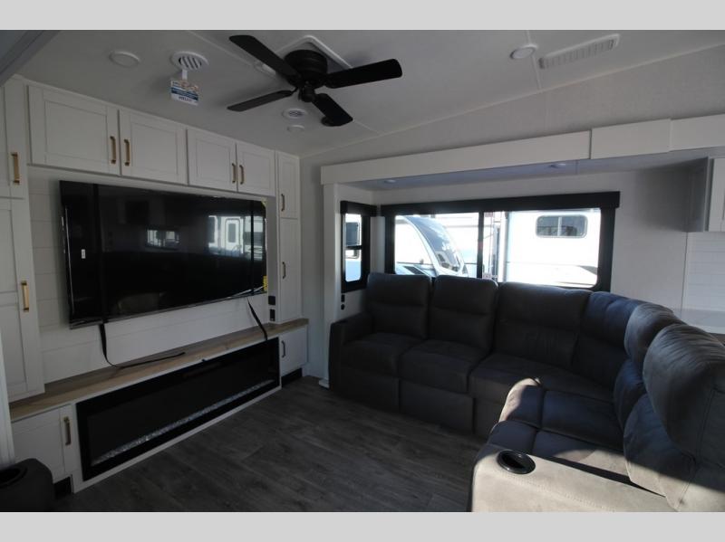 It will be so easy to enjoy time in this spacious fifth wheel! The rear living area includes an entertainment center with a fireplace across from the L-shaped sofa for movie nights. There is also a theater sofa with cup holders plus a roll-top dinette with two chairs to dine at. The chef of your group will love the generous counter space in the middle kitchen, and there is a large pantry to keep food stocked. Heading up front, you'll find the spacious bathroom that includes a shower with a seat, and the front private bedroom with a king bed slide out. There is also a chest with a TV, front shelves with drawers, plus washer and dryer prep!