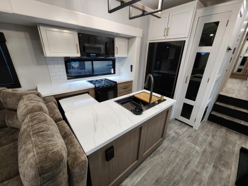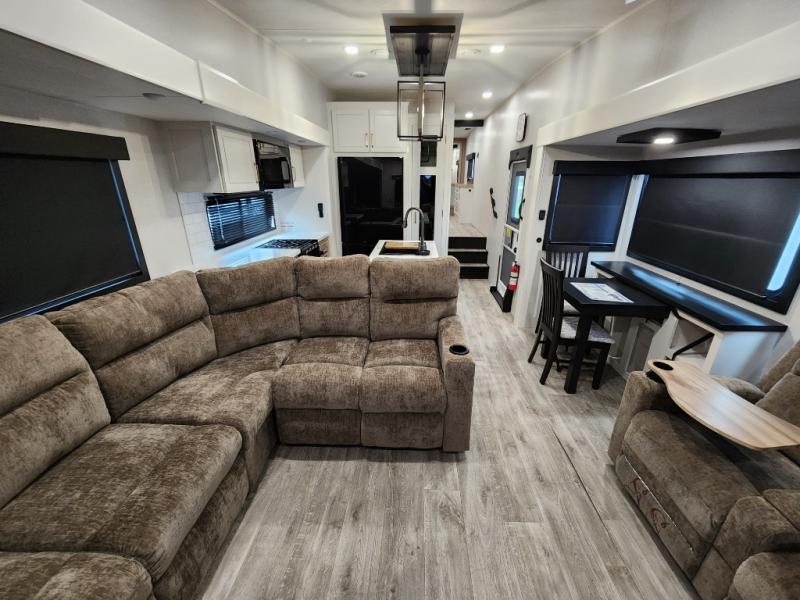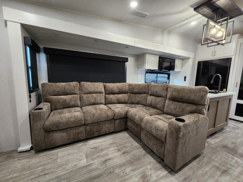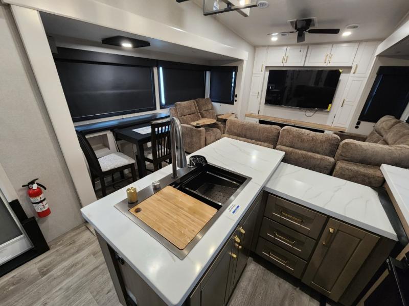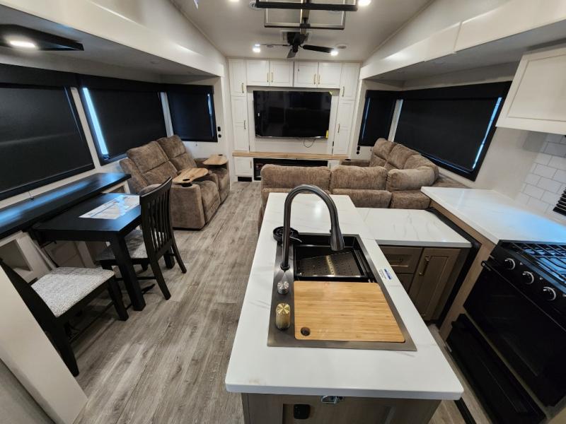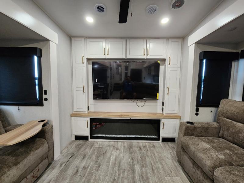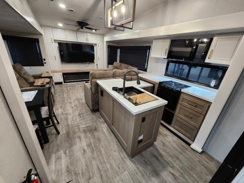 It will be so easy to enjoy time in this spacious fifth wheel! The rear living area includes an entertainment center with a fireplace across from the L-shaped sofa for movie nights. There is also a theater sofa with cup holders plus a roll-top dinette with two chairs to dine at. The chef of your group will love the generous counter space in the middle kitchen, and there is a large pantry to keep food stocked. Heading up front, you'll find the spacious bathroom that includes a shower with a seat, and the front private bedroom with a king bed slide out. There is also a chest with a TV, front shelves with drawers, plus washer and dryer prep!