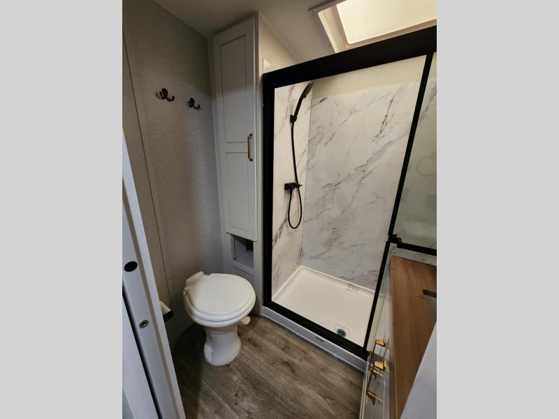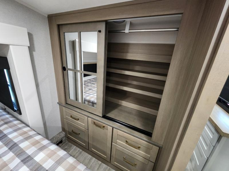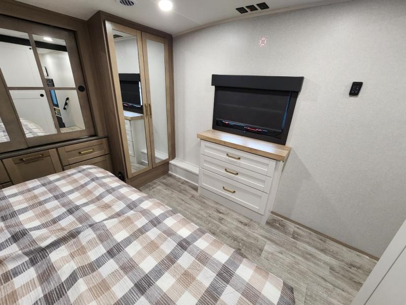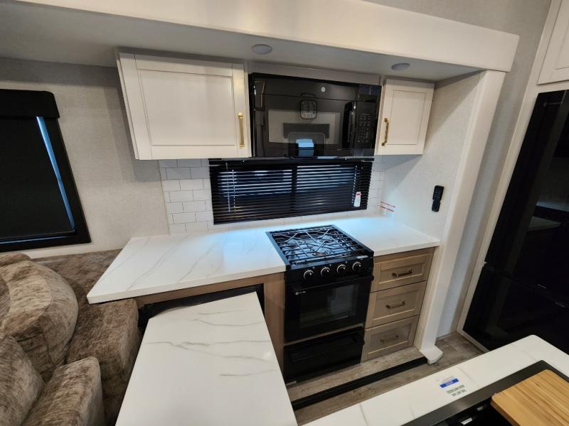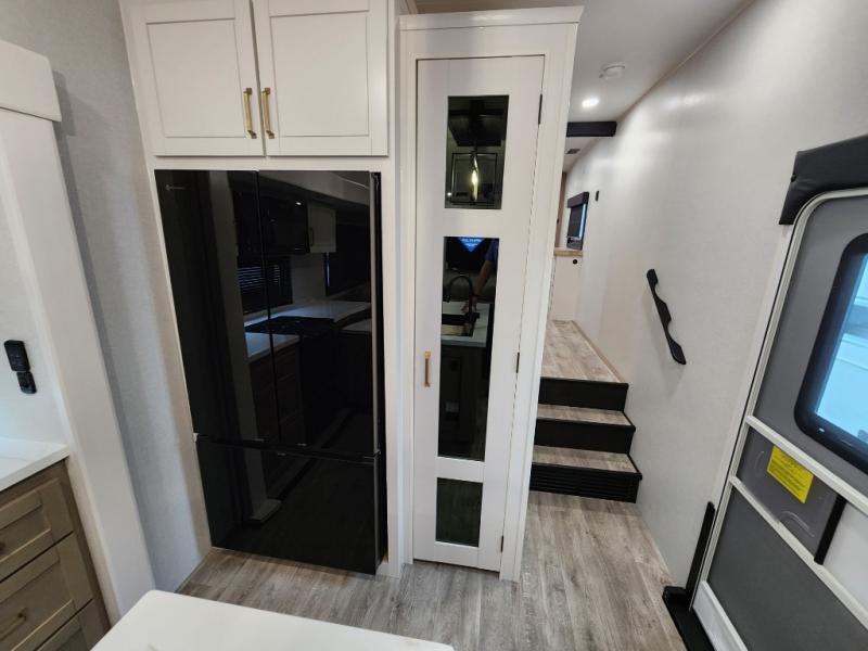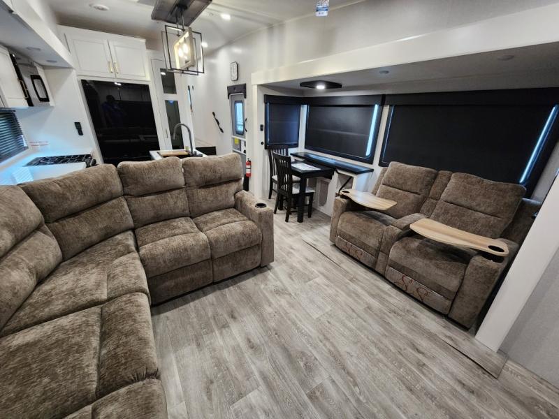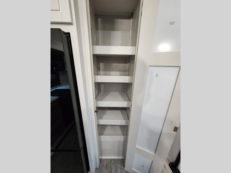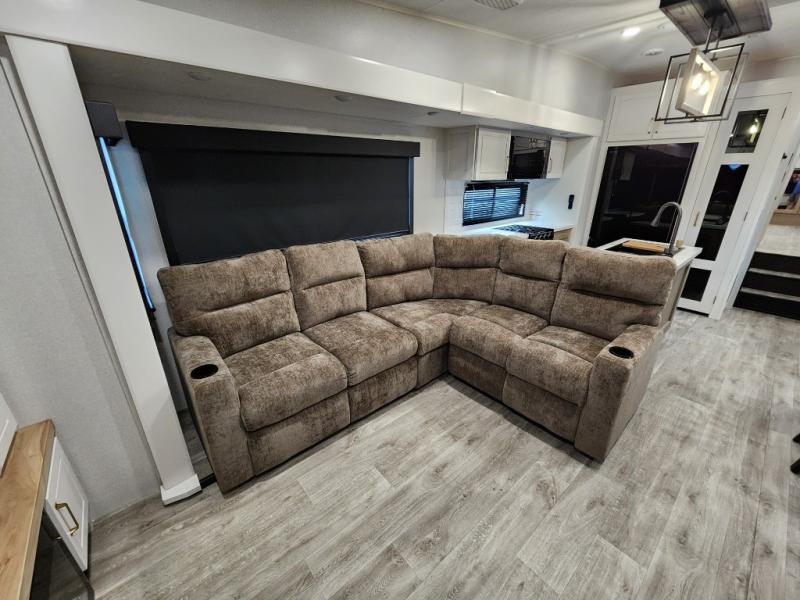 It will be so easy to enjoy time in this spacious fifth wheel! The rear living area includes an entertainment center with a fireplace across from the L-shaped sofa for movie nights. There is also a theater sofa with cup holders plus a roll-top dinette with two chairs to dine at. The chef of your group will love the generous counter space in the middle kitchen, and there is a large pantry to keep food stocked. Heading up front, you'll find the spacious bathroom that includes a shower with a seat, and the front private bedroom with a king bed slide out. There is also a chest with a TV, front shelves with drawers, plus washer and dryer prep!