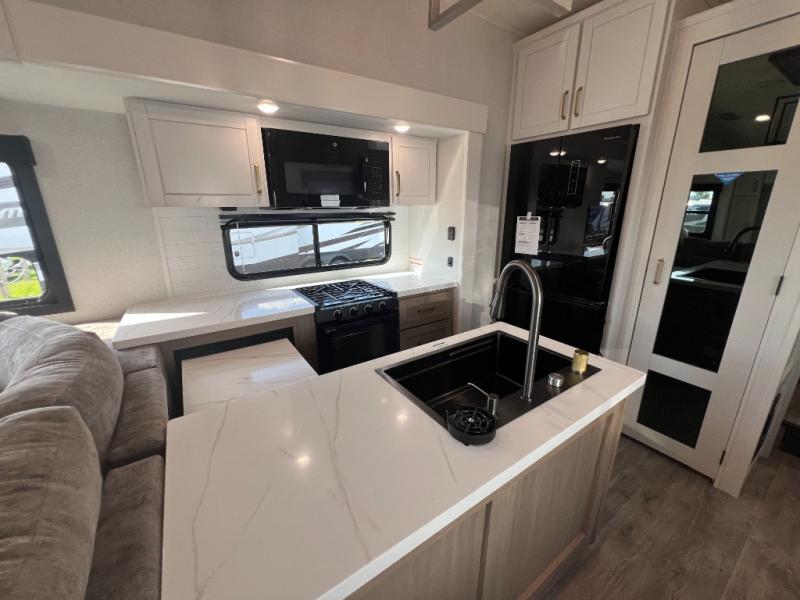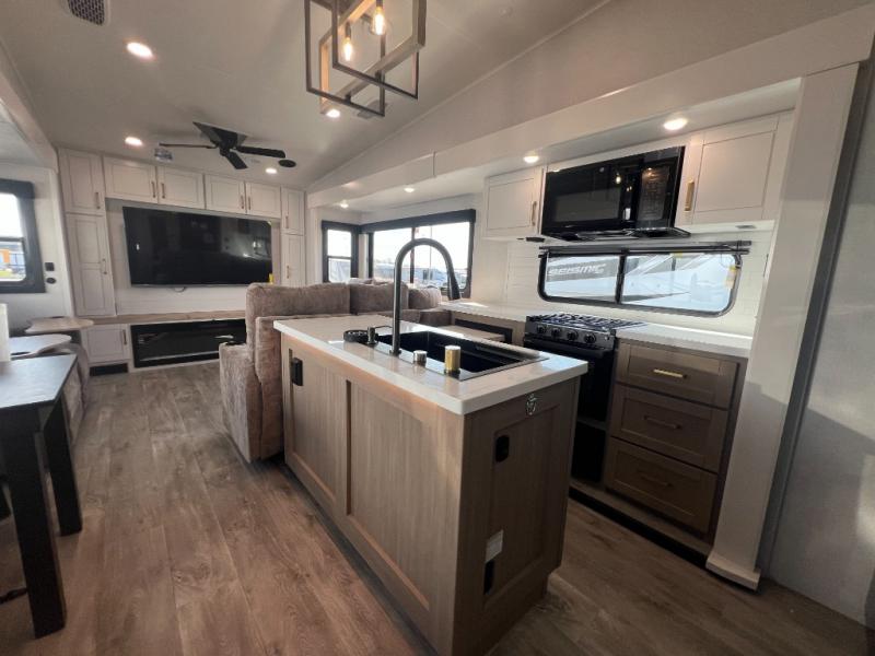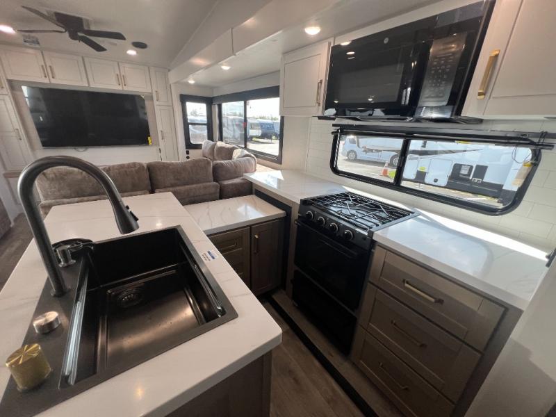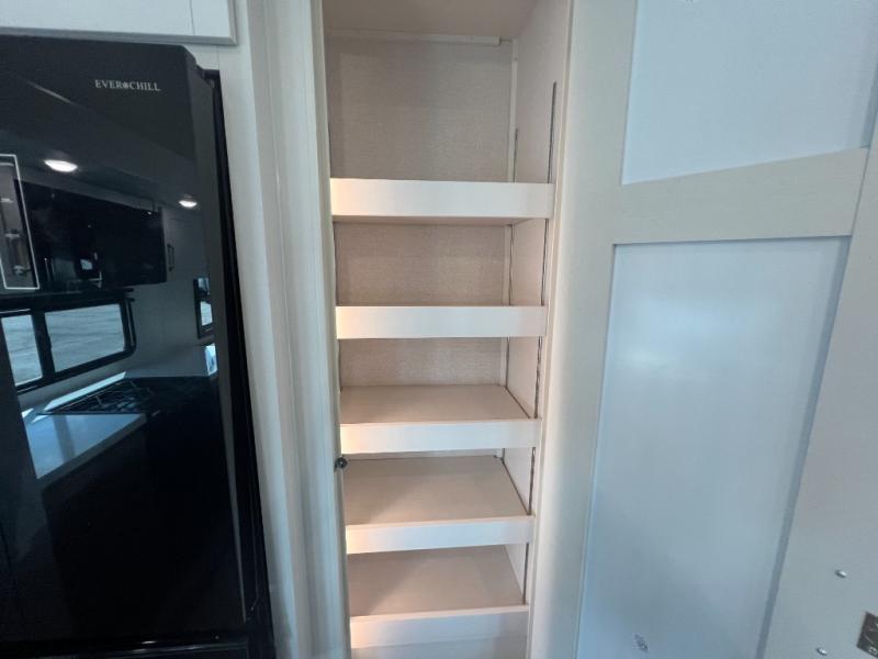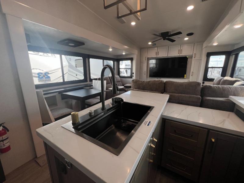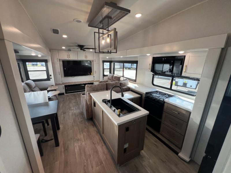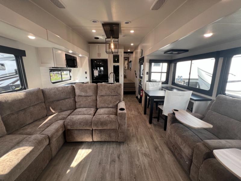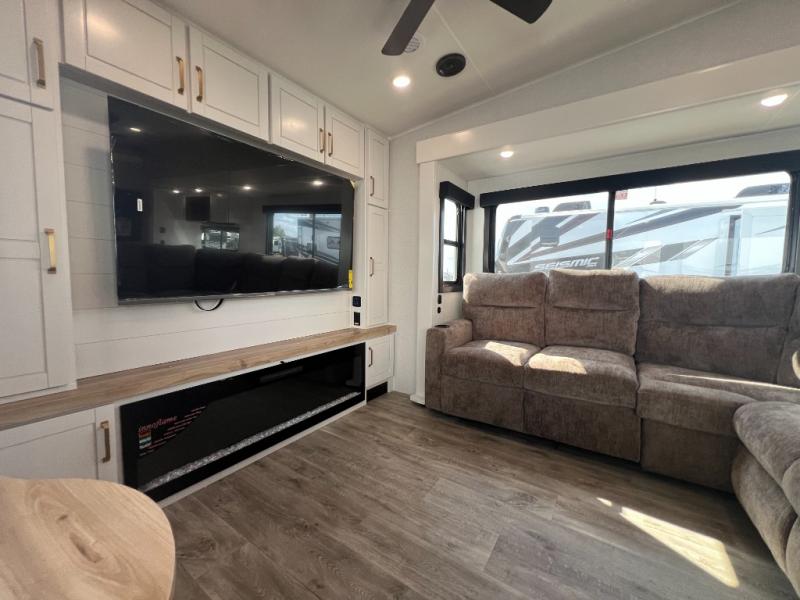 It will be so easy to enjoy time in this spacious fifth wheel! The rear living area includes an entertainment center with a fireplace across from the L-shaped sofa for movie nights. There is also a theater sofa with cup holders plus a roll-top dinette with two chairs to dine at. The chef of your group will love the generous counter space in the middle kitchen, and there is a large pantry to keep food stocked. Heading up front, you'll find the spacious bathroom that includes a shower with a seat, and the front private bedroom with a king bed slide out. There is also a chest with a TV, front shelves with drawers, plus washer and dryer prep!