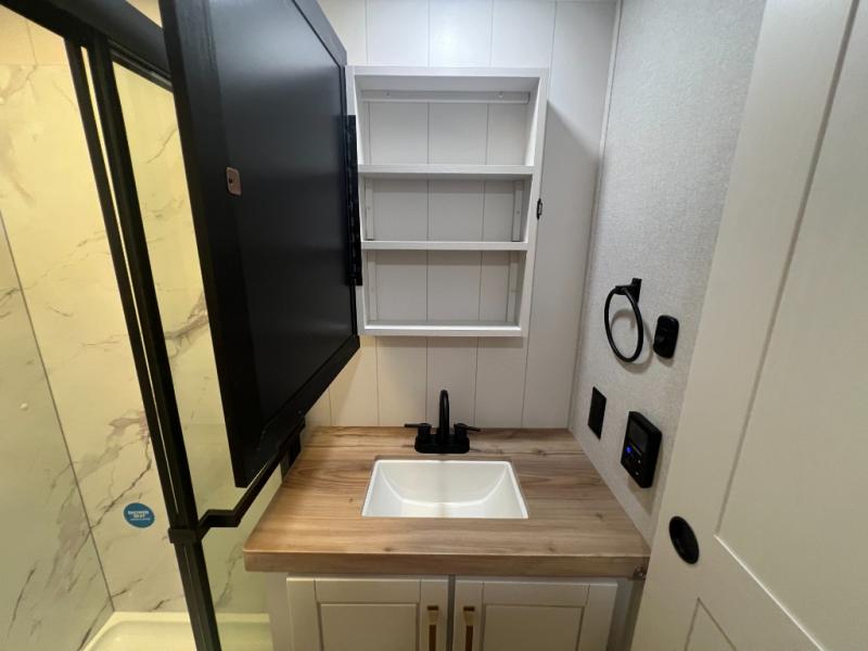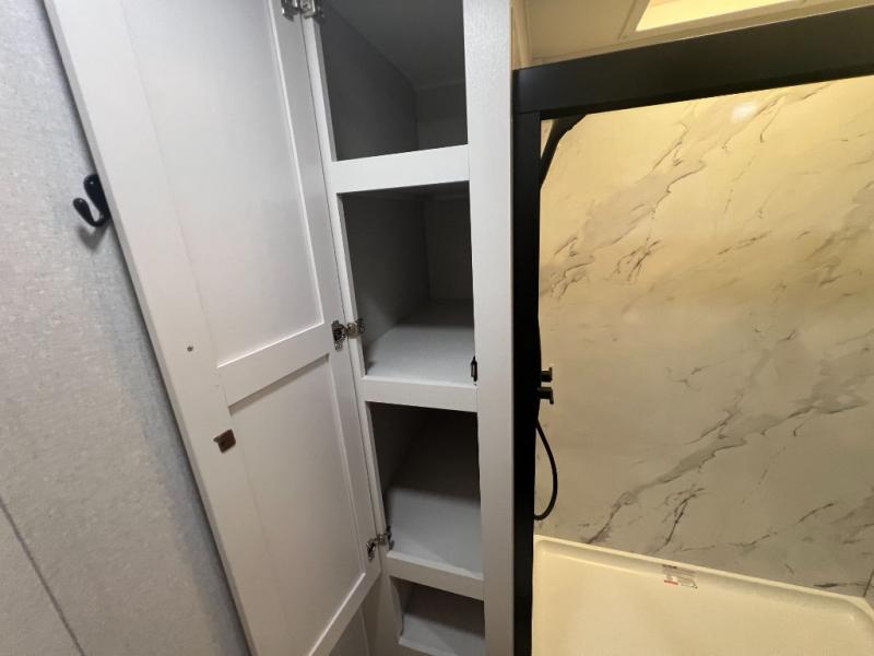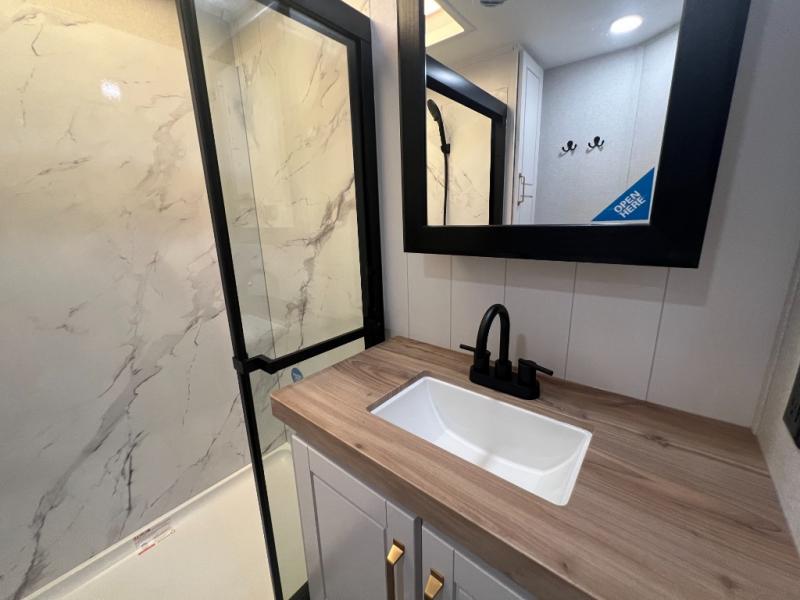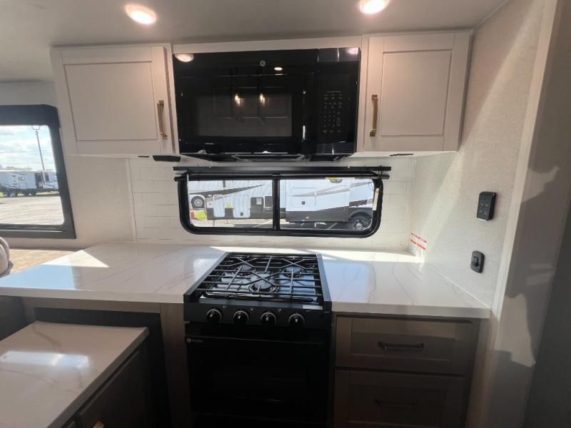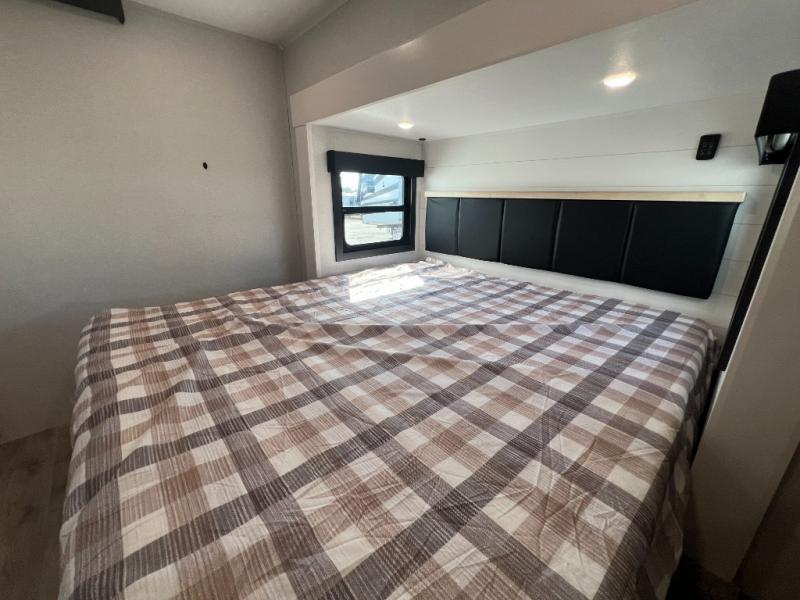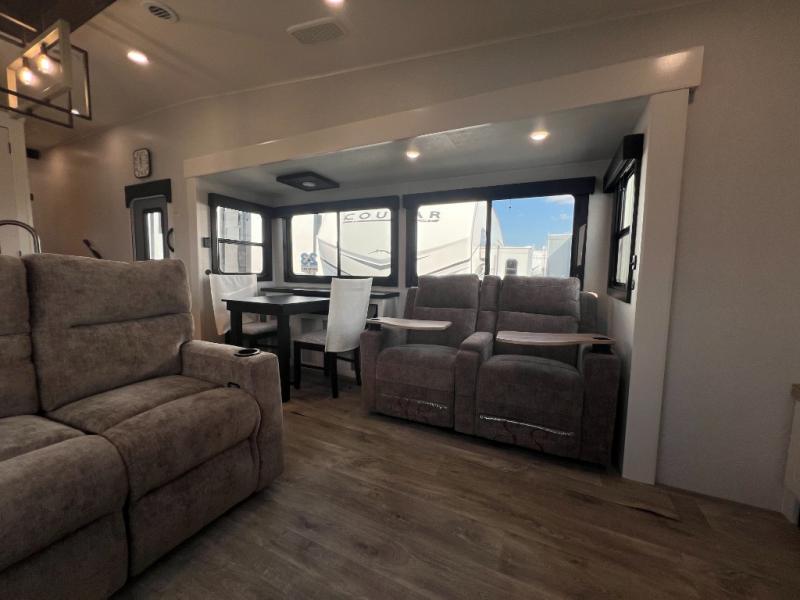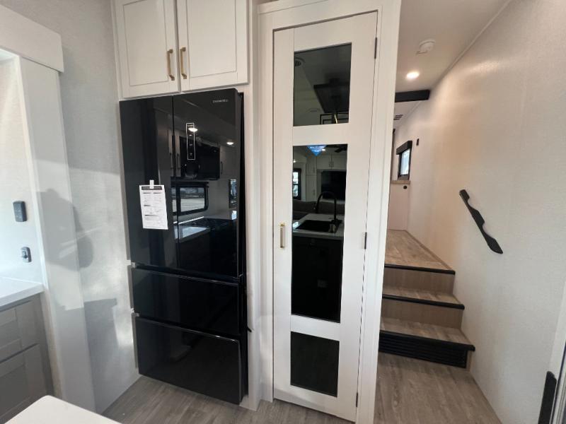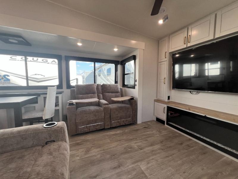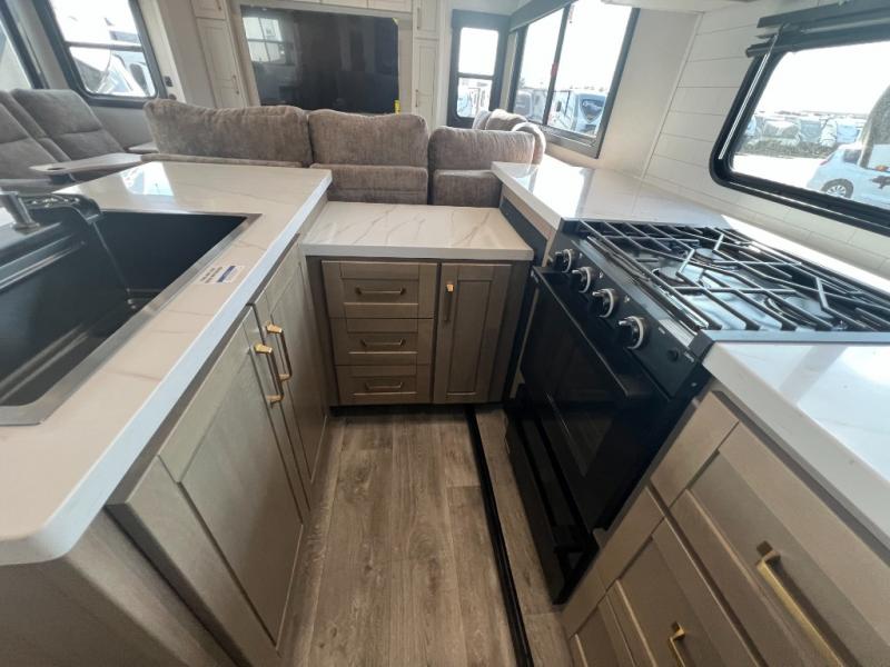 It will be so easy to enjoy time in this spacious fifth wheel! The rear living area includes an entertainment center with a fireplace across from the L-shaped sofa for movie nights. There is also a theater sofa with cup holders plus a roll-top dinette with two chairs to dine at. The chef of your group will love the generous counter space in the middle kitchen, and there is a large pantry to keep food stocked. Heading up front, you'll find the spacious bathroom that includes a shower with a seat, and the front private bedroom with a king bed slide out. There is also a chest with a TV, front shelves with drawers, plus washer and dryer prep!